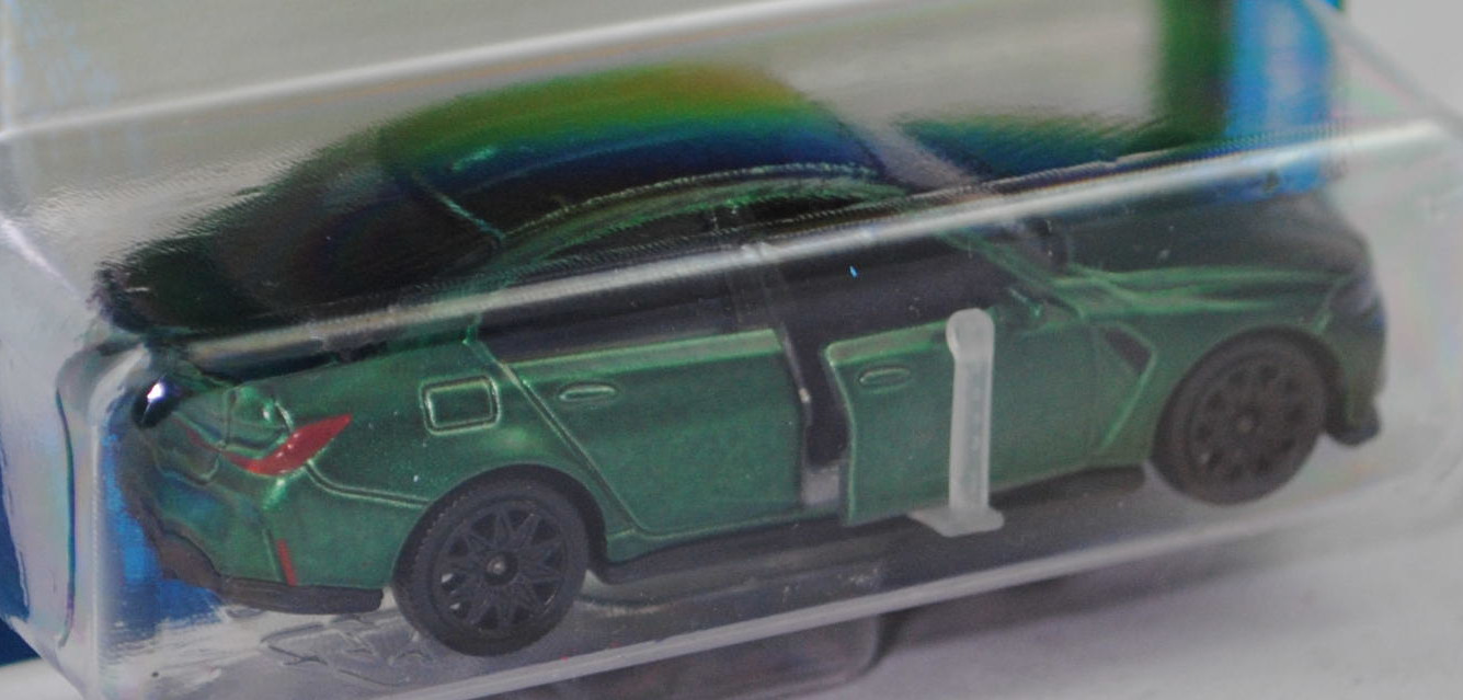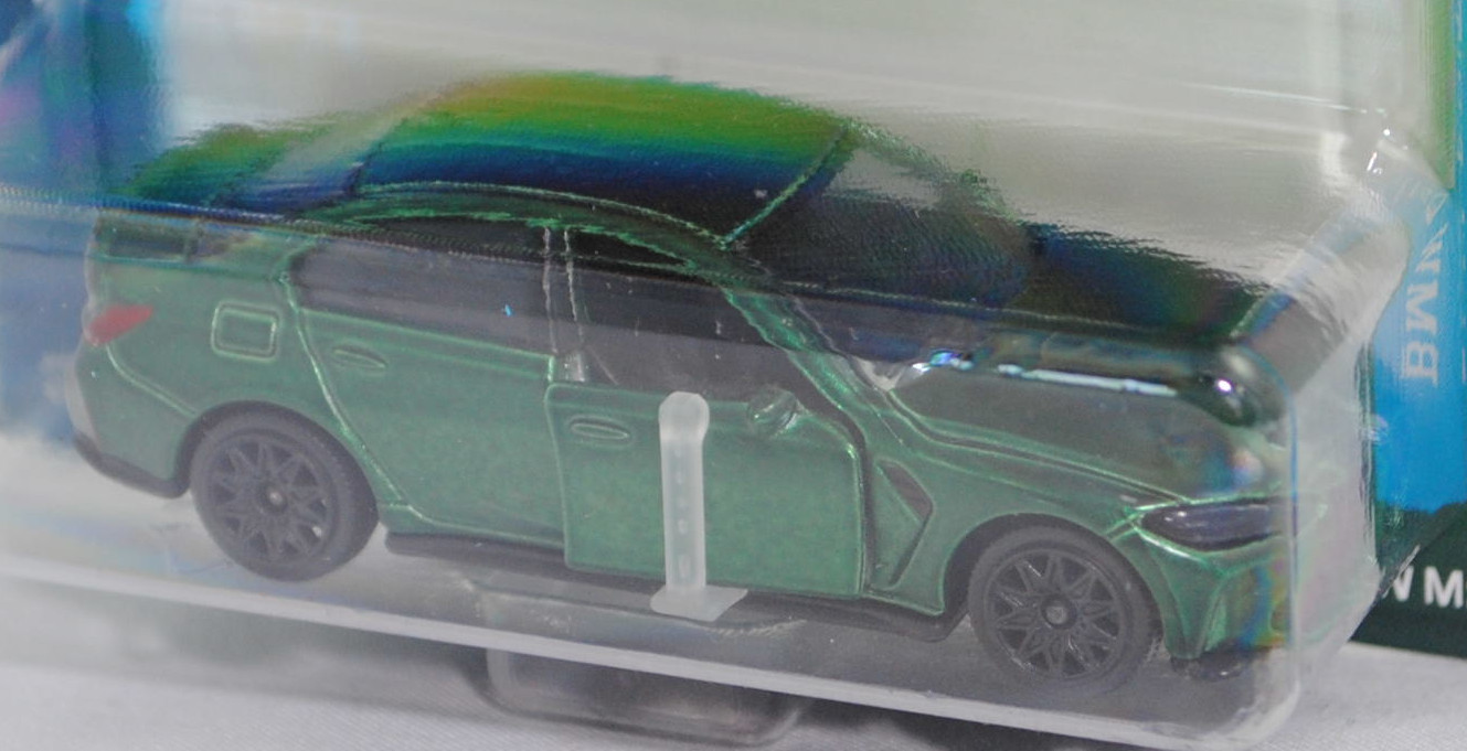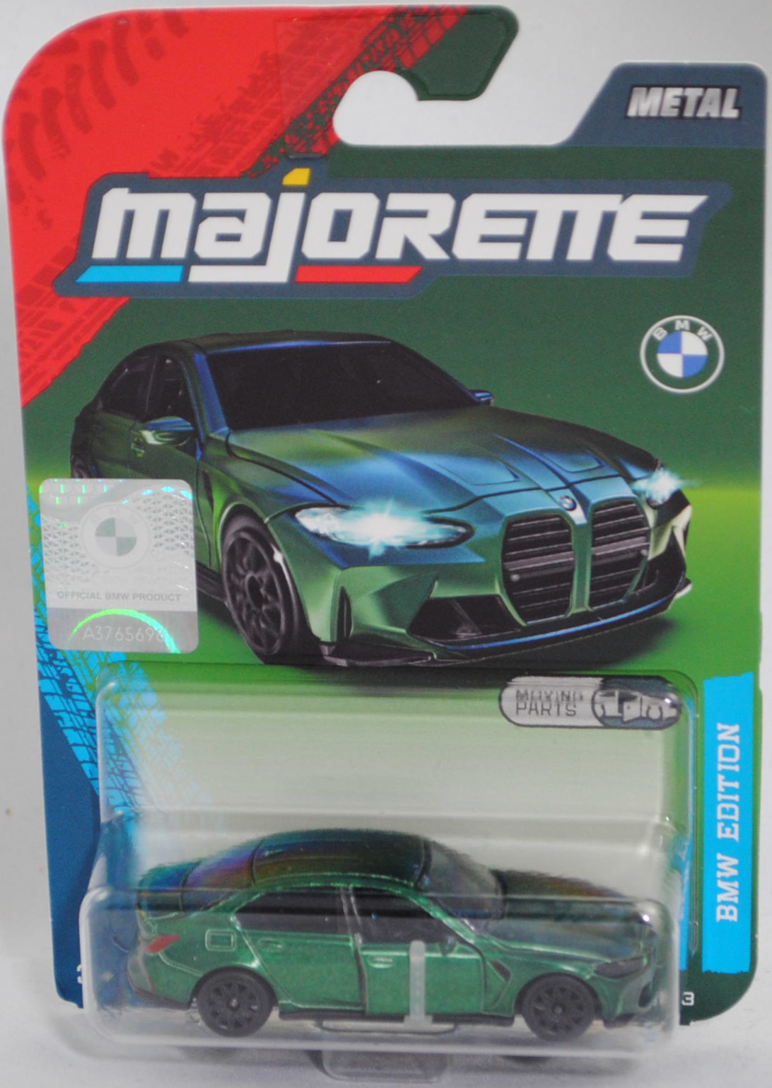 BMW M3 Limousine (6. Generation M3 bzw. 7. Generation 3er-Reihe, Baureihe M3, interne Baureihenbezeichnung G80, viertürige Sportlimousine mit Stufenheck und 5 Sitzplätzen, Ausstattungslinie M3 Limousine: LED-Scheinwerfer + M Leichtbaudach aus Carbon (CFK) in Sichtcarbon-Optik hochglänzend lackiert + M-Kieme in Seitenwand vorne in schwarz matt / schwarz hochglänzend mit Modellschriftzug in chrom + M Außenspiegel + M Servotronic + M Sportsitze mit Schalensitzcharakter und optisch integrierten Kopfstützen für Fahrer und Beifahrer + Interieurleisten schwarz hochglänzend mit Akzentleiste perlglanz chrom + Polsterung Leder Merino schwarz/schwarz + Innenspiegel automatisch abblendend + LED-Rückleuchten + adaptives M Fahrwerk + M Drive + M Sportdifferenzial + M Sportabgasanlage, Sonderausstattung gegen Mehrpreis: M Carbon Exterieurpaket mit Luftleitelemente im vorderen Stoßfänger und Außenspiegelkappen sowie Diffusoreinsatz im hinteren Stoßfänger und Heckspoiler aus kohlefaserverstärktem Kunststoff (CFK) + M Hochglanz Shadow Line mit erweiterten Umfängen mit Außenspiegelkappen und Gurney in schwarz hochglänzend sowie Auspuffendrohrblenden in schwarzchrom + 19''/20'' M Schmiederäder im Doppelspeiche 826 M-Design in schwarz / MB, manuelles 6-Gang-Schaltgetriebe, Hinterradantrieb, Motor: BMW M Typ S58B30O1 wassergekühlter Sechszylinder-Reihen-Viertakt-Otto mit zwei Single-Scroll-Abgasturbolader und Benzindirekteinspritzung sowie zwei obenliegende Nockenwellen (DOHC = Double Overhead Camshaft) und 4 Ventile pro Zylinder sowie Ladeluftkühlung und 2993 cm³ sowie 480 PS, Radstand 2857 mm, Länge 4794 mm, Modell 2021-) (Nr. 257G), Karosserie und Dach hell-moosgrünmetallic (vgl. M Isle of Man grün metallic beim Original, Farbcode C4G), innen schwarz, Sitze schwarz, Lenkrad schwarz, Kühlergrill und Lufteinlassöffnungen schwarz, Druck BMW-Logo in schwarz/reinweiß/blau vor der Motorhaube und hinten mittig auf der Heckklappe, Druck Zierstreifen in rot/dunkelblau/hellblau (BMW Motorsport-Farben) und M3 in schwarz hinten rechts auf der Heckklappe, Heckspoiler hell-moosgrünmetallic, vordere Türen zu öffnen, 10-Y-Speichen-Felgen schwarz (BMW 19''/20'' M Schmiederäder im 10-Doppelspeiche 826 M-Design in schwarz / MB vorne Größe 9,5 J x 19 H2 ET 20 mit Lochkreis 5 x 112 (Teilenummer 36108093838, Farbcode jack black uni) und Nabendeckel / Radzierkappe (Ø 55 mm, Teilenummer 36136850834, BMW-Logo in blau/weiß mit Chromrand) sowie Reifen 275/35 ZR 19 100Y bzw. hinten Größe 10,5 J x 20 H2 ET 20 mit Lochkreis 5 x 112 (Teilenummer 36108093839, Farbcode jack black uni) und Nabendeckel / Radzierkappe (Ø 55 mm, Teilenummer 36136850834, BMW-Logo in blau/weiß mit Chromrand) sowie Reifen 285/30 ZR 20 99Y), majorette, 1:62, Blister (BMW EDITION PREMIUM CARS) (EAN 3467452079928)