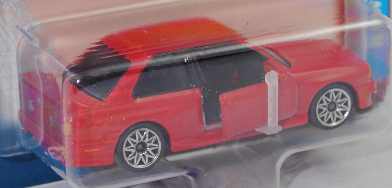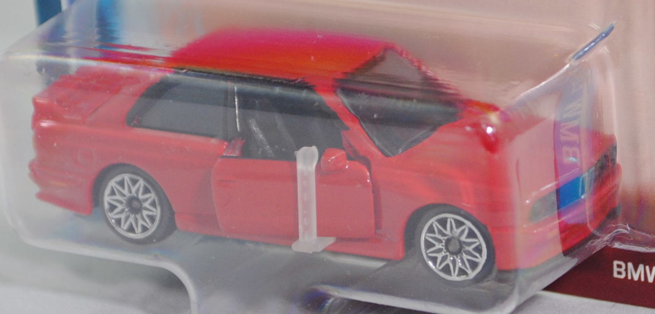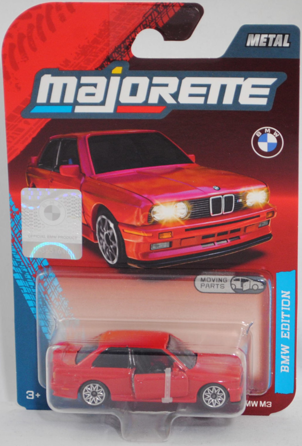 BMW M3 Sport Evolution (1. Generation M3 bzw. 2. Generation 3er-Reihe, Baureihe M3 Limousine, interne Baureihenbezeichnung E30, auch Evolution II genannt, zweitürige Stufenhecklimousine mit 4 Sitzplätzen, Hersteller: BMW M GmbH München, Ausstattungslinie M3 Sport Evolution: Kotflügelverbreitungen + einteilige Stoßfänger vorne und hinten + zusätzliche 3stufig verstellbare Lippe als Frontspoiler (Venturi-Spoiler) unter dem Stoßfänger + ohne Nebelscheinwerfer (dafür nun Luftkanäle zur Bremsenkühlung) + Schwellerverkleidungen + Karosserie im Bereich der Heckscheibe geändert (breitere und flachere C-Säule) sowie Heckscheibe flacher angesetzt + Erhöhung der Heckklappe um 7 cm + Heckklappe aus glasfaserverstärktem Kunststoff + Heckspoiler mit zusätzlicher 3stifig verstellbarer Lippe (im Rennsport Gurney Flap genannt) + 2,5-Liter Saugmotor mit 2467 cm³ und 238 PS sowie mit Katalysator + Außenspiegel rechts elektrisch vom Fahrer aus einstellbar inklusive Beheizung für beide Außenspiegel + Drehzahlmesser + M Technic Sport-Lederlenkrad Ø 380 mm inklusive Lederschaltknopf mit Rauhleder ummantelt + Servolenkung drehzahlabhängig geregelt + Kartenleseleuchte und Innenlichtautomatik + BMW M Technic Sportsitze für Fahrer und Beifahrer mit integrierten Kopfstützen in Länge, Höhe und Neigung verstellbar + Mittelbahnen der Sitze und Türverkleidungseinsätze mit Stoff im M Design in anthrzit (Code 0316) bezogen + Frontscheibe mit schmalem transparentem Grünkeil + Heck- und Seitenscheiben in Leichtbarweise + Ausstellfenster hinten + 2 Nebelschlussleuchten + Sperrdifferential 25% + Tankinhalt 62 Liter + Leichtmetallräder im Kreuzspeichen-Styling mit Felgenstern Größe 7,5 J x 16 mit Reifen 225/45 ZR 16, gebaute Fahrzeuge 600 Stück, 5-Gang-Schaltgetriebe, Hinterradantrieb, Motor: BMW Typ S14 B25 wassergekühlter Vierzylinder-Reihen-Viertakt-Otto mit Saugrohreinspritzung und zwei obenliegende Nockenwellen (DOHC = Double Overhead Camshaft) sowie 4 Ventile pro Zylinder und 2467 cm³ sowie 238 PS (mit Katalysator), Radstand 2565,5 mm, Länge 4345 mm, Modell 1990-1990) (Nr. 257F), signalrot (vgl. brillantrot uni beim Original, Farbcode 308), innen schwarz, Sitze schwarz, Lenkrad schwarz, Kühlergrill schwarz mit Druck BMW-Niere in silber, Druck Zierstreifen in rot/dunkelblau/hellblau (BMW Motorsport-Farben) und M in silber links im Kühlergrill, Druck BMW-Logo in schwarz/reinweiß/blau vorne auf der Motorhaube und hinten mittig auf der Heckklappe, Frontspoiler schwarz in Normalstellung, Heckspoiler signalrot flach in Monza-Stellung, Türen zu öffnen, 10-Y-Speichen-Felgen in chrom (BMW Leichtmetallräder im Kreuzspeichen-Design Typ Styling 5 (Hersteller BBS) mit Felgenstern Größe 7,5 J x 16 ET 27 mit Lochkreis 5 x 120 (Teilenummer 36 11 2 225 621, Farbcode 144 noragosilber) und Nabendeckel / Radzierdeckel (Teilenummer 36 13 2 226 806, Farbcode 144 noragosilber mit BMW-Emblem in schwarz/weiß/blau) sowie Reifen 225/45 ZR 16 92Z), majorette, 1:58, Blister (BMW EDITION PREMIUM CARS) (EAN 3467452079928)
