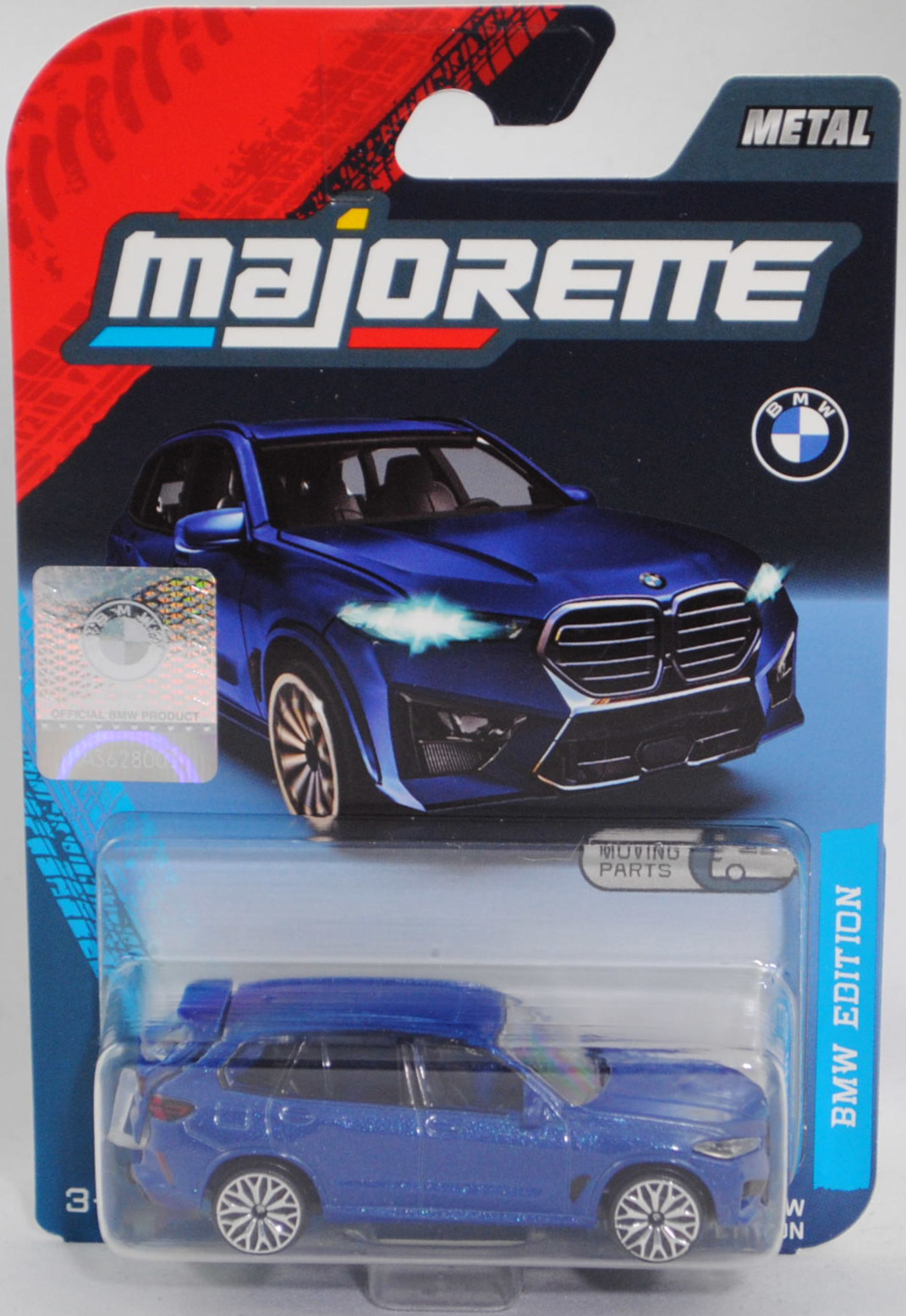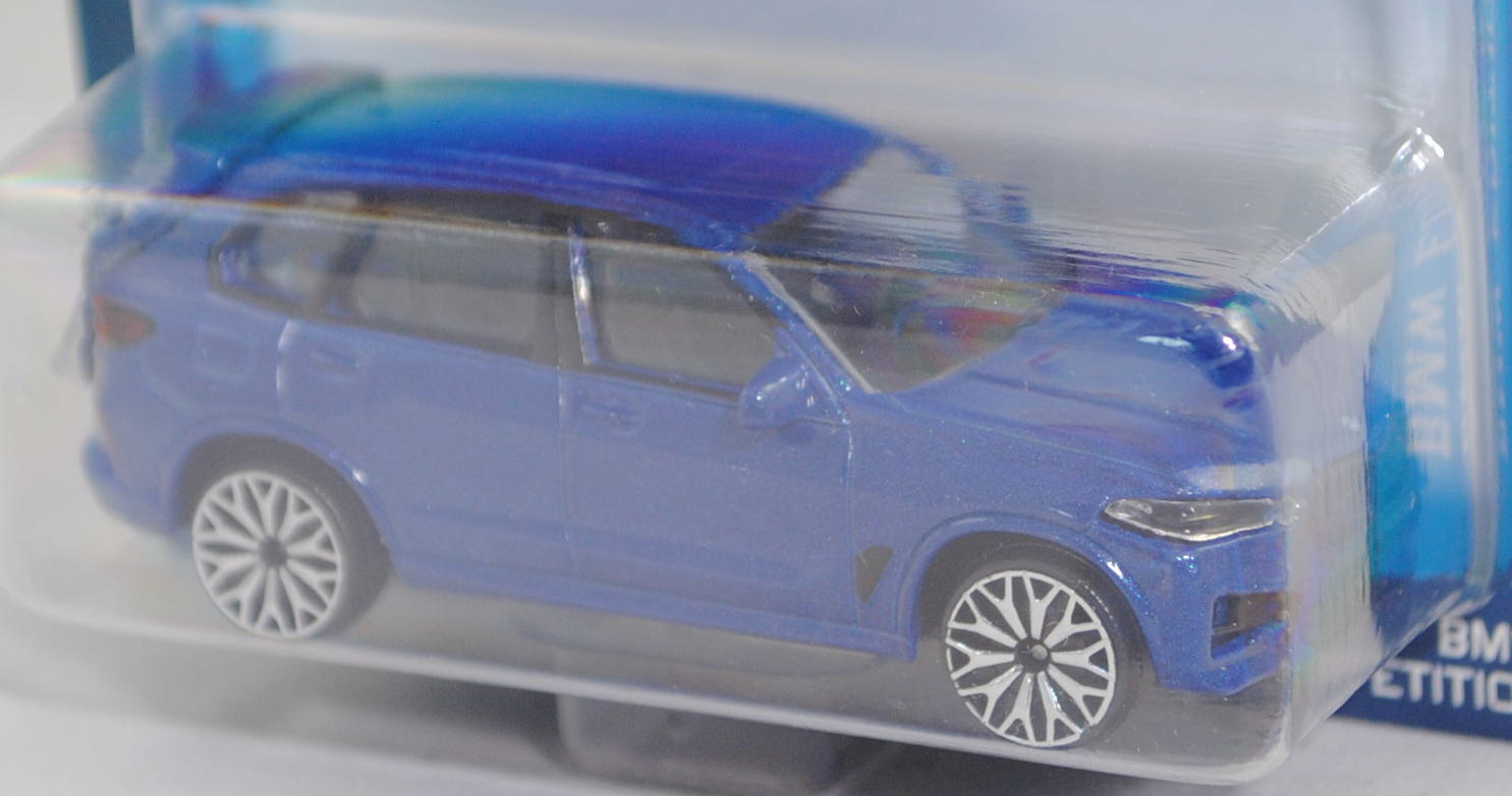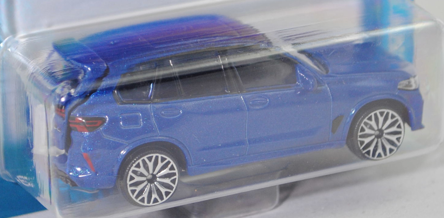 BMW X5 M Competition (4. Generation X5, Baureihe X5 M, interne Baureihenbezeichnung F95, fünftüriger SUV (Sport Utility Vehicle) mit 5 Sitzplätzen, LCI (Life Cycle Impulse / Facelift) 2023 zum Modelljahr 2024, schwarze BMW-Niere im Kühlergrill mit 4 waagerechten Streben, zentrale Luftzufuhr mittig im Stoßfänger vorne unter der BMW-Niere, um 35 mm flachere Frontscheinwerfer mit gerade verlaufender Unterseite, Tagfahrlicht-Design mit nach außen weisenden Pfeilen, Rückleuchten mit stilisierter X-Grafik, Ausstattungslinie X5 M Competition: adaptiver LED-Scheinwerfer + M Kieme + M TwinPower Turbo V8-Zylinder-Benzinmotor mit 4395 cm³ und 625 PS + M spezifische Außenspiegel + M Dachreling hochglanz shadow line + Sonnenschutzverglasung + BMW Individual Instrumententafel lederbezogen + Interieurleisten Edelholzausführung Fineline schwarz mit Metalleffekt hochglanz + M Lederlenkrad mit Schaltwippen + M Servotronic + M Funktionssitze mit elektrischer Sitzverstellung und Memory sowie Sitzheizung für Fahrer und Beifahrer + Lordosenstütze + Vollleder merino schwarz + M Sicherheitsgurte + M Heckspoiler + Heckklappe zweigeteilt + M Sportabgasanlage + M xDrive + adaptives M Fahrwerk Professional + M Sportdifferenzial + 21''/22'' M Leichtmetallräder Sternspeiche 818 M Bicolor mit Mischbereifung vorne 10,5 J x 21 mit Bereifung 295/35 R 21 und hinten 11,5 J x 22 mit Bereifung 315/30 R 22, Sonderausstattung gegen Mehrpreis: TRAVEL PAKET mit Panorama-Glasdach bzw. ULTIMATE PAKET mit Panorama-Glasdach Sky Lounge, 8-Gang Sport Automatic Getriebe mit Drivelogic, Allradantrieb, Motor: BMW Typ S63B44A wassergekühlter Achtzylinder-V-Viertakt-Otto mit M TwinPower Turbo und Benzindirekteinspritzung sowie zwei obenliegende Nockenwellen (DOHC = Double Overhead Camshaft) je Zylinderbank und 4 Ventile pro Zylinder sowie Ladeluftkühlung und 4395 cm³ sowie 625 PS, zusätzlicher Elektromotor im Getriebegehäuse als Permanentmagnet-Synchronmaschine (PMSM bzw. PSM) (MHEV = Mildhybrid-Elektrofahrzeug) mit 12 PS, Lithium-Ionen-Batterie mit Batteriekapazität 0,96 kWh brutto (0,84 kWh netto), Radstand 2972 mm, Länge 4948 mm, Modell 2023-) (Nr. 244H), Karosserie hell-kobaltblaumetallic (vgl. ähnlich marina bay blue metallic beim Original, Farbcode B51), innen schwarz, Sitz schwarz, Lenkrad schwarz, Kühlergrill und Lufteinlassöffnungen schwarz, Druck BMW-Logo in schwarz/reinweiß/blau vor der Motorhaube und hinten mittig auf der Heckklappe, Druck X5 M in schwarz und Zierstreifen in rot/dunkelblau/hellblau (BMW Motorsport-Farben) sowie competition in silber hinten rechts auf der Heckklappe, Heckklappe zu öffnen, 10-Y-Speichen-Felgen in chrom (BMW 21''/22'' M Leichtmetallräder Sternspeiche 818 M Bicolor mit Mischbereifung vorne 10,5 J x 21 ET 31 mit Lochkreis 5 x 112 (Ausstattungscode 1TF, Teilenummer 8093563, Farbcode jetblack glanzgedreht) und Nabendeckel / Radzierkappe (Ø 55 mm, Teilenummer 36136850834, BMW-Logo in blau/weiß mit Chromrand) sowie Reifen 295/35 R 21 107V bzw. hinten 11,5 J x 22 ET 43 mit Lochkreis 5 x 112 (Ausstattungscode 1TF, Teilenummer 8093564, Farbcode jetblack glanzgedreht) und Nabendeckel / Radzierkappe (Ø 55 mm, Teilenummer 36136850834, BMW-Logo in blau/weiß mit Chromrand) sowie Reifen 315/30 R 22 107V), majorette, 1:64, Blister (BMW EDITION PREMIUM CARS) (EAN 3467452079928)