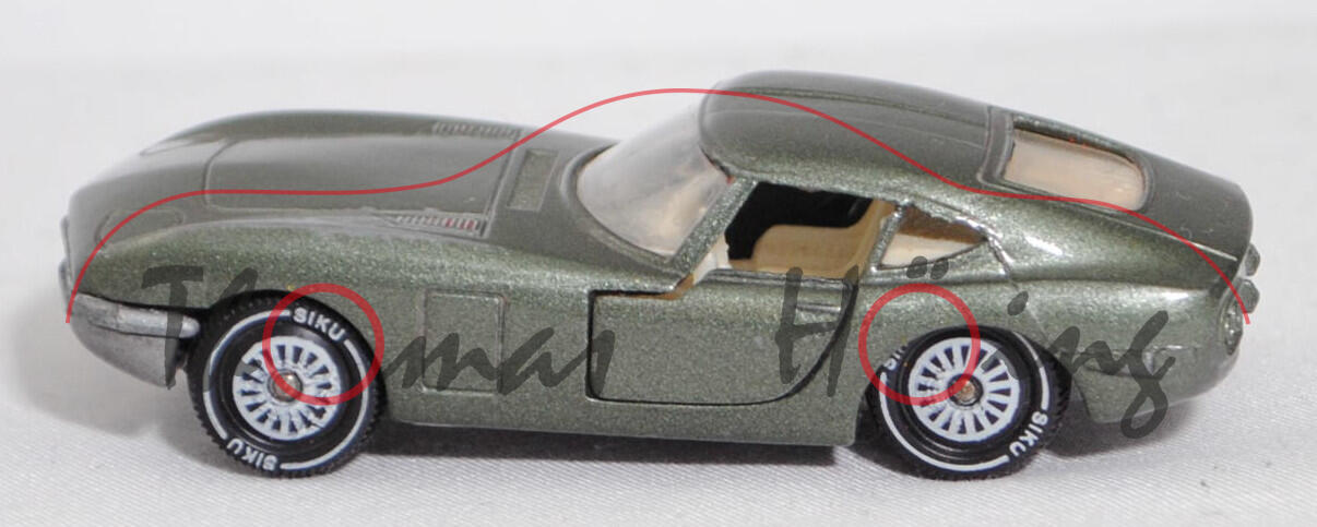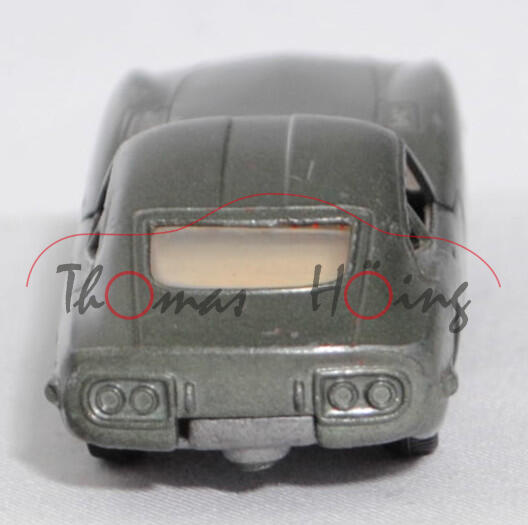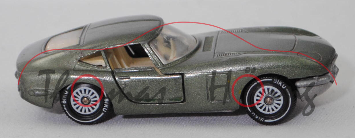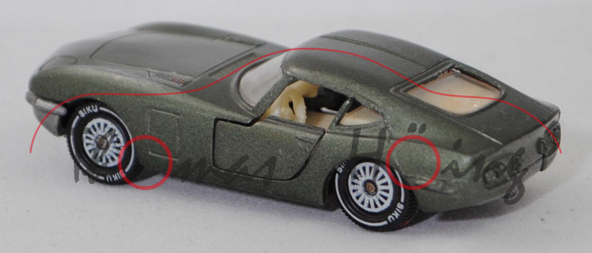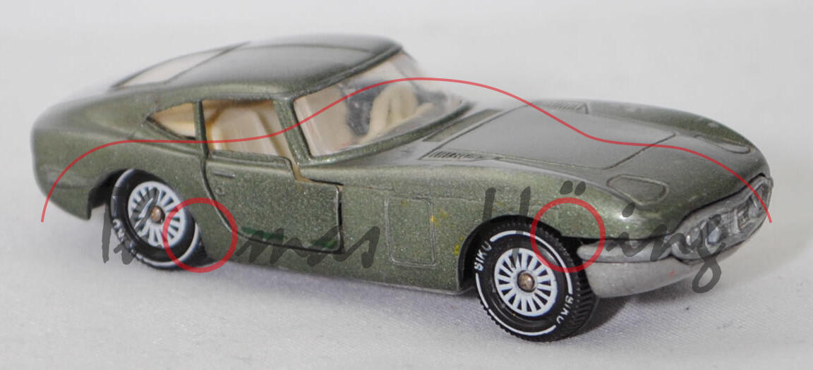 BR Toyota 2000 GT (1. Generation, Baureihe 2000 GT, interne Baureihenbezeichnung MF-10, zweitüriger Sportwagen als Coupé mit 2 Sitzplätzen, Facelift 1969, Kühlergrill mit integrierten verkleinerten Frontscheinwerfern, große Blinker hinten auf den Kotflügeln, Dachpartien über Fahrer und Beifahrer ausgewölbt (Double-Bubble-Dachform), Ausstattungslinie 2000 GT: Klappscheinwerfer + Nebelscheinwerfer an beiden Seiten der Lufteinlässe + Armaturenbrett mit dicker Polsterung und mit Holzmaserung verziert + in der Länge verstellbare Lenksäule + um 14 cm vor- und zurückstellbare Schalensitze mit verstellbaren Rückenlehnen + Zahnstangenlenkung + 5-Gang-Schaltgetriebe mit Schalthebelknauf aus Holz + Rückspiegel durch Drehkopf zwischen Tag- und Nachtmodus umstellbar + Scheibenbremsen an allen vier Rädern + rote Reflektoren an den Außenseiten der Kotflügel + Heckscheibe mit beheiztem Glas + verchromte Doppelauspuffendrohre + Räder aus Magnesiumlegierung mit Zentralverschluss, Entwicklung in Zusammenarbeit mit Yamaha Motor Company in Hamamatsu, Produktion bei Yamaha in Iwata, synchronisiertes 5-Gang-Schaltgetriebe als Mittelschaltung, Hinterradantrieb, Motor: Yamaha auf Basis Toyota Typ 3M wassergekühlter Sechszylinder-Reihen-Viertakt-Otto mit 3 Solex Mikuni Flachstrom-Doppelvergaser Typ 40 PHH und zwei obenliegende Nockenwellen (DOHC = Double Overhead Camshaft) sowie 2 hängende Ventile pro Zylinder und 1988 cm³ sowie 150 PS, Radstand 2330 mm, Länge 4175 mm, Modell 1969-1970), dunkel-olivgrünmetallic, innen cremeweiß, Sitze cremeweiß, Lenkrad cremeweiß, Bpr. PR.Z.F.MANAUS I.BRAS., R11 gerillt (Toyota Magnesiumräder im 10-Loch-Design Größe 6 J x 15 mit Zentralverschluss und Radzierkappen / Nabendeckel sowie Reifen 165 HR 15), SIKU Brasilien / MINIATURAS REI, ca. 1:60, m- (Limited Edition / BRAZIL SPECIAL) (Vitrinenmodell, minimale Lackfehler) (EAN 4006874003167)