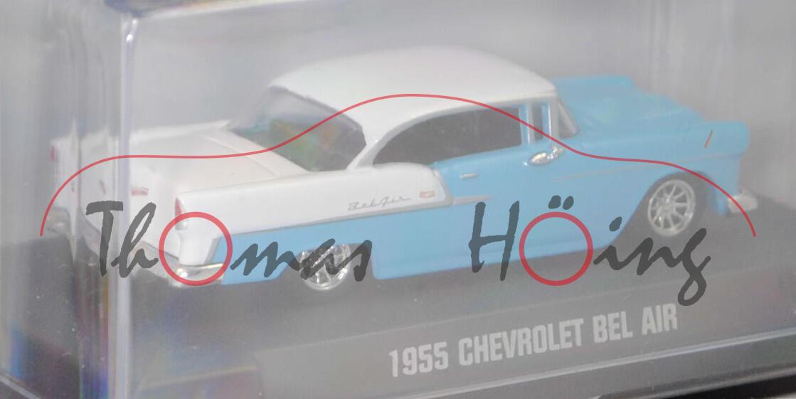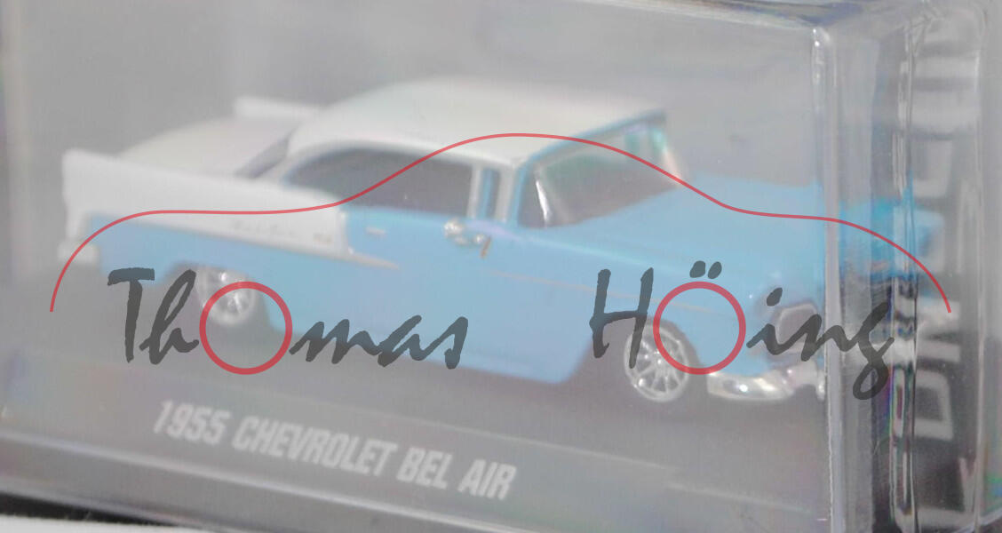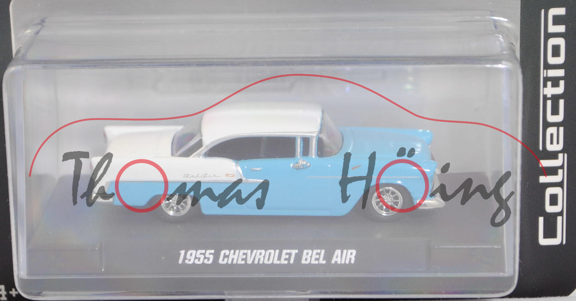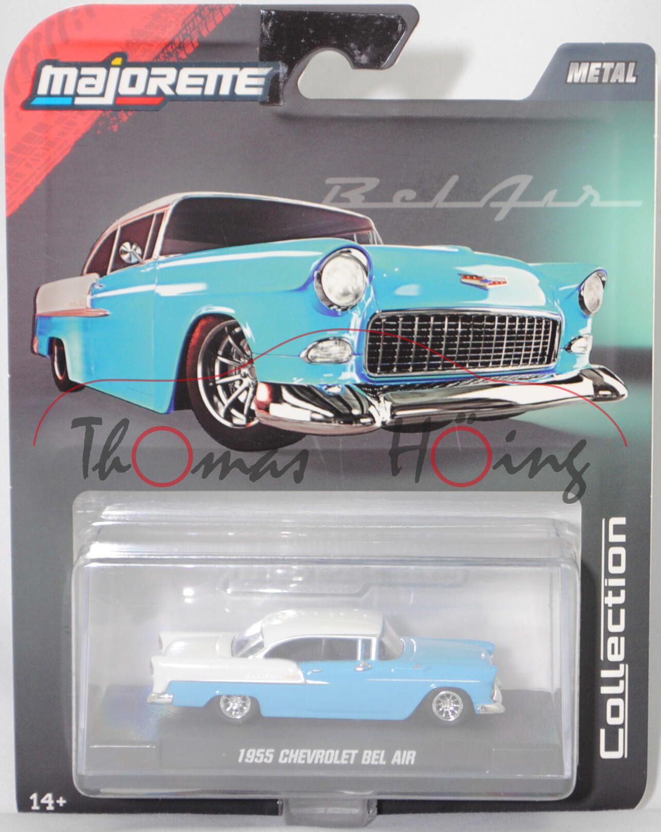 Chevrolet Bel Air Sport Coupé (2. Generation, Baureihe Bel Air Series, zweitüriges Coupé mit 6 Sitzplätzen, Vorfacelift, Kühlergrillbreite optisch zwischen die Frontscheinwerfer gesetzt, Kühlergrill mit rechteckigen Gittern, ovale Blinker vorne neben dem Kühlergrill, Panorama-Windschutzscheibe (bei Chevrolet Sweep-Sight Windshield genannt), zwei waagerechte Chromzierleisten auf den Seiten die auf den Türen höhenmäßig versetzt verlaufen, Druckknopf im Türgriff nach unten verlegt, separates Türschloss unterhalb des Türgriffes angebracht, Instrumente in der Armaturentafel in Form eines Kreisabschnittes, Handschufach mittig in der Instrumententafel, Rückleuchten in der oberen Hälfte der Kotflügel, Ausstattungslinie Sport Coupé: ohne B-Säule + luxesiöser zweifarbiger Innenraum + mit Innenteppich + Fensterleisten aus Edelstahl + Radkappen aus Edelstahl, 3-Gang-Synchrongetriebe mit selektiver Gangschaltung und Schalthebel an der Lenksäule, Hinterradantrieb, Motor: Chevrolet Typ Blue Flame 123 L6 (mit 235,5 cu) wassergekühlter Sechszylinder-Reihen-Viertakt-Otto mit Vergaser und eine zentrale Nockenwelle sowie OHV-Ventilsteuerung (Overhead valve engine) und 2 Ventile pro Zylinder sowie 3859 cm³ und 123 PS bzw. Chevrolet Typ Turbo-Fire V-8 (small Block mit 265 cu) wassergekühlter Achtzylinder-V-Viertakt-Otto mit Doppelvergaser und eine zentrale Nockenwelle sowie OHV-Ventilsteuerung (Overhead valve engine) und 2 Ventile pro Zylinder sowie 4343 cm³ und 162 PS, Radstand 2921 mm, Länge 4968 mm, Modell 1954-1955), Karosserie vorne blass-lichtblau sowie Dach und Karosserie hinten reinweiß (vgl. Zweifarbenlackierung regal turquois (Farbcode 11328-DQE / 598) / india ivory (Farbcode 8026-DQE / 593) beim Original), innen schwarz, Sitze schwarz, Lenkrad schwarz, 10-Speichen-Felgen in chrom (Chevrolet Stahlscheibenräder Typ Bel Air Größe 5 J x 14 ET 14.2 mit Lochkreis 5 x 120,65 und Niederdruckreifen 7.50-14 sowie verchromte Radkappen), majorette, 1:64, PC-Box im Blister (Collection) (EAN 3467452078679)