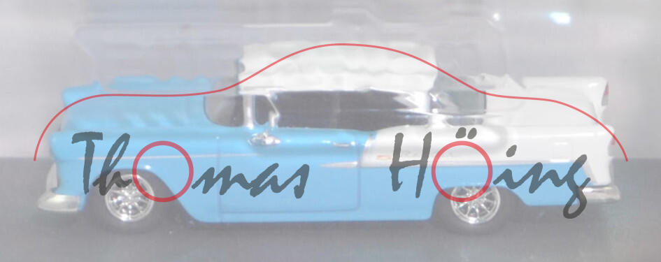 Chevrolet Bel Air Sport Coupé (Modell 1954-1955), blass-lichtblau/reinweiß (regal turquois / india ivory), majorette, 1:64, PC-Box im Blister (Collection)