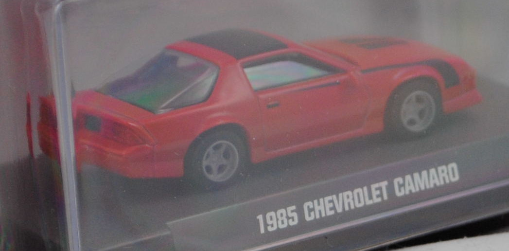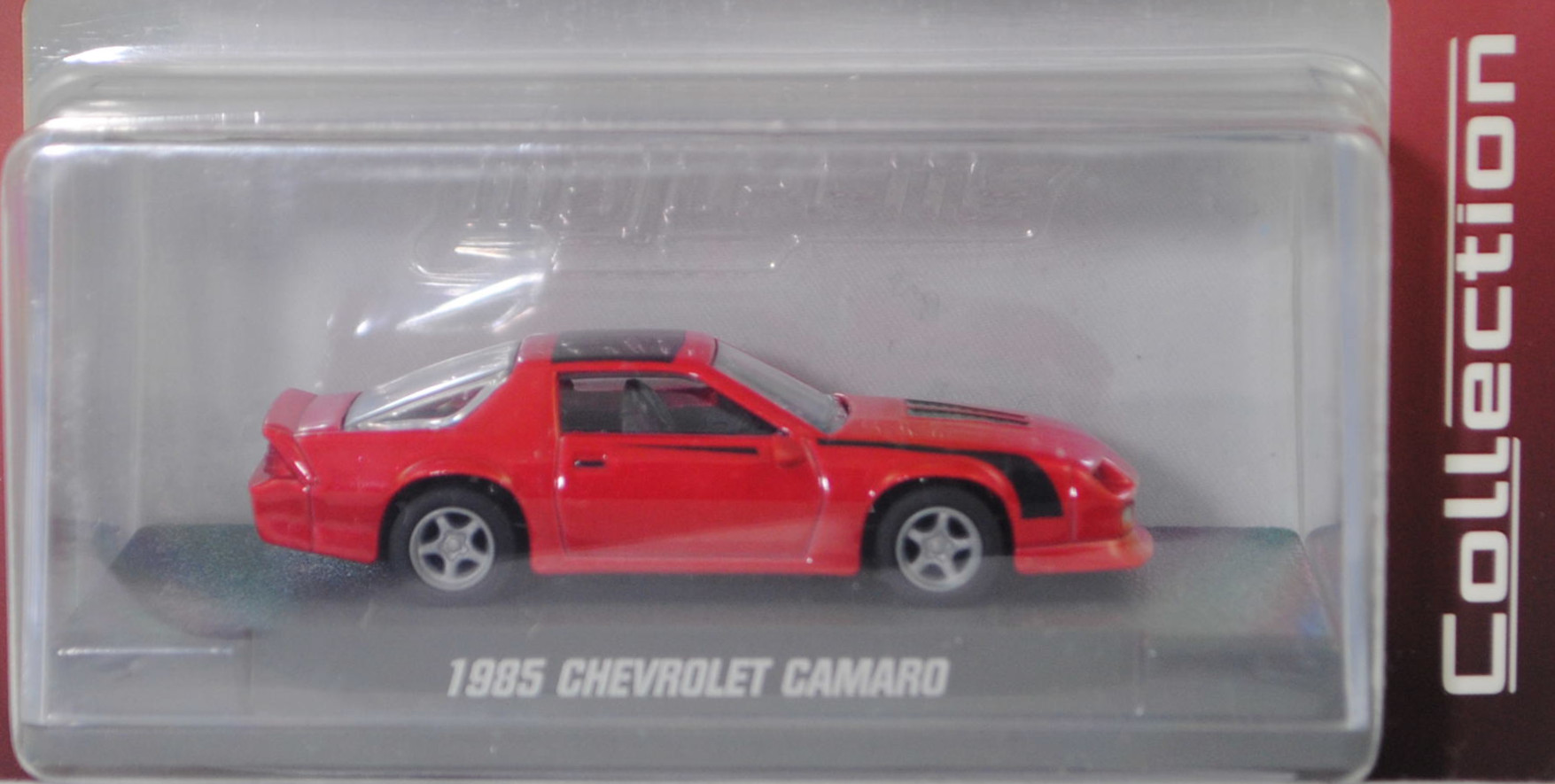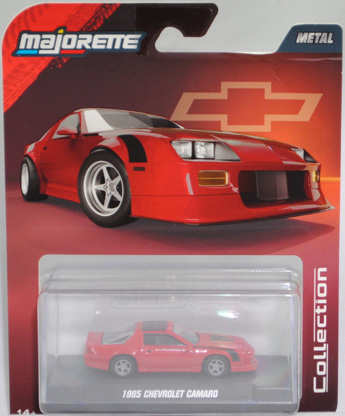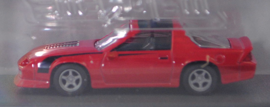 Chevrolet Camaro IROC-Z (3. Generation, Baureihe Camaro, F-Body-Plattform der 3. Generation, IROC-Z = International Race of Champions Optionspaket für den Z28, zweitüriger Sportwagen als Coupé mit 4 Sitzplätzen, Facelift 1984 zum Modelljahr 1985, Frontschürze tief heruntergezogen, große Lüftungsöffnung mittig in der Frontschürze, analoge Geschwindigkeitsanzeige in der Instrumententafel, weitere Änderung 1986 zum Modelljahr 1987, Geschwindigkeitsanzeige bis 145 Meilen pro Stunde bzw. 240 km/h, 3. Bremsleuchte mittig in den Heckspoiler integriert, Ausstattungslinie Z28 mit Optionspaket IROC-Z, Ausstattungslinie Z28: mit zusätzlichem Frontspoiler und Schwellerschürzen sowie Heckschürze + große breite Lüftungsschlitze im vorderen Stoßfänger ohne Nebelscheinwerfer + Motorhaube mit 2 zusätzlichen Aussparungen und Lamellen als Lufteinlässe + dreiteiliger Heckspoiler + Schriftzug Z28 hinten rechts auf dem Stoßfänger + Fünfspeichen Aluminiumräder, Optionspaket IROC-Z: Halogen-Nebelscheinwerfer + Karosserieteile und Heckspoiler im Grounds-effects-Style + spezielle Rundinstrumente + dickes lederbezogenes Lenkrad + AM-Radio mit Digitaluhr + Sportspiegel + spezielle Streifen und farblich abgestimmte IROC-Z Türaufkleber + Heckspoiler mit integrierter hochgesetzter Bremsleuchte + MacPherson Federbeine an der Vorderachse + Delco Bilstein Gasdruckstoßdämpfer an der Hinterachse + verstaubares Reserverad + zusätzlicher Schriftzug TUNED PORT INJECTION hinten auf dem Stoßfänger, Sonderausstattung gegen Mehrpreis: zwei extra herausnehmbare Dachhälften (T-Top), 5-Gang-Schaltgetriebe, Hinterradantrieb, Motor: General Motors-Chevrolet Motor Division Typ 5.0 Liter (305 cu in) V8 (Turbo-Fire V-8, Small Block mit 305,2 cui, Bestellcode LB9) wassergekühlter Achtzylinder-V-Viertakt-Otto mit Mehrpunkteinspritzung (TPI = Tuned Port Injection) und eine zentrale Nockenwelle sowie OHV-Ventilsteuerung (OHV = overhead valves) und 2 Ventile pro Zylinder sowie 5001 cm³ und 215 PS, Radstand 2565 mm, Länge 4877 mm, Modell 1987-1988), bright red (Farbcode WA8774), innen schwarz, Sitze schwarz, Lenkrad schwarz, Druck Streifen in schwarz auf den Seiten vom vorderen Kotflügel bis zum Ende der Tür, Druck herausnehmbare Dachhälften (T-Top) schwarz, Druck Aussparungen in der Motorhaube schwarz, Chevrolet Aluminiumfelgen im 5-Speichen-Design Größe 8 J x 16 ET 20 mit Lochkreis 5 x 120,65 (Teilenummer 14089081, Farbcode silber) und Nabendeckel / Radzierdeckel (Teilenummer 14080273, Farbcode schwarz mit Schriftzug IROC-R in silber) sowie Goodyear Eagle GT Reifen P245/50 VR 16, majorette, 1:64, PC-Box im Blister (Collection) (EAN 3467452078747)