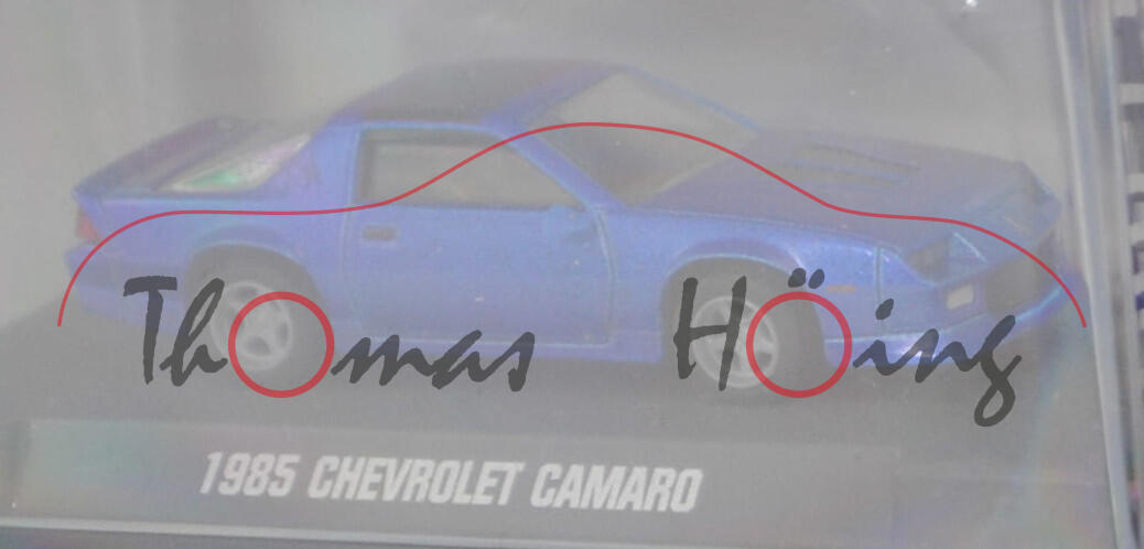 Chevrolet Camaro Z28 (3. Generation, Baureihe Camaro, F-Body-Plattform der 3. Generation, zweitüriger Sportwagen als Coupé mit 4 Sitzplätzen, Vorfacelift, Überarbeitung 1984 zum Modelljahr 1985, Frontschürze tiefer heruntergezogen, Spritzwasserdüsen an den Wischerblättern, Tachometer für die Anzeige der Geschwindigkeit als Rundinstrument mit Anzeige bis 85 Meilen pro Stunde und gleichzeitigem Ausweis in km/h bei 7 Geschwindigkeiten darunter, ohne 3. Bremsleuchte oben auf der Heckscheibe, Ausstattungslinie Z28: mit zusätzlichem Frontspoiler und Schwellerschürzen sowie Heckschürze + große breite Lüftungsschlitze im vorderen Stoßfänger ohne Nebelscheinwerfer + Motorhaube mit 2 zusätzlichen Aussparungen und Lamellen als Lufteinlässe + dreiteiliger Heckspoiler + Schriftzug Z28 hinten rechts auf dem Stoßfänger + Fünfspeichen Aluminiumräder, 5-Gang-Schaltgetriebe, Hinterradantrieb, Motor: General Motors-Chevrolet Motor Division Typ 5.0 Liter 4-Bbl. V8 (Turbo-Fire V-8, Small Block mit 305,2 cui, Bestellcode LG4) wassergekühlter Achtzylinder-V-Viertakt-Otto mit einem Fallstrom-Doppel-Registervergaser Rochester E4ME-4 barrel und eine zentrale Nockenwelle sowie OHV-Ventilsteuerung (OHV = overhead valves) und 2 Ventile pro Zylinder sowie 5001 cm³ und 155 PS, Radstand 2565 mm, Länge 4770 mm, Modell 1984-1985), signalblaumetallic (vgl. bright blue metallic beim Original, Farbcode 30E / WA8587), innen schwarz, Sitze schwarz, Lenkrad schwarz, 5-Speichen-Felgen in silbergrau (Chevrolet 5-Speichen Aluminiumräder Größe 7 J x 15 ET 8 mit Lochkreis 5 x 120,65 (Teilenummer 14035346, Farbcode silber) und Nabendeckel / Radzierdeckel (Teilenummer 14085595, Farbcode schwarz mit Schriftzug Z28 in silber) sowie Reifen P215/65 R 15), majorette, 1:64, PC-Box im Blister (Collection) (EAN 3467452078716)