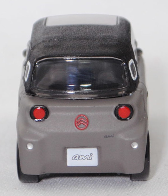Citroen ami icy (1. Generation, Baureihe ami, Projektcode 9A, interne Baureihenbezeichnung 9AZ2CA, zweitüriges elektrisches Leichtkraftfahrzeug (Lkfz) mit Schrägheck und 2 Sitzplätzen, BEV (Battery Electric Vehicle), Phase 2 / Facelift 2024 zum Modelljahr 2025, höher positionierte LED-Scheinwerfer mit schwarzer Umrandung vorne und hinten, neues ovales Citroen-Markenlogo, einteilige Front- und Heckpartie, Kotflügel vorne und hinten mit zusätzlichen Ausbuchtungen (auch Striations genannt) als Hommage an den Citroen 2CV, Panorama-Glasdach serienmäßig, Ausstattung Basis: LED-Scheinwerfer vorne und hinten + LED-Blinker + Außenfarbe night sepia + rotes Citroen-Logo vorne und hinten + Außenspiegel manuell verstellbar + 3,9''-Digitaldisplay + Heizung und Front Defroster + 1 USB-Ladeanschluss + Automatikgetriebe + Fahrersitz mit manueller Längsverstellung + Beifahrersitz fest + Sitzpolster Mistral schwarz + Seitenfenster nach oben aufklappbar + Panorama-Glasdach + integriertes Ladekabel für Haushaltssteckdosen + 14 Zoll Stahlfelgen in schwarz, Ausstattungslinie icy gegen Mehrpreis: 2 Türschwelleraufkleber in weiß banquise / polarweiß + 3 Aufbewahrungsboxen für das Armaturenbrett in weiß banquise / polarweiß + 2 Tür-Aufbewahrungsnetze mit weiß banquise / polarweißfarbenen Band + 1 zentrales Trennnetz + 1 Taschen-Haken in weiß banquise / polarweiß + 1 Smartphone-Halter + 1 Myami Play App zur Bereicherung jeder Fahrt + 1 My Connect Box, um dein Smartphone mit dem ami zu verbinden + 2 Fußmatten mit weiß banquise / polarweißfarbener Ziernaht + 2 Heckscheibenaufkleber in weiß banquise / polarweiß + 4 Radzierblenden in weiß banquise / polarweiß, 1-Gang Reduktionsgetriebe als Automatikgetriebe, Frontantrieb, Motor: permanenterregte Synchronmaschine (PSM) Typ Valeo IBSG über der Vorderachse mit 8 PS (Motorcode Z2CA) und Lithium-Ionen-Batterie (Li-NMC = Lithium-Nickel-Mangan-Cobalt) mit Batteriekapazität 7,0 kWh brutto bzw. 5,4 kWh netto, Radstand 1728 mm, Länge 2460 mm, Modell 2025-), Karosserie night sepia, Dach schwarz, innen schwarz, Sitze schwarz, Lenkrad schwarz, Citroen 14-Zoll Stahlfelgen im 14-Loch-Design Größe 5,5 J x 14 ET 34 mit Lochkreis 4 x 108 (Teilenummer 98373645ZY, Farbcode schwarz) und Reifen 155/65 R 14 79 T sowie Radzierblenden (Teilenummer 6500351580, Farbcode weiß banquise / polarweiß), Norev, ca. 1:52, mb (EAN 3551093109899)