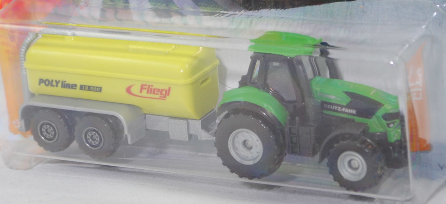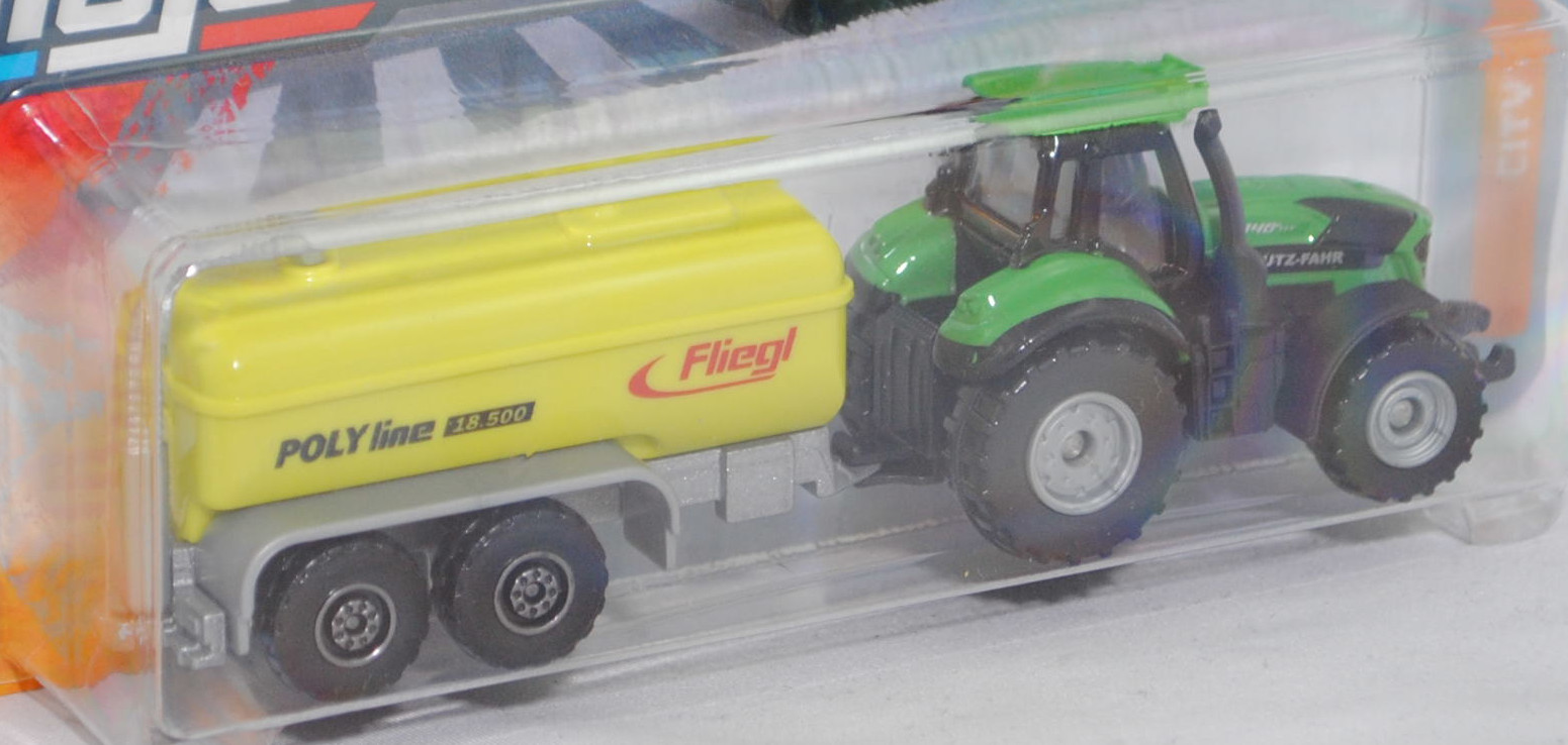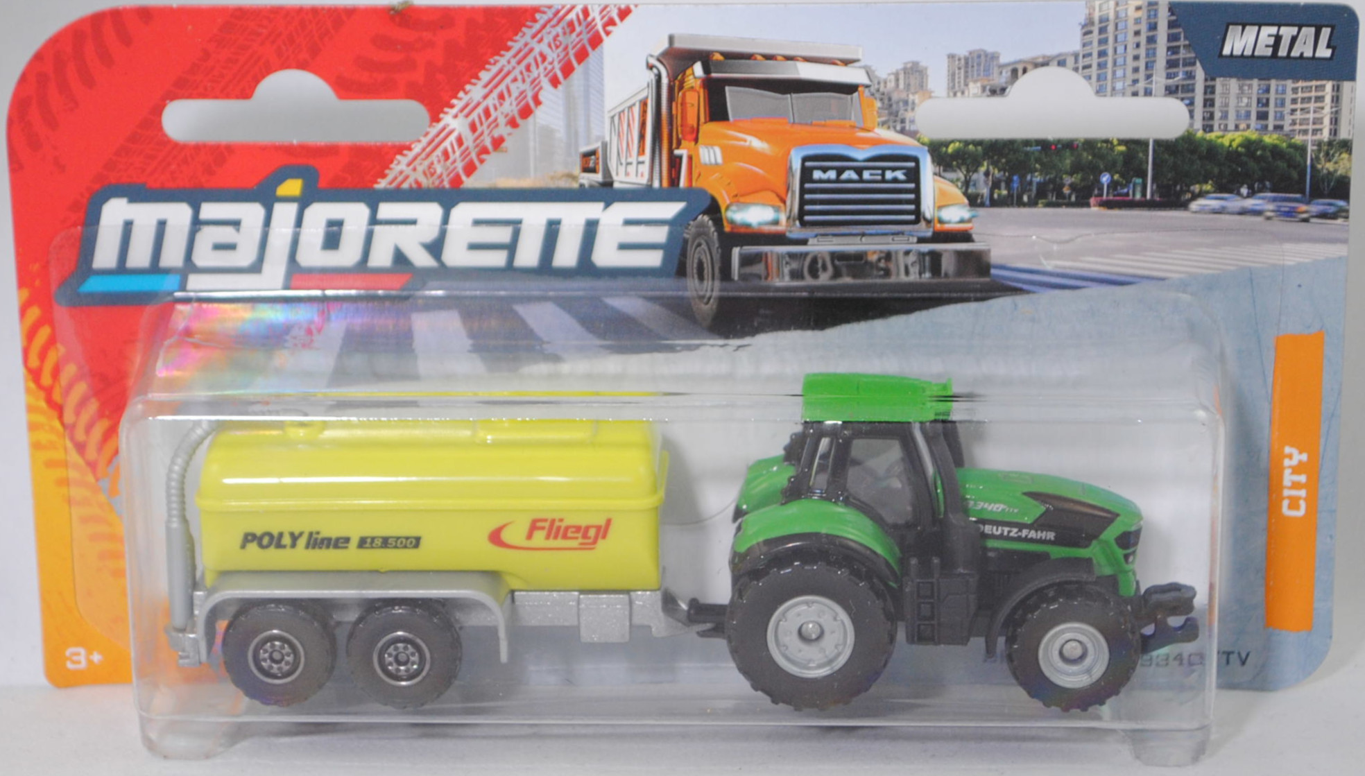 DEUTZ-FAHR 9340 TTV Agrotron (1. Generation, Baureihe Serie 9, Vorfacelift, MaxiVision-Kabine II, Motoren mit Abgasstufe Stage IV bzw. Tier 4 final, Fahrerkabine mit Terminal iMonitor2, Agrosky Reciever auf einem Podest oben am Dach der Kabine, ohne Schriftzug DEUTZ-FAHR oben am Dach der Kabine zwischen den LED-Scheinwerfern, Ausstattungslinie 9340: MaxiVision-Kabine II + Freisichtdach + Halogenarbeitsscheinwerfer + pneumatische Federung + einstellbare Rückspiegel + Klimaanlage + Multifunktionsarmlehne MaxCom + Multifunktions-Joystick + WorkMonitor + gepolsterter Beifahrersitz + gefederte Vorderachse + elektrohydraulische Allradzuschaltung + elektrohydraulische Differentialsperre 100% + Bremsanlage mit Allrad-Zuschaltung + Bremskraftverstärker (PowerBrake) + elektrische Feststellbremse (EPB) + Dieseltankinhalt 600 Liter + AdBlue®-Tankinhalt 55 Liter + Frontkraftheber + automatische Anhängekupplung + Heckkraftheber elektronisch, Leergewicht 12000 kg, zulässiges Gesamtgewicht 18000 kg, stufenloses ZF Terramatic TMT 32 Getriebe, Allradantrieb, Motor: Deutz AG Typ TTCD 7.8 L06 mit Abgasstufe Tier 4 final wassergekühlter Sechszylinder-Reihen-Viertakt-Bi-Turbo-Diesel mit Deutz Common-Rail-Hochdruckeinspritzung und eine zahnradgeriebene untenliegende Nockenwelle sowie 4 hängende Ventile pro Zylinder und Ladeluftkühler sowie 7775 cm³ und 316 PS (Nennleistung) bzw. 336 PS (maximale Leistung), Radstand 3135 mm, Länge von Vorderkante Vorderrad bis Hinterkante Hinterrad 5268 mm, Modell 2015-2019) (Nr. 208A) mit Fliegl PFW 18.500 POLY line (Typ Tandem, PFW = Pumpfasswagen, Behälter aus GFK, Vorfacelift, Schriftzug Fliegl in rot, Behälter seitlich in einer Zeile mit Typenbezeichnung beschriftet, Hersteller Fliegl Agrartechnik GmbH Bürgermeister-Boch-Straße 1 84453 Mühldorf am Inn, Stützlast 3000 kg, Gesamtgewicht 23000 kg, Radstand 1810 mm, Behälterlänge 6450 mm, Modell 2012-2015) (Nr. R38), Traktor: Motorhaube DEUTZ-FAHR grün, innen schwarz, Sitze schwarz, Lenkrad schwarz, Druck 9340 TTV in silber auf den Seiten der Motorhaube, zusätzlicher Druck Streifen in schwarz und DEUTZ-FAHR in silber auf den Seiten der Motorhaube, Kühlergrill schwarz, Druck DEUTZ-FAHR-Logo (stilisierte Silhouette des Ulmer Münster) in silber im Kühlergrill, Dach Fahrerkabine DEUTZ-FAHR grün, Fensterrahmen schwarz, Auspuff schwarz, Kotflügel vorne schwarz, Kotflügel hinten DEUTZ-FAHR grün sowie an den Seiten und hinten unten schwarz, Frontkraftheber schwarz, Fahrgestell mit Anhängerkupplung (AHK) schwarz, Vorderachse lenkbar, Felgen silbergrau (Bereifung vorne 650/65 R 34 und hinten 710/75 R 42), ca. 1:87; Pumpfasswagen: Behälter schwefelgelb, Dom mit Schubdeckel oben auf dem Behälter schwefelgelb, Druck Fliegl in hell-signalrot sowie POLY line und Rechteck in schwarz auf den Seiten wobei 18.500 in Behälterfarbe beim Rechteck durchschimmert, externe Druckleitung silbergrau, Andockvorrichtung vor dem Unterfahrschutz silbergrau, Radkästen silbergrau, Fahrgestell mit Deichsel und Zugeinrichtung silbergraumetallic, Unterfahrschutz silbergraumetallic, 8-Loch-Felgen in graualuminium (Bereifung 750/60 R 30,5), ca. 1:100, majorette, Blister (CITY Trailer Set) (EAN 3467452077498)