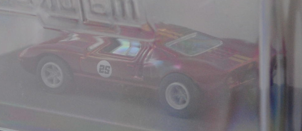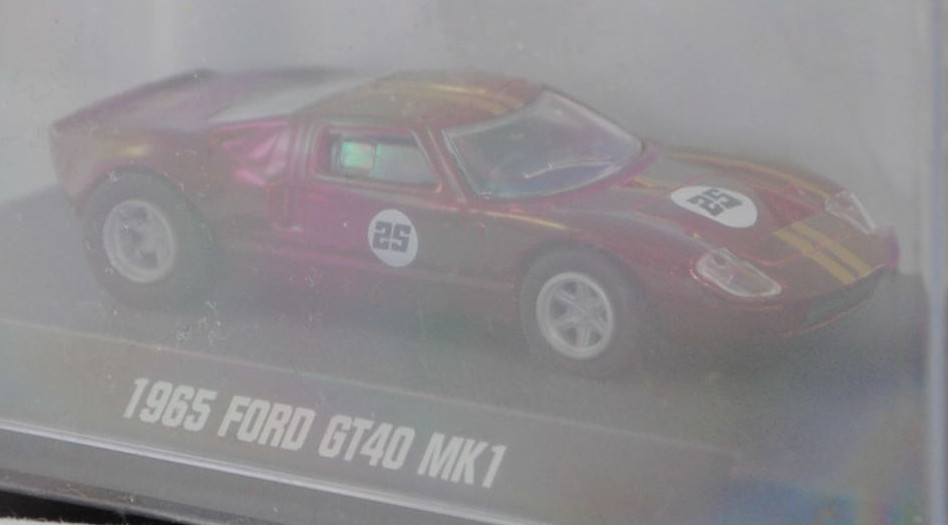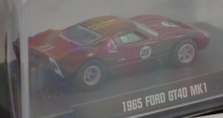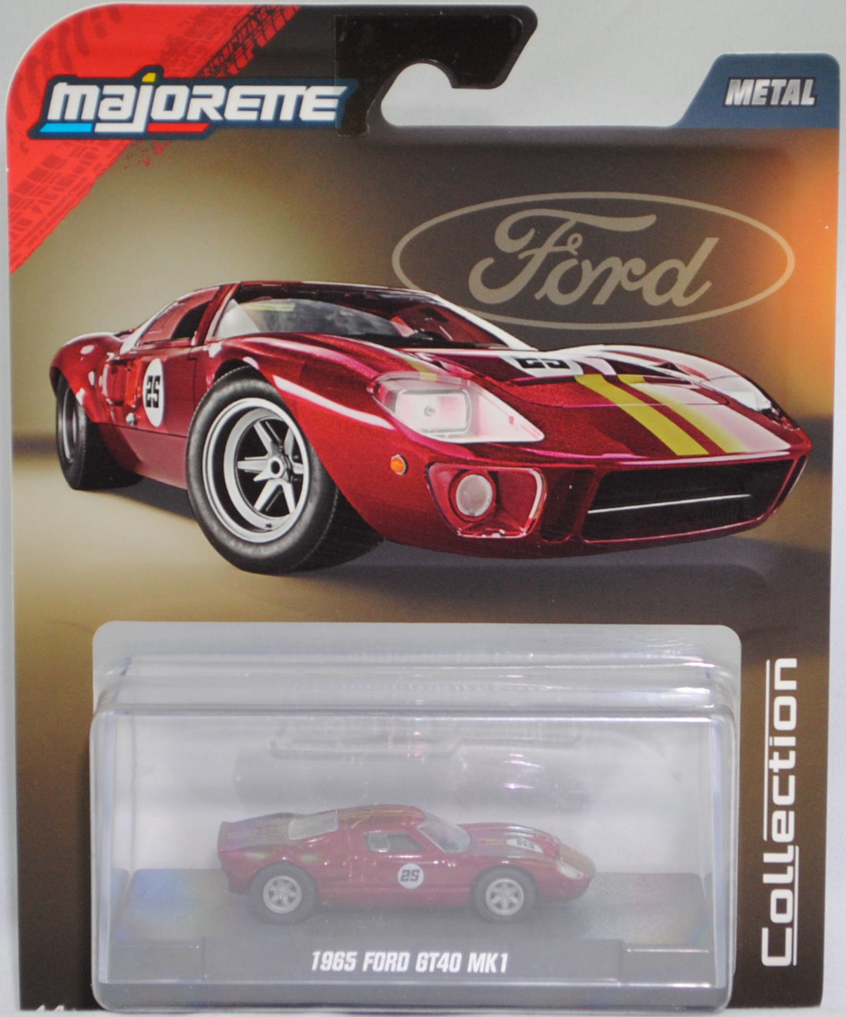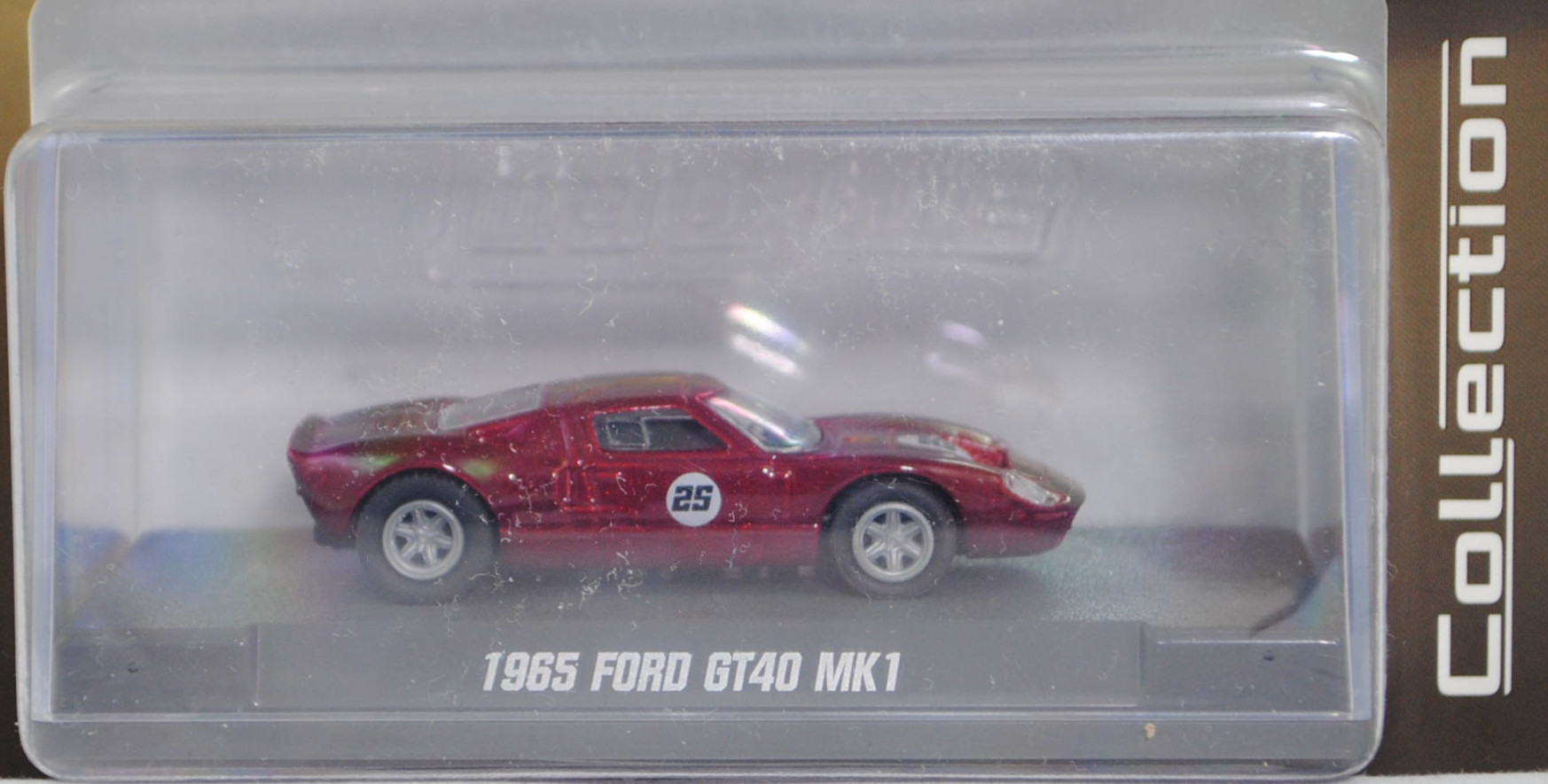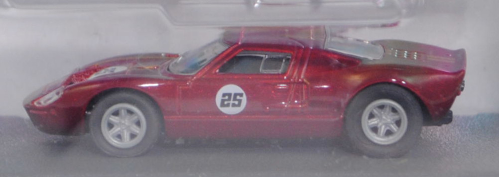 Ford GT40 (1. Generation, Baureihe GT40, interne Baureihenbezeichnung Mk I bzw. Mark 1, GT40 steht für Gran Turismo und Fahrzeughöhe 40 Zoll, zweitüriger Sportwagen als Coupé mit 2 Sitzplätzen, Karosserie aus GFK, zwei Frontscheinwerfer unter einer Klarglasabdeckung, 2 über die Fahrzeugbreite gehende Lüftungsgitter hinten auf dem Dach, Motorhaube oben ohne Luftzuführungen für den Motor, Blinker hinten und Rückleuchten jeweils als separate Einheiten, gebaute Stückzahl: 31 Straßenfahrzeuge, 5-Gang-Schaltgetriebe, Heckantrieb, Motor: Ford Typ 289 CU wassergekühlter Achtzylinder-V-Viertakt-Otto mit 4 Weber-Vergaser und eine untenliegende zentrale Nockenwelle sowie OHV-Ventilsteuerung (OHV = overhead valves) und 2 Ventile pro Zylinder sowie 4737 cm³ und 335 PS, Radstand 2413 mm, Länge 4064 mm, Modell 1965-1967), weinrotmetallic, innen schwarz, Sitze schwarz, Lenkrad schwarz, Druck zwei Streifen in gold mittig von Haube vorne über Dach bis zur Motorhaube, zusätzlicher Druck eines Streifens in gold vorne auf der Haube hinter den Frontscheinwerfern, Druck Startnummer 25 in schwarz in Kreis in reinweiß auf den Türen und vorne auf der Haube, Druck Streifen in reinweiß stirnseitig auf der Motorhaube im Bereich der rechten Rückleuchten, Ford 6-Speichen-Magnesium-Felgen Typ BRM6 (Hersteller: BRM) vorne Größe 9 x 15 mit Zentralverschluss und Reifen 5,50-15 sowie hinten Größe 14 x 15 mit Zentralverschluss und Reifen 7,00-15, majorette, 1:64, PC-Box im Blister (Collection) (EAN 3467452078785)