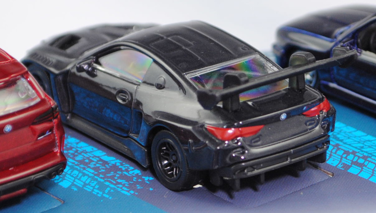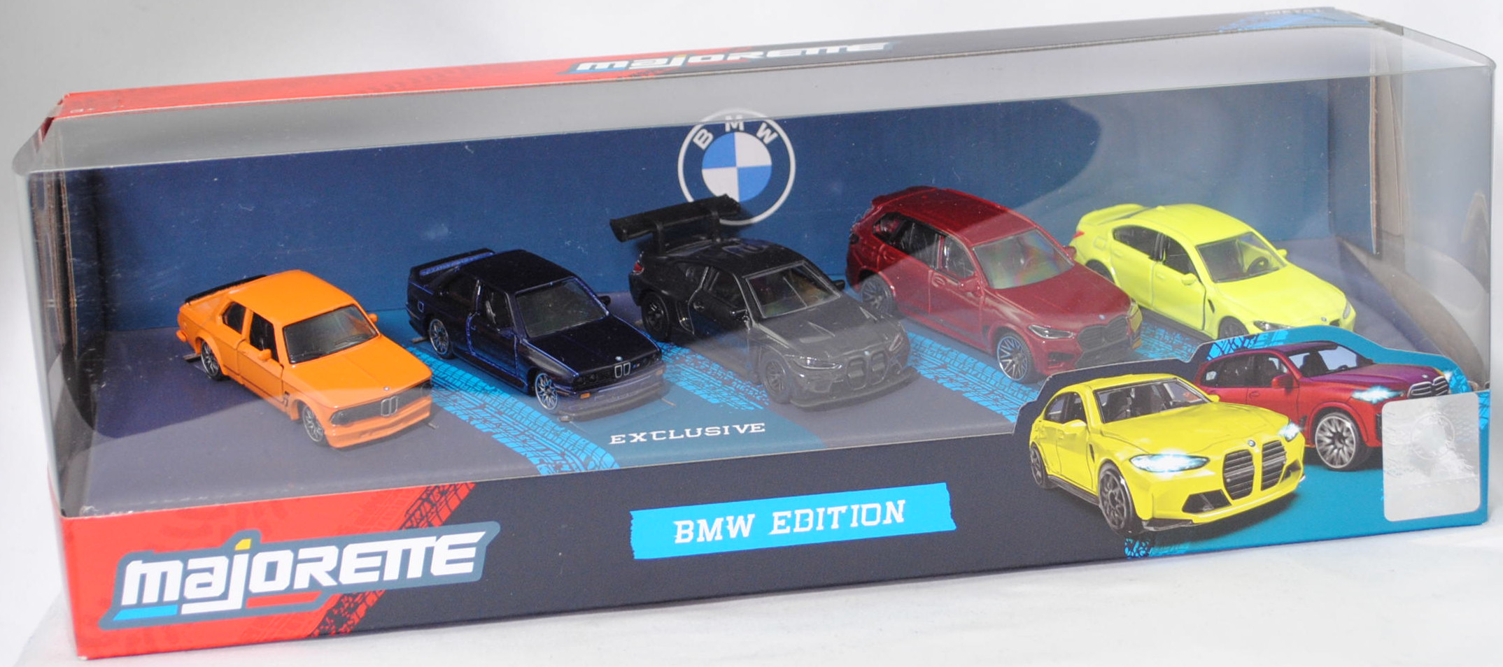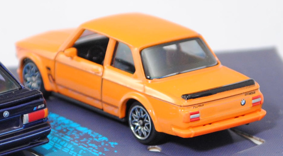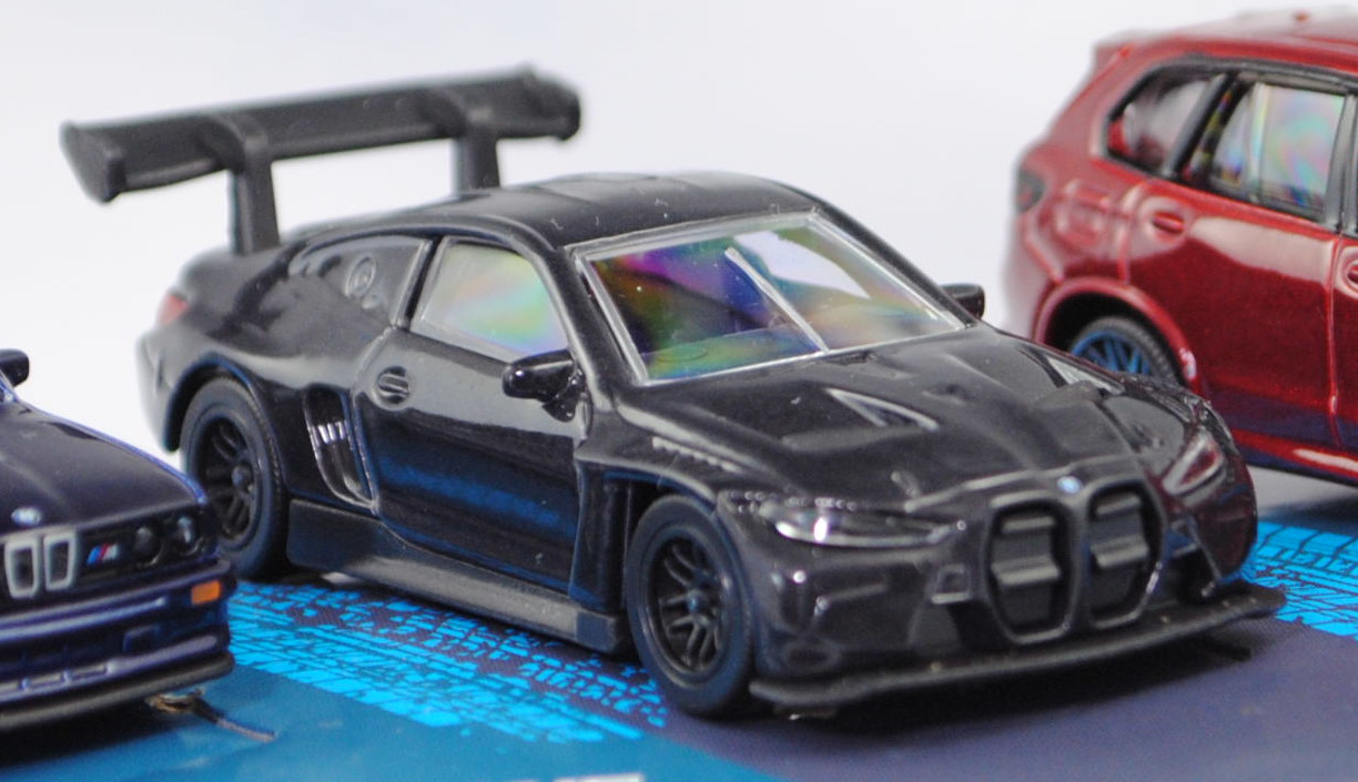 Giftpack BMW (5 Modelle) bestehend aus: BMW 2002 turbo (1. Generation, Baureihe 02-Serie (abgeleitet von der zweitürigen Konstruktion), interne Baureihenbezeichnung E20, zweitürige Stufenhecklimousine mit 5 Sitzplätzen, Facelift 1973 zum Modelljahr 1974, Kunststoff-Kühlergrill schwarz, BMW-Niere flach in chrom mit senkrechten schwarzen Kunststoffstreben, Rückleuchten rechteckig, Ausstattungslinie 2002 turbo: Halogen H4-Scheinwerfer (automatische Abschaltung mit der Zündung) + Front- und Heckspoiler + Motorhaube mit Federentlastung und Sicherheitsverriegelung + abschraubbare Kotflügelverbreitungen + Außenspiegel getönt + Cockpit mit roter Zierblende + Instrumententräger mit Geschwindigkeitsmesser, Kilometer- und Tageskilometerzähler, Drehzahlmesser, Ladedruckmesser, Quarzuhr, Kraftstoffanzeiger, Kühlwasserthermometer + Scheiben-Wisch-Wasch-Automatik mit Betätigung am Lenkrad + 2 Wischergeschwindigkeiten und Intervallschaltung + 3 Speichen-Sportlenkrad in Leder mit griffiger Schaumstoffummantelung + Innenspiegel abblendbar + bequem erreichbare Ablagen im Handschuhfach, auf dem Instrumententräger und in der Mittelkonsole + vorne voll versenkbare Kurbelfenster und Schwenkfenster + Ausstallfenster hinten + Armlehnen an den Türen, rechts mit integriertem Haltegriff + Dachhaltegriffe hinten mit Kleiderhaken + Sport-Schalensitze vorn + Kopfstützen vorn - verstellbar und abnehmbar + Innenraumbeleuchtung + Teppichboden + 2 Rückfahrleuchten + Stoßstange in chrom hinten (von Modellen bis 1971) + gestylte Stahlfelgen Größe 5,5 J x 13 H2 mit Gürtelreifen 185/70 VR 13, gebaute Fahrzeuge 1672 Stück, sperrsynchronisierte 4-Gang-Schaltgetriebe mit Mittelschaltung, Hinterradantrieb, Motor: BMW Typ M10B20 wassergekühlter Vierzylinder-Reihen-Viertakt-Otto mit KKK (Kühnle, Kopp & Kausch AG Frankenthal) Typ BLD Abgas-Turbolader und Kugelfischer PL 04 Saugrohreinspritzung sowie eine obenliegende Nockenwelle (SOHC = Single Overhead Camshaft) und 2 Ventile pro Zylinder sowie 1990 cm³ und 170 PS, Radstand 2500 mm, Länge 4220 mm, Modell 1973-1975) (Nr. 257H), gelborange (vgl. inka orange beim Original, Farbcode 022), innen schwarz, Sitze schwarz, Lenkrad schwarz, Druck Zierstreifen in schwarz auf den Seiten, zusätzlicher Druck 2002 in schwarz auf den vorderen Kotflügeln, Druck BMW-Logo in schwarz/reinweiß/blau vorne auf der Motorhaube und hinten links neben der rechten Rückleuchte, Druck turbo 2002 in schwarz über den Rückleuchten, Heckspoiler schwarz, Türen zu öffnen, 10-Y-Speichen-Felgen in chrom (BMW gestylte Stahlfelgen im 8-Loch-Design Größe 5,5 J x 13 H2 ET 18 mit Lochkreis 4 x 100 und Nabendeckel / Radzierkappe (Farbcode chrom mit BMW-Logo mittig) sowie Gürtelreifen 185/70 VR 13), 1:58; BMW M3 Sport Evolution (1. Generation M3 bzw. 2. Generation 3er-Reihe, Baureihe M3 Limousine, interne Baureihenbezeichnung E30, auch Evolution II genannt, zweitürige Stufenhecklimousine mit 4 Sitzplätzen, Hersteller: BMW M GmbH München, Ausstattungslinie M3 Sport Evolution: Kotflügelverbreitungen + einteilige Stoßfänger vorne und hinten + zusätzliche 3stufig verstellbare Lippe als Frontspoiler (Venturi-Spoiler) unter dem Stoßfänger + ohne Nebelscheinwerfer (dafür nun Luftkanäle zur Bremsenkühlung) + Schwellerverkleidungen + Karosserie im Bereich der Heckscheibe geändert (breitere und flachere C-Säule) sowie Heckscheibe flacher angesetzt + Erhöhung der Heckklappe um 7 cm + Heckklappe aus glasfaserverstärktem Kunststoff + Heckspoiler mit zusätzlicher 3stifig verstellbarer Lippe (im Rennsport Gurney Flap genannt) + 2,5-Liter Saugmotor mit 2467 cm³ und 238 PS sowie mit Katalysator + Außenspiegel rechts elektrisch vom Fahrer aus einstellbar inklusive Beheizung für beide Außenspiegel + Drehzahlmesser + M Technic Sport-Lederlenkrad Ø 380 mm inklusive Lederschaltknopf mit Rauhleder ummantelt + Servolenkung drehzahlabhängig geregelt + Kartenleseleuchte und Innenlichtautomatik + BMW M Technic Sportsitze für Fahrer und Beifahrer mit integrierten Kopfstützen in Länge, Höhe und Neigung verstellbar + Mittelbahnen der Sitze und Türverkleidungseinsätze mit Stoff im M Design in anthrzit (Code 0316) bezogen + Frontscheibe mit schmalem transparentem Grünkeil + Heck- und Seitenscheiben in Leichtbarweise + Ausstellfenster hinten + 2 Nebelschlussleuchten + Sperrdifferential 25% + Tankinhalt 62 Liter + Leichtmetallräder im Kreuzspeichen-Styling mit Felgenstern Größe 7,5 J x 16 mit Reifen 225/45 ZR 16, gebaute Fahrzeuge 600 Stück, 5-Gang-Schaltgetriebe, Hinterradantrieb, Motor: BMW Typ S14 B25 wassergekühlter Vierzylinder-Reihen-Viertakt-Otto mit Saugrohreinspritzung und zwei obenliegende Nockenwellen (DOHC = Double Overhead Camshaft) sowie 4 Ventile pro Zylinder und 2467 cm³ sowie 238 PS (mit Katalysator), Radstand 2565,5 mm, Länge 4345 mm, Modell 1990-1990) (Nr. 257F), hell-stahlblaumetallic (vgl. ähnlich marocoblau metallic beim Original, Farbcode 250), innen schwarz, Sitze schwarz, Lenkrad schwarz, Kühlergrill schwarz mit Druck BMW-Niere in silber, Druck Zierstreifen in rot/dunkelblau/hellblau (BMW Motorsport-Farben) und M in silber links im Kühlergrill, Druck BMW-Logo in schwarz/reinweiß/blau vorne auf der Motorhaube und hinten mittig auf der Heckklappe, Frontspoiler schwarz in Normalstellung, Heckspoiler hell-stahlblaumetallic flach in Monza-Stellung, Türen zu öffnen, 10-Y-Speichen-Felgen in chrom (BMW Leichtmetallräder im Kreuzspeichen-Design Typ Styling 5 (Hersteller BBS) mit Felgenstern Größe 7,5 J x 16 ET 27 mit Lochkreis 5 x 120 (Teilenummer 36 11 2 225 621, Farbcode 144 noragosilber) und Nabendeckel / Radzierdeckel (Teilenummer 36 13 2 226 806, Farbcode 144 noragosilber mit BMW-Emblem in schwarz/weiß/blau) sowie Reifen 225/45 ZR 16 92Z), 1:58; BMW M4 GT3 EVO (2. Generation M4 bzw. 2. Generation 4er-Reihe, Baureihe M4 GT3, interne Baureihenbezeichnung G82, zweitüriger Rennwagen als Sportcoupé mit 1 Sitzplatz, FIA GT3 Homologationsnummer GT3-053, LCI (Lif