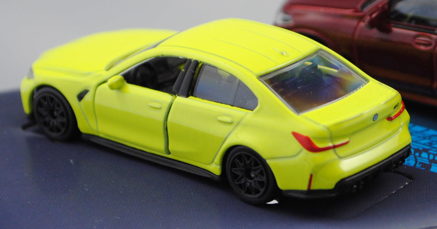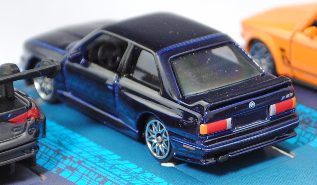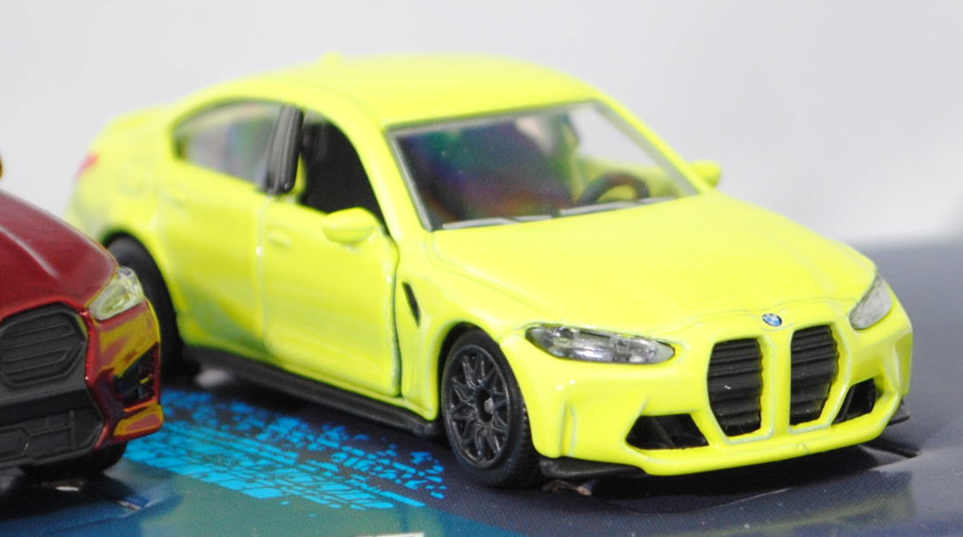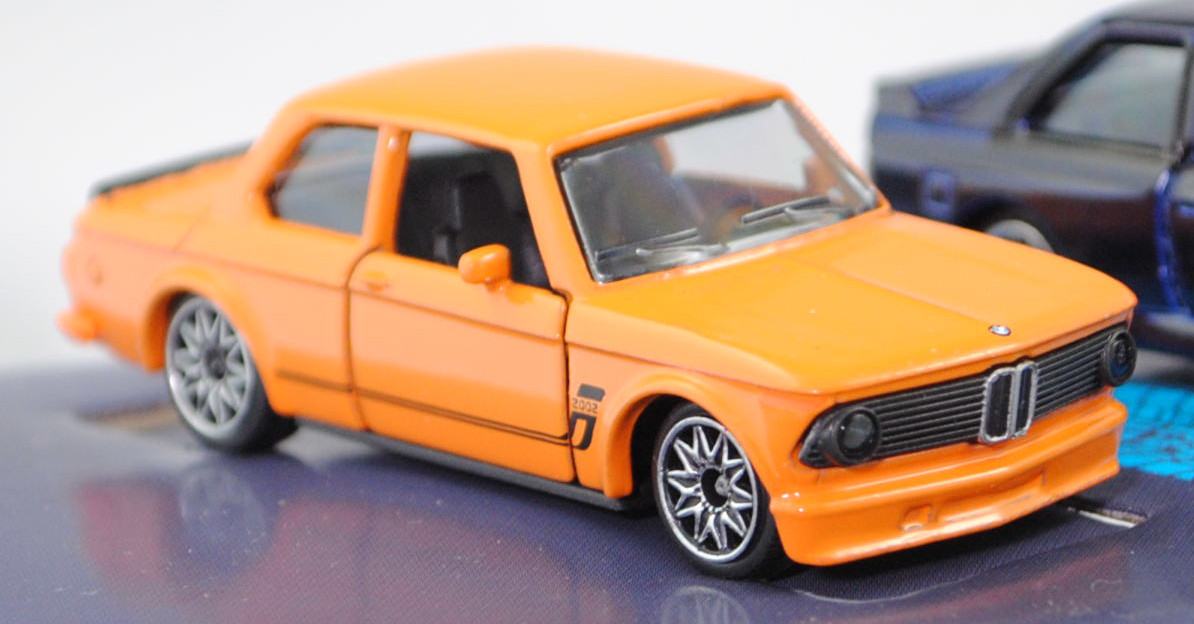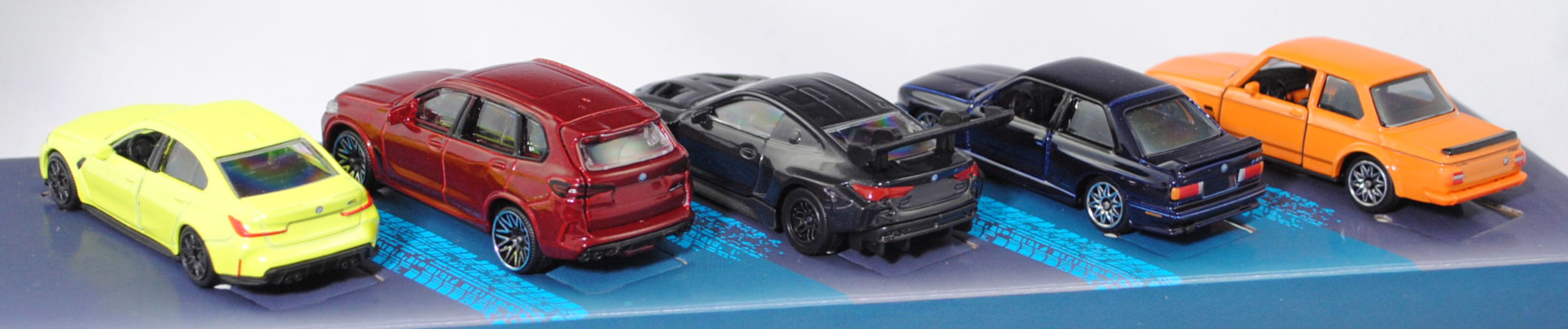 Giftpack BMW (5 Modelle) bestehend aus: BMW 2002 turbo (1. Generation, Baureihe 02-Serie (abgeleitet von der zweitürigen Konstruktion), interne Baureihenbezeichnung E20, zweitürige Stufenhecklimousine mit 5 Sitzplätzen, Facelift 1973 zum Modelljahr 1974, Kunststoff-Kühlergrill schwarz, BMW-Niere flach in chrom mit senkrechten schwarzen Kunststoffstreben, Rückleuchten rechteckig, Ausstattungslinie 2002 turbo: Halogen H4-Scheinwerfer (automatische Abschaltung mit der Zündung) + Front- und Heckspoiler + Motorhaube mit Federentlastung und Sicherheitsverriegelung + abschraubbare Kotflügelverbreitungen + Außenspiegel getönt + Cockpit mit roter Zierblende + Instrumententräger mit Geschwindigkeitsmesser, Kilometer- und Tageskilometerzähler, Drehzahlmesser, Ladedruckmesser, Quarzuhr, Kraftstoffanzeiger, Kühlwasserthermometer + Scheiben-Wisch-Wasch-Automatik mit Betätigung am Lenkrad + 2 Wischergeschwindigkeiten und Intervallschaltung + 3 Speichen-Sportlenkrad in Leder mit griffiger Schaumstoffummantelung + Innenspiegel abblendbar + bequem erreichbare Ablagen im Handschuhfach, auf dem Instrumententräger und in der Mittelkonsole + vorne voll versenkbare Kurbelfenster und Schwenkfenster + Ausstallfenster hinten + Armlehnen an den Türen, rechts mit integriertem Haltegriff + Dachhaltegriffe hinten mit Kleiderhaken + Sport-Schalensitze vorn + Kopfstützen vorn - verstellbar und abnehmbar + Innenraumbeleuchtung + Teppichboden + 2 Rückfahrleuchten + Stoßstange in chrom hinten (von Modellen bis 1971) + gestylte Stahlfelgen Größe 5,5 J x 13 H2 mit Gürtelreifen 185/70 VR 13, gebaute Fahrzeuge 1672 Stück, sperrsynchronisierte 4-Gang-Schaltgetriebe mit Mittelschaltung, Hinterradantrieb, Motor: BMW Typ M10B20 wassergekühlter Vierzylinder-Reihen-Viertakt-Otto mit KKK (Kühnle, Kopp & Kausch AG Frankenthal) Typ BLD Abgas-Turbolader und Kugelfischer PL 04 Saugrohreinspritzung sowie eine obenliegende Nockenwelle (SOHC = Single Overhead Camshaft) und 2 Ventile pro Zylinder sowie 1990 cm³ und 170 PS, Radstand 2500 mm, Länge 4220 mm, Modell 1973-1975) (Nr. 257H), gelborange (vgl. inka orange beim Original, Farbcode 022), innen schwarz, Sitze schwarz, Lenkrad schwarz, Druck Zierstreifen in schwarz auf den Seiten, zusätzlicher Druck 2002 in schwarz auf den vorderen Kotflügeln, Druck BMW-Logo in schwarz/reinweiß/blau vorne auf der Motorhaube und hinten links neben der rechten Rückleuchte, Druck turbo 2002 in schwarz über den Rückleuchten, Heckspoiler schwarz, Türen zu öffnen, 10-Y-Speichen-Felgen in chrom (BMW gestylte Stahlfelgen im 8-Loch-Design Größe 5,5 J x 13 H2 ET 18 mit Lochkreis 4 x 100 und Nabendeckel / Radzierkappe (Farbcode chrom mit BMW-Logo mittig) sowie Gürtelreifen 185/70 VR 13), 1:58; BMW M3 Sport Evolution (1. Generation M3 bzw. 2. Generation 3er-Reihe, Baureihe M3 Limousine, interne Baureihenbezeichnung E30, auch Evolution II genannt, zweitürige Stufenhecklimousine mit 4 Sitzplätzen, Hersteller: BMW M GmbH München, Ausstattungslinie M3 Sport Evolution: Kotflügelverbreitungen + einteilige Stoßfänger vorne und hinten + zusätzliche 3stufig verstellbare Lippe als Frontspoiler (Venturi-Spoiler) unter dem Stoßfänger + ohne Nebelscheinwerfer (dafür nun Luftkanäle zur Bremsenkühlung) + Schwellerverkleidungen + Karosserie im Bereich der Heckscheibe geändert (breitere und flachere C-Säule) sowie Heckscheibe flacher angesetzt + Erhöhung der Heckklappe um 7 cm + Heckklappe aus glasfaserverstärktem Kunststoff + Heckspoiler mit zusätzlicher 3stifig verstellbarer Lippe (im Rennsport Gurney Flap genannt) + 2,5-Liter Saugmotor mit 2467 cm³ und 238 PS sowie mit Katalysator + Außenspiegel rechts elektrisch vom Fahrer aus einstellbar inklusive Beheizung für beide Außenspiegel + Drehzahlmesser + M Technic Sport-Lederlenkrad Ø 380 mm inklusive Lederschaltknopf mit Rauhleder ummantelt + Servolenkung drehzahlabhängig geregelt + Kartenleseleuchte und Innenlichtautomatik + BMW M Technic Sportsitze für Fahrer und Beifahrer mit integrierten Kopfstützen in Länge, Höhe und Neigung verstellbar + Mittelbahnen der Sitze und Türverkleidungseinsätze mit Stoff im M Design in anthrzit (Code 0316) bezogen + Frontscheibe mit schmalem transparentem Grünkeil + Heck- und Seitenscheiben in Leichtbarweise + Ausstellfenster hinten + 2 Nebelschlussleuchten + Sperrdifferential 25% + Tankinhalt 62 Liter + Leichtmetallräder im Kreuzspeichen-Styling mit Felgenstern Größe 7,5 J x 16 mit Reifen 225/45 ZR 16, gebaute Fahrzeuge 600 Stück, 5-Gang-Schaltgetriebe, Hinterradantrieb, Motor: BMW Typ S14 B25 wassergekühlter Vierzylinder-Reihen-Viertakt-Otto mit Saugrohreinspritzung und zwei obenliegende Nockenwellen (DOHC = Double Overhead Camshaft) sowie 4 Ventile pro Zylinder und 2467 cm³ sowie 238 PS (mit Katalysator), Radstand 2565,5 mm, Länge 4345 mm, Modell 1990-1990) (Nr. 257F), hell-stahlblaumetallic (vgl. ähnlich marocoblau metallic beim Original, Farbcode 250), innen schwarz, Sitze schwarz, Lenkrad schwarz, Kühlergrill schwarz mit Druck BMW-Niere in silber, Druck Zierstreifen in rot/dunkelblau/hellblau (BMW Motorsport-Farben) und M in silber links im Kühlergrill, Druck BMW-Logo in schwarz/reinweiß/blau vorne auf der Motorhaube und hinten mittig auf der Heckklappe, Frontspoiler schwarz in Normalstellung, Heckspoiler hell-stahlblaumetallic flach in Monza-Stellung, Türen zu öffnen, 10-Y-Speichen-Felgen in chrom (BMW Leichtmetallräder im Kreuzspeichen-Design Typ Styling 5 (Hersteller BBS) mit Felgenstern Größe 7,5 J x 16 ET 27 mit Lochkreis 5 x 120 (Teilenummer 36 11 2 225 621, Farbcode 144 noragosilber) und Nabendeckel / Radzierdeckel (Teilenummer 36 13 2 226 806, Farbcode 144 noragosilber mit BMW-Emblem in schwarz/weiß/blau) sowie Reifen 225/45 ZR 16 92Z), 1:58; BMW M4 GT3 EVO (2. Generation M4 bzw. 2. Generation 4er-Reihe, Baureihe M4 GT3, interne Baureihenbezeichnung G82, zweitüriger Rennwagen als Sportcoupé mit 1 Sitzplatz, FIA GT3 Homologationsnummer GT3-053, LCI (Lif