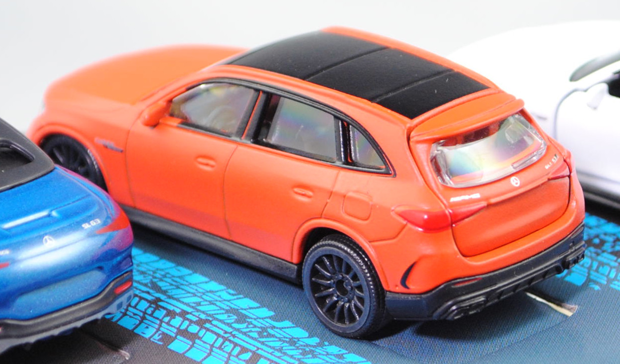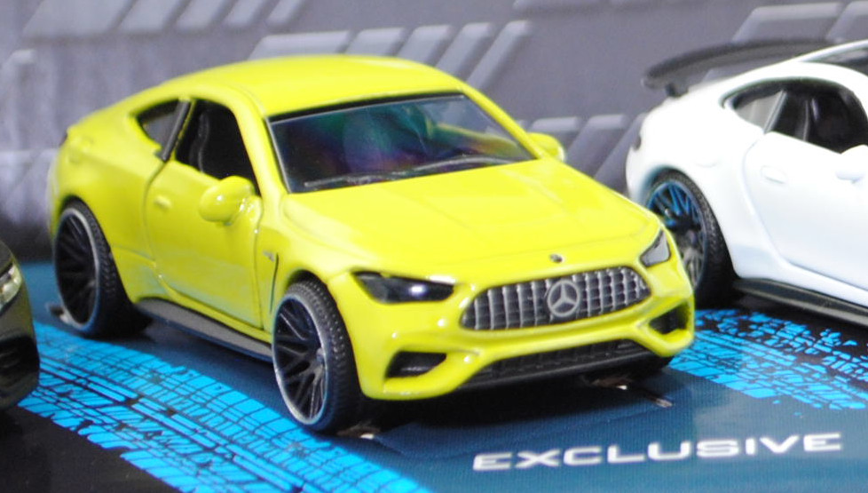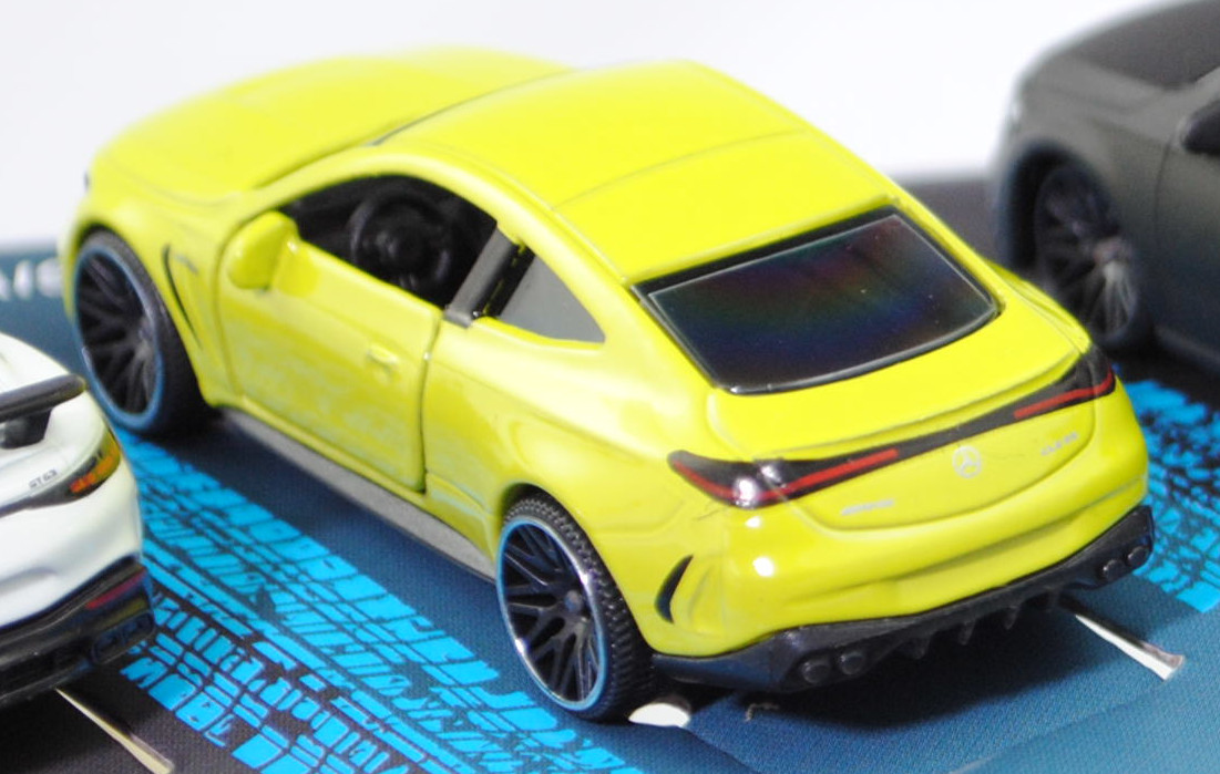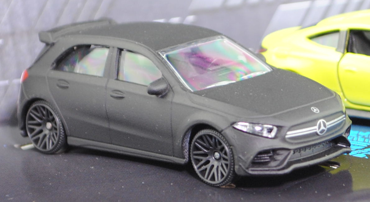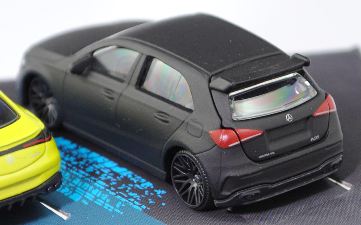 Giftpack Mercedes-AMG (5 Modelle) bestehend aus: Mercedes-AMG A 35 4Matic (4. Generation A-Klasse, Baureihe A-Klasse AMG, interne Baureihenbezeichnung W 177, Baumuster 177.053, fünftürige Steilheck-Limousine mit 5 Sitzplätzen, Vor-MoPf (vor Modellpflege / Vorfacelift), Kühlergrill mit zwei waagerechten Lammellen in der Mitte, äußere Lüftungsöffnungen im vorderen Stoßfänger mit steil verlaufender Abgrenzung auf der Innenseite, Rückleuchten im unteren Bereich mit durchgehender weißer Verglasung, Ausstattungslinie Mercedes-AMG A 35 4MATIC: AMG Styling mit AMG-spezifischer Kühlerverkleidung und AMG Schriftzug + AMG Frontschürze mit Flics als Luftleitelemente an den äußeren Lufteinlässen + Frontsplitter und Zierelemente auf den Lamellen in den äußeren Lufteinlässen in silberchrom + AMG Seitenschwellerverkleidungen in Wagenfarbe + verchromte Bordkanten- und Fensterlinienzierstäbe + TURBO 4MATIC Schriftzug auf den vorderen Kotflügeln + Multifunktions-Sportlenkrad im 3-Speichen-Design in Leder Nappa unten abgeflacht mit Perforation im Griffbereich + verchromte Lüftungsdüsen mit rotem Ring + eigenständige AMG Mittelkonsole betont sportlich und nach vorn hochgezogen + Sportsitze mit Polster in Ledernachbildung ARTICO / Mikrofaser DINAMICA schwarz mit roter Doppelziernaht (651) + AMG Sportpedalanlage aus gebürstetem Edelstahl mit Gumminoppen + AMG Abrisskante auf Dachspoiler + AMG Heckschürze mit spezifischer Diffusoroptik mit vier vertikalen Finnen und runde Endrohrblenden mit 90 mm Durchmesser rechts und links + 18 Zoll AMG Leichtmetallräder im 5-Doppelspeichen-Design aerodynamisch optimierte schwarz lackiert und glanzgedreht (RQT), AMG SPEEDSHIFT DCT 7G (7-Gang-Doppelkupplungsgetriebe, Automatik), Allradantrieb 4Matic, Motor: Mercedes-AMG M 260 DE 20 AL (M = Ottomotor der Baureihe 260 mit 20 Deziliter Hubraum und Direkteinspritzung (DE) sowie Abgasturbolader (A) und Ladeluftkühler (L)) wassergekühlter Vierzylinder-Reihen-Viertakt-Otto mit Twin-Scroll-Turbolader und Direkteinspritzung sowie zwei obenliegende Nockenwelle (DOHC = Double Overhead Camshaft) und 4 Ventile pro Zylinder sowie 1991 cm³ und 306 PS, Baumuster Motor: M 260.920, Radstand 2729 mm, Länge 4436 mm, Modell 2018-2022) (Nr. 232H), mattschwarz, innen schwarz, Sitze schwarz, Lenkrad schwarz, Heckklappe zu öffnen, 10-V-Speichen-Felgen in schwarzgrau (AMG Leichtmetallräder im 5-Doppelspeichen-Design aerodynamisch optimierte schwarz lackiert und glanzgedreht (Ausstattungcode RQT) Größe 8 J x 18 ET 40 mit Lochkreis 5 x 112 (Teilenummer A 177 401 18 00, Farbcode 7X23 schwarz lackiert und glanzgedreht) und Nabendeckel / Radzierdeckel (Farbcode schwarz mit Mercedes-Benz-Stern in chrom) sowie Reifen 235/40 R 18 95V), 1:59; Mercedes-AMG CLE 53 4Matic+ Coupé Premium (1. Generation, Baureihe CLE Coupé, interne Baureihenbezeichnung C 236, zweitüriges Coupé mit 4 Sitzplätzen, Ausstattungslinie AMG CLE 53 4Matic+ Premium: Kühlergrill im Panamericana-Design mit 14 hervorstehenden senkrechten Lamellen in chrom + Mercedes-AMG Exterieur (PUF) inklusive AMG-Styling + Mercedes-AMG Interieur (PTF) + Zentraldisplay mit 30,2 cm (11,9'') Bildschirmdiagolale (868) Fahrerdisplay mit einem 31,2 cm (12,3'') großen LCD-Farbdisplay (464) + Mittelkonsole in schwarz hochglänzend (757) + AMG Einstiegsleisten mit AMG-Schriftzug beleuchtet und mit Wechselcover (U45) + AMG Abrisskante am Heck (U95) + Hinterachslenkung (201) + 19 Zoll AMG Leichtmetallräder im 10-Speichen-Design (RRD), Sonderausstattung gegen Mehrpreis: Panorama-Schiebedach (413), AMG SPEEDSHIFT TCT 9G (9-Gang-Automatikgetriebe, TCT = Torque-Clutch Transmission), Allradantrieb 4Matic+, Motor: Mercedes-AMG Typ M 256 E30 DEH LA G (M = Ottomotor der Baureihe 256 mit 30 Deziliter Hubraum und Direkteinspritzung (DE) sowie homogenem Kraftstoff-Luft-Gemisch (H) und Ladeluftkühler (L) sowie Abgasturbolader (A) und boostfähiger Starter-Generator (G)) wassergekühlter Sechszylinder-Reihen-Viertakt-Otto mit Abgasturbolader und elektrisch angetriebenem Zusatzverdichter sowie Direkteinspritzung und zwei obenliegende Nockenwelle (DOHC = Double Overhead Camshaft) sowie 4 Ventile pro Zylinder und Ladeluftkühler sowie 2999 cm³ und 449 PS, Baumuster Motor: 256.830, zusätzlicher Elektromotor zwischen Verbrennungsmotor und Getriebe als Riemen-Starter-Generator mit 23 PS und Lithium-Ionen-Batterie mit 0,9 kWh brutto, Systemleistung 472 PS, Radstand 2875 mm, Länge ohne Anhängerkupplung (AHK) 4853 mm, Modell 2023-) (Nr. 232Q), dunkel-schwefelgelb, innen schwarz, Sitze schwarz (vgl. Sportsitze mit integrierter Kopfstütze mit Mercedes-AMG spezifischem Nahtbild und Polsterung in Ledernachbildung ARTICO/Mikrofaser MICROCUT AMG schwarz mit roten Kontrastziernähten (651A) beim Original), Lenkrad schwarz, Türen zu öffnen, 10-V-Speichen-Felgen in schwarzgrau mit Felgenrand in chrom (AMG Leichtmetallräder im 10-Speichen-Design (Ausstattungcode RRD) aerodynamisch optimiert und schwarz matt lackiert sowie glanzgedreht vorne Größe 9,5 J x 19 ET 19 mit Lochkreis 5 x 112 (Teilenummer A 236 401 27 00, Farbcode 7X36 schwarz matt glanzgedreht) und Radzierkappen / Nabendeckel (Farbcode schwarz mit Mercedes-Benz-Stern in chrom) sowie Reifen 265/40 ZR 19 102Y bzw. hinten Größe 11 J x 19 ET 24 mit Lochkreis 5 x 112 (Teilenummer A 236 401 28 00, Farbcode 7X36 schwarz matt glanzgedreht) und Radzierkappen / Nabendeckel (Farbcode schwarz mit Mercedes-Benz-Stern in chrom) sowie Reifen 295/35 ZR 19 104Y), ca. 1:66; Mercedes-AMG GT 63 4Matic+ Premium (2. Generation GT, Baureihe AMG GT Coupé, interne Baureihenbezeichnung C 192, Baumuster 254.680, zweitüriger Sportwagen als Coupé mit 4 Sitzplätzen, Ausstattungslinie AMG Premium: Premium-Paket (PSC) mit Ambientebeleuchtung (891), GUARD 360° Fahrzeugschutz Plus (P82), Lenkradheizung (443), AMG Real Performance Sound (339), AMG Lichtinszenierung (588) + AMG spezifische Kühlerverkleidung mit vertikalen Streben in hochglanzchrom und AMG Schriftz