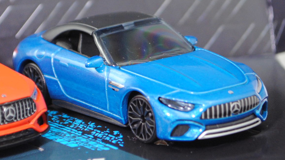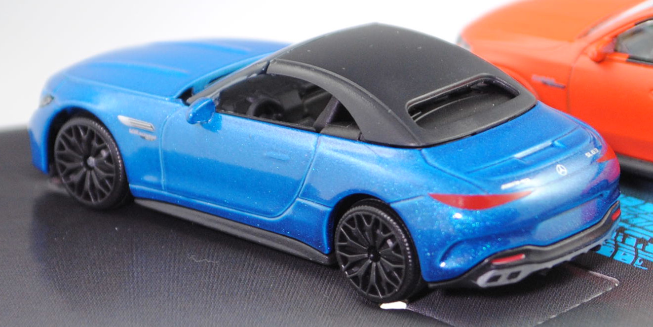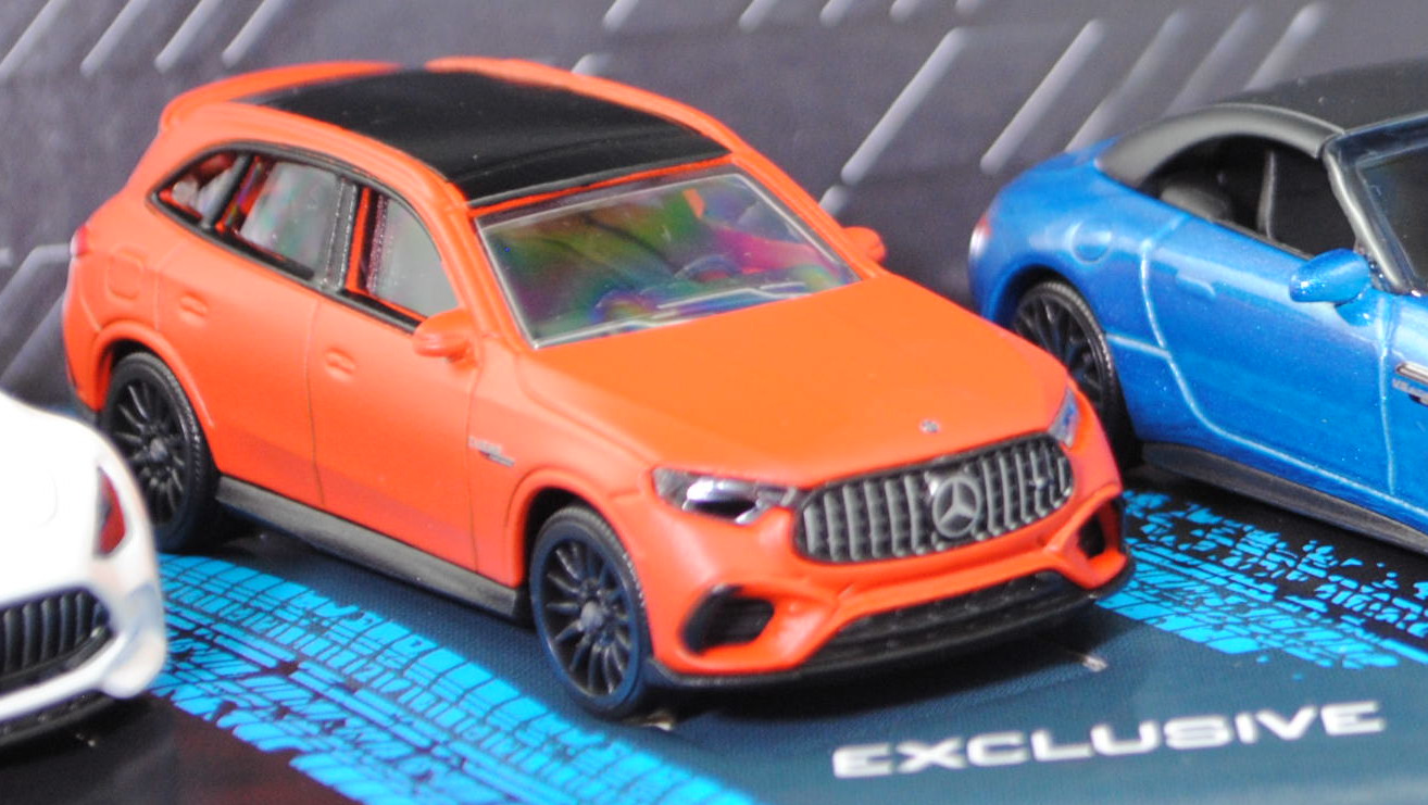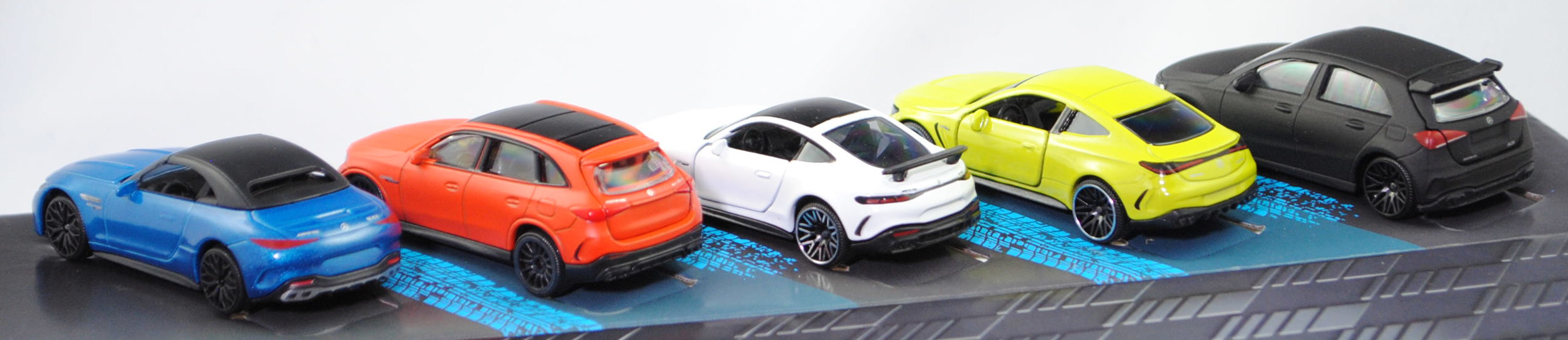 Giftpack Mercedes-AMG (5 Modelle) bestehend aus: Mercedes-AMG A 35 4Matic (4. Generation A-Klasse, Baureihe A-Klasse AMG, interne Baureihenbezeichnung W 177, Baumuster 177.053, fünftürige Steilheck-Limousine mit 5 Sitzplätzen, Vor-MoPf (vor Modellpflege / Vorfacelift), Kühlergrill mit zwei waagerechten Lammellen in der Mitte, äußere Lüftungsöffnungen im vorderen Stoßfänger mit steil verlaufender Abgrenzung auf der Innenseite, Rückleuchten im unteren Bereich mit durchgehender weißer Verglasung, Ausstattungslinie Mercedes-AMG A 35 4MATIC: AMG Styling mit AMG-spezifischer Kühlerverkleidung und AMG Schriftzug + AMG Frontschürze mit Flics als Luftleitelemente an den äußeren Lufteinlässen + Frontsplitter und Zierelemente auf den Lamellen in den äußeren Lufteinlässen in silberchrom + AMG Seitenschwellerverkleidungen in Wagenfarbe + verchromte Bordkanten- und Fensterlinienzierstäbe + TURBO 4MATIC Schriftzug auf den vorderen Kotflügeln + Multifunktions-Sportlenkrad im 3-Speichen-Design in Leder Nappa unten abgeflacht mit Perforation im Griffbereich + verchromte Lüftungsdüsen mit rotem Ring + eigenständige AMG Mittelkonsole betont sportlich und nach vorn hochgezogen + Sportsitze mit Polster in Ledernachbildung ARTICO / Mikrofaser DINAMICA schwarz mit roter Doppelziernaht (651) + AMG Sportpedalanlage aus gebürstetem Edelstahl mit Gumminoppen + AMG Abrisskante auf Dachspoiler + AMG Heckschürze mit spezifischer Diffusoroptik mit vier vertikalen Finnen und runde Endrohrblenden mit 90 mm Durchmesser rechts und links + 18 Zoll AMG Leichtmetallräder im 5-Doppelspeichen-Design aerodynamisch optimierte schwarz lackiert und glanzgedreht (RQT), AMG SPEEDSHIFT DCT 7G (7-Gang-Doppelkupplungsgetriebe, Automatik), Allradantrieb 4Matic, Motor: Mercedes-AMG M 260 DE 20 AL (M = Ottomotor der Baureihe 260 mit 20 Deziliter Hubraum und Direkteinspritzung (DE) sowie Abgasturbolader (A) und Ladeluftkühler (L)) wassergekühlter Vierzylinder-Reihen-Viertakt-Otto mit Twin-Scroll-Turbolader und Direkteinspritzung sowie zwei obenliegende Nockenwelle (DOHC = Double Overhead Camshaft) und 4 Ventile pro Zylinder sowie 1991 cm³ und 306 PS, Baumuster Motor: M 260.920, Radstand 2729 mm, Länge 4436 mm, Modell 2018-2022) (Nr. 232H), mattschwarz, innen schwarz, Sitze schwarz, Lenkrad schwarz, Heckklappe zu öffnen, 10-V-Speichen-Felgen in schwarzgrau (AMG Leichtmetallräder im 5-Doppelspeichen-Design aerodynamisch optimierte schwarz lackiert und glanzgedreht (Ausstattungcode RQT) Größe 8 J x 18 ET 40 mit Lochkreis 5 x 112 (Teilenummer A 177 401 18 00, Farbcode 7X23 schwarz lackiert und glanzgedreht) und Nabendeckel / Radzierdeckel (Farbcode schwarz mit Mercedes-Benz-Stern in chrom) sowie Reifen 235/40 R 18 95V), 1:59; Mercedes-AMG CLE 53 4Matic+ Coupé Premium (1. Generation, Baureihe CLE Coupé, interne Baureihenbezeichnung C 236, zweitüriges Coupé mit 4 Sitzplätzen, Ausstattungslinie AMG CLE 53 4Matic+ Premium: Kühlergrill im Panamericana-Design mit 14 hervorstehenden senkrechten Lamellen in chrom + Mercedes-AMG Exterieur (PUF) inklusive AMG-Styling + Mercedes-AMG Interieur (PTF) + Zentraldisplay mit 30,2 cm (11,9'') Bildschirmdiagolale (868) Fahrerdisplay mit einem 31,2 cm (12,3'') großen LCD-Farbdisplay (464) + Mittelkonsole in schwarz hochglänzend (757) + AMG Einstiegsleisten mit AMG-Schriftzug beleuchtet und mit Wechselcover (U45) + AMG Abrisskante am Heck (U95) + Hinterachslenkung (201) + 19 Zoll AMG Leichtmetallräder im 10-Speichen-Design (RRD), Sonderausstattung gegen Mehrpreis: Panorama-Schiebedach (413), AMG SPEEDSHIFT TCT 9G (9-Gang-Automatikgetriebe, TCT = Torque-Clutch Transmission), Allradantrieb 4Matic+, Motor: Mercedes-AMG Typ M 256 E30 DEH LA G (M = Ottomotor der Baureihe 256 mit 30 Deziliter Hubraum und Direkteinspritzung (DE) sowie homogenem Kraftstoff-Luft-Gemisch (H) und Ladeluftkühler (L) sowie Abgasturbolader (A) und boostfähiger Starter-Generator (G)) wassergekühlter Sechszylinder-Reihen-Viertakt-Otto mit Abgasturbolader und elektrisch angetriebenem Zusatzverdichter sowie Direkteinspritzung und zwei obenliegende Nockenwelle (DOHC = Double Overhead Camshaft) sowie 4 Ventile pro Zylinder und Ladeluftkühler sowie 2999 cm³ und 449 PS, Baumuster Motor: 256.830, zusätzlicher Elektromotor zwischen Verbrennungsmotor und Getriebe als Riemen-Starter-Generator mit 23 PS und Lithium-Ionen-Batterie mit 0,9 kWh brutto, Systemleistung 472 PS, Radstand 2875 mm, Länge ohne Anhängerkupplung (AHK) 4853 mm, Modell 2023-) (Nr. 232Q), dunkel-schwefelgelb, innen schwarz, Sitze schwarz (vgl. Sportsitze mit integrierter Kopfstütze mit Mercedes-AMG spezifischem Nahtbild und Polsterung in Ledernachbildung ARTICO/Mikrofaser MICROCUT AMG schwarz mit roten Kontrastziernähten (651A) beim Original), Lenkrad schwarz, Türen zu öffnen, 10-V-Speichen-Felgen in schwarzgrau mit Felgenrand in chrom (AMG Leichtmetallräder im 10-Speichen-Design (Ausstattungcode RRD) aerodynamisch optimiert und schwarz matt lackiert sowie glanzgedreht vorne Größe 9,5 J x 19 ET 19 mit Lochkreis 5 x 112 (Teilenummer A 236 401 27 00, Farbcode 7X36 schwarz matt glanzgedreht) und Radzierkappen / Nabendeckel (Farbcode schwarz mit Mercedes-Benz-Stern in chrom) sowie Reifen 265/40 ZR 19 102Y bzw. hinten Größe 11 J x 19 ET 24 mit Lochkreis 5 x 112 (Teilenummer A 236 401 28 00, Farbcode 7X36 schwarz matt glanzgedreht) und Radzierkappen / Nabendeckel (Farbcode schwarz mit Mercedes-Benz-Stern in chrom) sowie Reifen 295/35 ZR 19 104Y), ca. 1:66; Mercedes-AMG GT 63 4Matic+ Premium (2. Generation GT, Baureihe AMG GT Coupé, interne Baureihenbezeichnung C 192, Baumuster 254.680, zweitüriger Sportwagen als Coupé mit 4 Sitzplätzen, Ausstattungslinie AMG Premium: Premium-Paket (PSC) mit Ambientebeleuchtung (891), GUARD 360° Fahrzeugschutz Plus (P82), Lenkradheizung (443), AMG Real Performance Sound (339), AMG Lichtinszenierung (588) + AMG spezifische Kühlerverkleidung mit vertikalen Streben in hochglanzchrom und AMG Schriftz