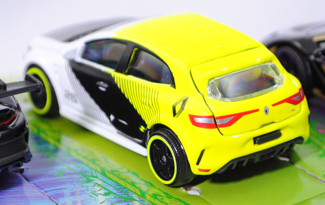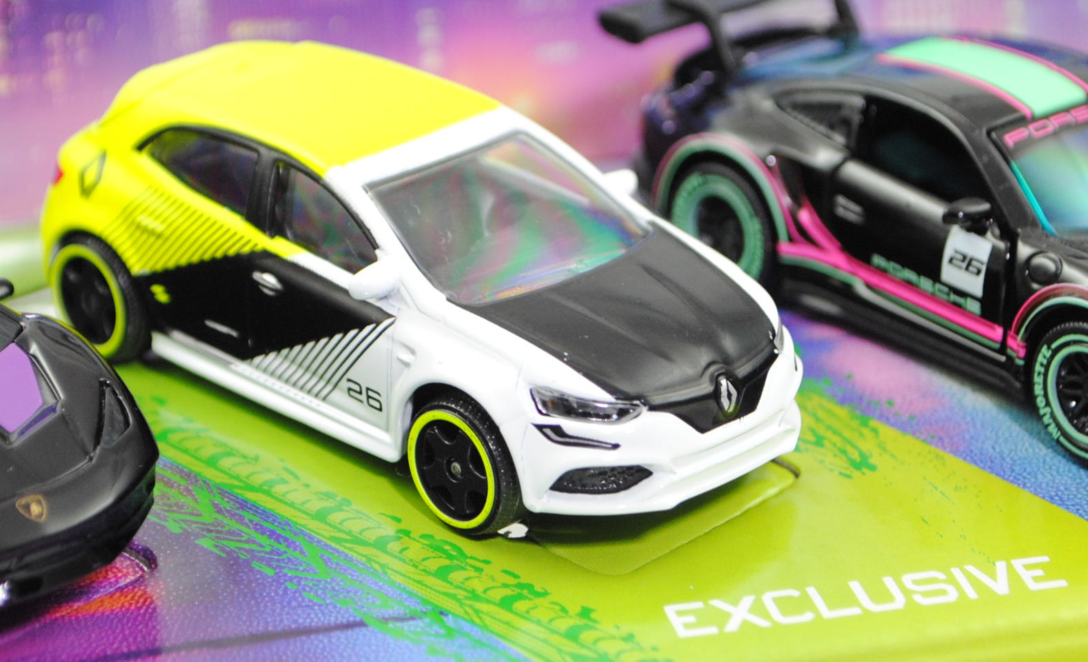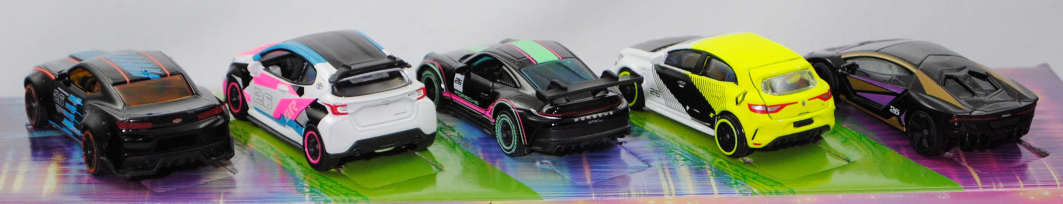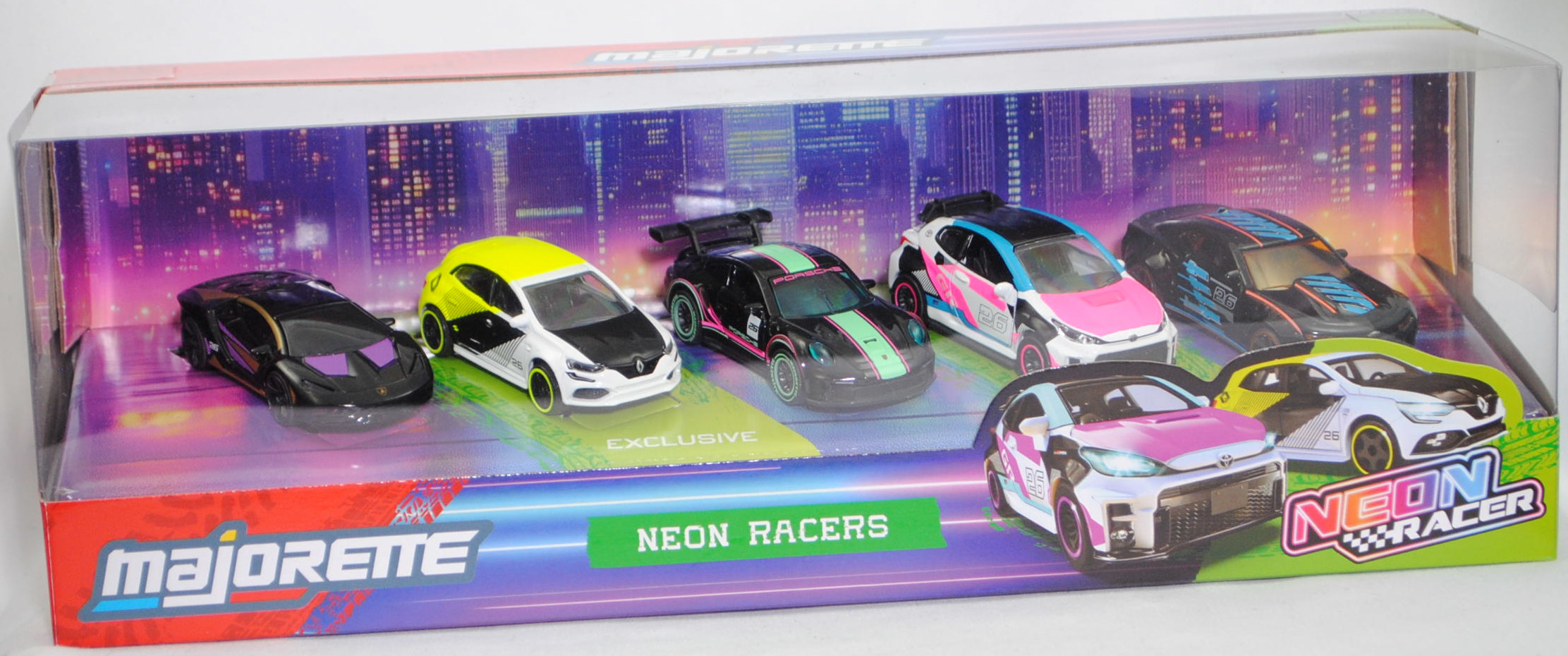 Giftpack NEON RACER (5 Modelle) bestehend aus: Lamborghini Centenario LP 770-4 (1. Generation, Baureihe Centenario Coupé, zweitüriger Supersportwagen als Coupé mit 2 Sitzplätzen, LP = Longitudinale Posterioe (Triebwerk längs hinten eingebaut), 770 = Motorleistung in PS, 4 = Allradantrieb, Limitierte Auflage aus Anlass des 100. Geburtstages von Ferruccio Lamborghini, gebaute Stückzahl: 20 Stück, 7-Gang-ISR (Independent Shifting Rods)-Getriebe, permanenter Allradantrieb, Motor: Lamborghini Typ L539 wassergekühlter Zwölfzylinder-V-Viertakt-Otto mit Multi-Point-Einspritzung und zwei obenliegende Nockenwellen (DOHC = Double Overhead Camshaft) je Zylinderbank sowie 4 Ventile pro Zylinder und 6498 cm³ sowie 770 PS, Radstand 2700 mm, Länge 4924 mm, Modell 2016-2018) (Nr. 9612), schwarz, innen schwarz, Sitze schwarz, Lenkrad schwarz, Druck Startnummer 26 in reinweiß und Streifen in gold/signalviolett auf den Seiten, Druck Dachsäulen von A- bis C-Säule in gold, Druck Haube vorne über den Lufteinlässen in signalviolett, Druck Lamborghini-Logo in gold vorne auf dem Stoßfänger, Druck Lamborghini in silber zwischen den Rückleuchten, Verglasung grau, 5-Speichen-Felgen in schwarz/hell-purpurviolett (Lamborghini Schmiedefelgen aus Aluminiumlegierung vorne Größe 9 J x 20 H2 ET 17,2 mit Lochkreis 5 x 112 und Pirelli P ZERO™ Corsa Reifen 255/30 ZR 20 92Y sowie hinten Größe 13 J x 21 ET 51,7 mit Lochkreis 5 x 112 und Pirelli P ZERO™ Corsa Reifen 355/25 ZR 21 107Y), 1:66; Renault Mégane R.S. TCe 280 EDC (4. Generation, Baureihe Mégane R.S., Typ IV, interne Bezeichnung RFB, fünftürige Schräghecklimousine mit 5 Sitzplätzen, Ausstattungslinie Mégane R.S.: Kühlergrill R.S. mit R.S.-Schriftzug + Außenspiegel in titanium-schwarz lackiert + Lederlenkrad R.S. + Aluminium-Sportpedale + Luftauslässe an den Seiten + Stoßfänger vorne und hinten im spezifischen R.S. Design + Stoßfänger hinten mit Diffusor und zentralem Abgasendrohr + Allradlenkung 4CONTROL + Sport-Fahrwerk mit hydraulischem Endschlag an der Vorder- und Hinterachse+ 18 Zoll-Leichtmetallräder Estoril, 6-Gang-Doppelkupplungsgetriebe (Automatik), Allradlenkung, Frontantrieb, Motor: Renault Typ M5P P4 wassergekühlter Vierzylinder-Reihen-Turbo-Viertakt-Otto mit Direkteinspritzung und zwei obenliegende Nockenwellen (DOHC = Double Overhead Camshaft) sowie 4 Ventile pro Zylinder und 1798 cm³ sowie 280 PS, Radstand 2670 mm, Länge 4364 mm, Modell 2018) (Nr. 222F), Karosserie vorne reinweiß, Karosserie hinten leuchtgelb, innen schwarz, Sitze schwarz (vgl. Stoffpolsterung R.S. in titanium-schwarz mit roten Ziernähten beim Original), Lenkrad schwarz (vgl. Lederlenkrad R.S. beim Original), Druck Startnummer 26 in schwarz und Streifen in schwarz auf den Seiten, Druck Renault-Logo in schwarz hinten auf den Seiten, Motorhaube schwarz, Druck Renault-Logo in silber im Kühlergrill, Druck Renault-Logo und RS in silber auf der Heckklappe, Heckklappe zu öffnen, Verglasung klar, 5-Arm-Felgen in schwarz mit Felgenrand in leuchtgelb (Renault Leichtmetallräder Typ Estoril Größe 8 J x 18 CH ET 48 mit Lochkreis 5 x 114,3 (Teilenummer 403006832R, Farbe grau) und Reifen 235/40 R 18), 1:63; Porsche 911 GT3 Cup (8. Generation Porsche 911 oder 7. Cup-Generation, Typ 992, zweitüriger Sportwagen als Coupé mit 1 Sitzplatz, GT-Rennwagen für Porsche Mobil 1 Supercup, Heckantrieb, Motor: Porsche Typ DRM wassergekühlter Sechszylinder-Boxer-Viertakt-Otto mit Direkteinspritzung und zwei obenliegende Nockenwellen (DOHC = Double Overhead Camshaft) je Zylinderbank sowie 4 Ventile pro Zylinder und 3996 cm³ sowie 510 PS, Radstand 2459 mm, Länge 4585 mm, Modell 2019-) (Nr. 209R), schwarz, innen schwarz, Sitz schwarz, Lenkrad schwarz, Druck Quadrat in reinweiß auf den Türen wobei Startnummer 26 in Wagenfarbe durchschimmert, Druck PORSCHE in dunkel-weißgrün und Streifen in erikaviolett/dunkel-weißgrün auf den Seiten, Druck Streifen in erikaviolett/dunkel-weißgrün auf der Haube vorne und dem Dach, Druck PORSCHE In erikaviolett auf Streifen in schwarz oben auf der Windschutzscheibe, Druck PORSCHE-Waggen in gold/rot/schwarz vorne auf der Haube, Druck PORSCHE / GT3 Cup in silber hinten auf dem Stoßfänger, Schwanenhals-Heckflügel schwarz, Verglasung blau, Türen zu öffnen, 6-Doppelspeichen-Felgen in schwarz mit Felgenrand in dunkel-weißgrün (Porsche Aluminiumfelgen vorne Größe 9,5 J x 20 ET 50 mit Lochkreis 5 x 130 und MICHELIN Pilot Sport Cup 2 Ultra-High-Performance-Reifen 265/35 ZR 20 99Y bzw. hinten Größe 12,5 J x 21 ET 48 mit Lochkreis 5 x 130 und MICHELIN Pilot Sport Cup 2 Ultra-High-Performance-Reifen 325/30 ZR 21 108Y), Druck 2x MAJORETTE in dunkel-weißgrün auf den Reifen, 1:62; Toyota GRMN Yaris Circuit Package (4. Generation, Baureihe Yaris, interne Baureihenbezeichnung XP21, dreitürige Schräghecklimousine als Kompaktsportwagen mit 2 Sitzplätzen, GRMN = GAZOO Racing getunt vom Meister des Nürburgrings, limitierte Auflage ausschließlich für Japan 500 Stück auf Basis Toyota GR Yaris, Verlosung der Fahrzeuge über eine Lotterie, Vorfacelift, Stoßfänger vorne im unteren Bereich durchlaufend ohne Versprung, seitliche Lüftungsschlitze im vorderen Stoßfänger durch eine Querstrebe geteilt, Stoßfänger hinten mit Defusor ohne Lüftungsgitter, mit trapezförmigem Rückfahrscheinwerfer im Stoßfänger, Ausführung GRMN mit um 20 kg leichteres Fahrzeug und 50 mm breiterer Karosserie sowie Tieferlegung und kürzer übersetztem 6-Gang-Schaltgetriebe, Ausstattungsvariante Circuit Package (Auflage 50 Fahrzeuge) mit zusätzlicher Frontspoilerlippe und Karbon-Heckspoiler, Allradantrieb, Motor: Toyota Typ G16E-GTS wassergekühlter Dreizylinder-Reihen-Viertakt-Turbo-Otto mit Direkteinspritzung und zwei obenliegende Nockenwellen (DOHC = Double Overhead Camshaft) sowie 4 Ventile pro Zylinder und 1618 cm³ sowie 272 PS, Radstand 2560 mm, Länge 4030 mm, Modell 2022-2024) (Nr. 216E), reinweiß (vgl. ähnlich platinumweiß perleffekt be