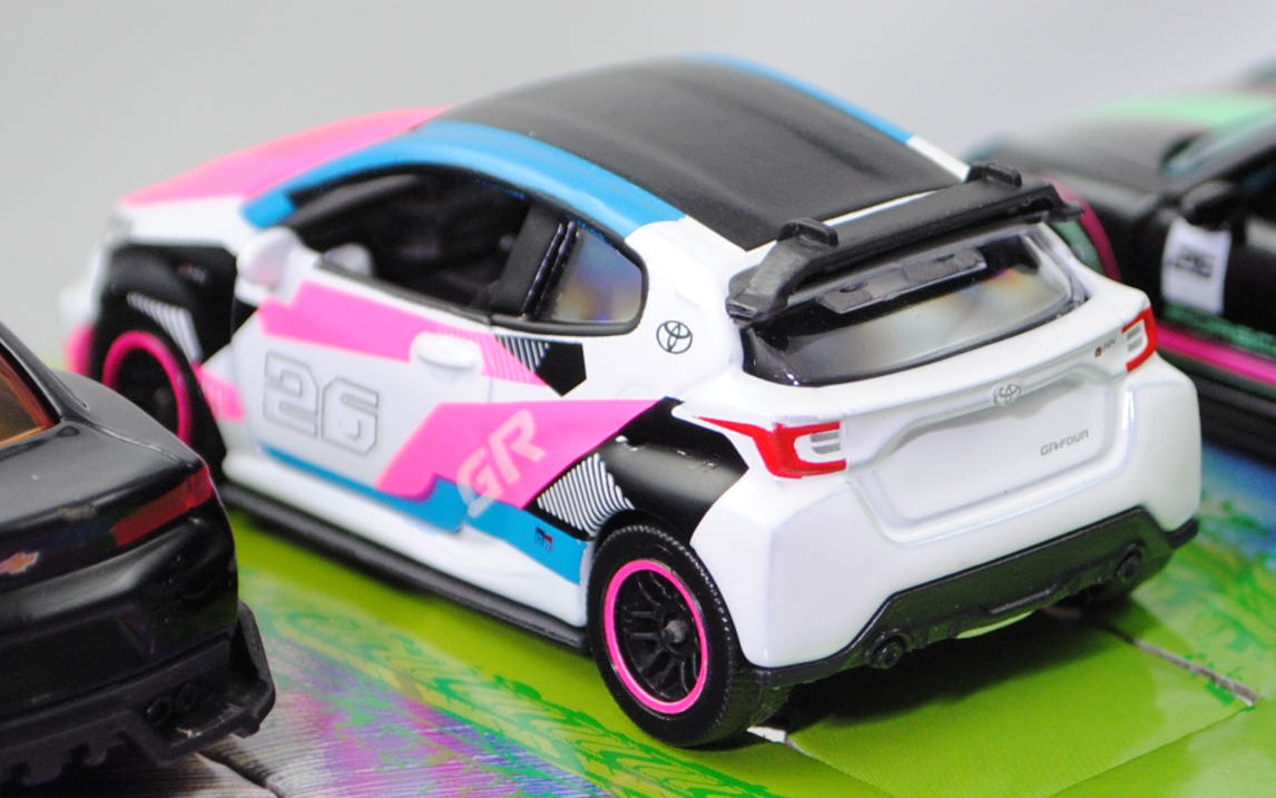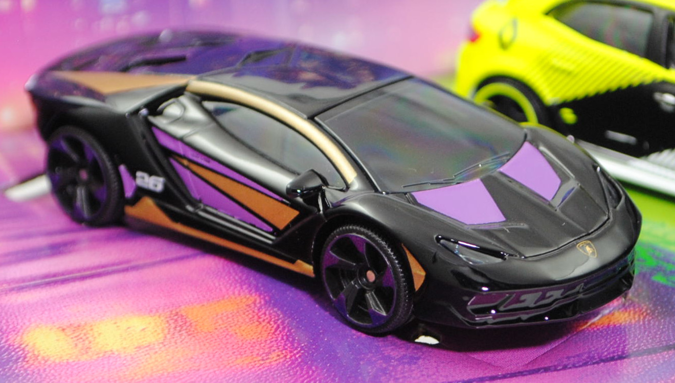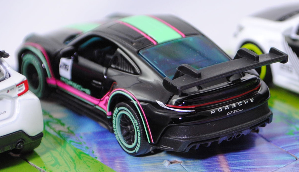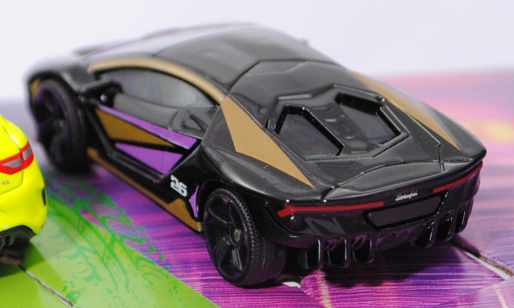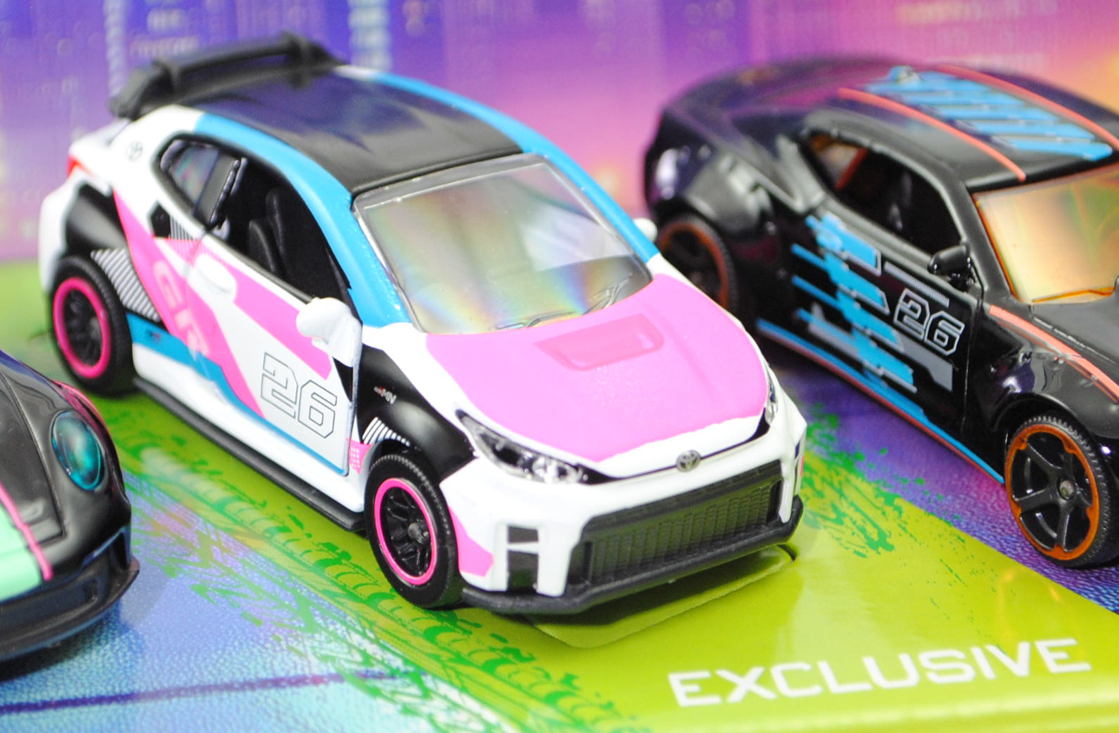 Giftpack NEON RACER (5 Modelle) bestehend aus: Lamborghini Centenario LP 770-4 (1. Generation, Baureihe Centenario Coupé, zweitüriger Supersportwagen als Coupé mit 2 Sitzplätzen, LP = Longitudinale Posterioe (Triebwerk längs hinten eingebaut), 770 = Motorleistung in PS, 4 = Allradantrieb, Limitierte Auflage aus Anlass des 100. Geburtstages von Ferruccio Lamborghini, gebaute Stückzahl: 20 Stück, 7-Gang-ISR (Independent Shifting Rods)-Getriebe, permanenter Allradantrieb, Motor: Lamborghini Typ L539 wassergekühlter Zwölfzylinder-V-Viertakt-Otto mit Multi-Point-Einspritzung und zwei obenliegende Nockenwellen (DOHC = Double Overhead Camshaft) je Zylinderbank sowie 4 Ventile pro Zylinder und 6498 cm³ sowie 770 PS, Radstand 2700 mm, Länge 4924 mm, Modell 2016-2018) (Nr. 9612), schwarz, innen schwarz, Sitze schwarz, Lenkrad schwarz, Druck Startnummer 26 in reinweiß und Streifen in gold/signalviolett auf den Seiten, Druck Dachsäulen von A- bis C-Säule in gold, Druck Haube vorne über den Lufteinlässen in signalviolett, Druck Lamborghini-Logo in gold vorne auf dem Stoßfänger, Druck Lamborghini in silber zwischen den Rückleuchten, Verglasung grau, 5-Speichen-Felgen in schwarz/hell-purpurviolett (Lamborghini Schmiedefelgen aus Aluminiumlegierung vorne Größe 9 J x 20 H2 ET 17,2 mit Lochkreis 5 x 112 und Pirelli P ZERO™ Corsa Reifen 255/30 ZR 20 92Y sowie hinten Größe 13 J x 21 ET 51,7 mit Lochkreis 5 x 112 und Pirelli P ZERO™ Corsa Reifen 355/25 ZR 21 107Y), 1:66; Renault Mégane R.S. TCe 280 EDC (4. Generation, Baureihe Mégane R.S., Typ IV, interne Bezeichnung RFB, fünftürige Schräghecklimousine mit 5 Sitzplätzen, Ausstattungslinie Mégane R.S.: Kühlergrill R.S. mit R.S.-Schriftzug + Außenspiegel in titanium-schwarz lackiert + Lederlenkrad R.S. + Aluminium-Sportpedale + Luftauslässe an den Seiten + Stoßfänger vorne und hinten im spezifischen R.S. Design + Stoßfänger hinten mit Diffusor und zentralem Abgasendrohr + Allradlenkung 4CONTROL + Sport-Fahrwerk mit hydraulischem Endschlag an der Vorder- und Hinterachse+ 18 Zoll-Leichtmetallräder Estoril, 6-Gang-Doppelkupplungsgetriebe (Automatik), Allradlenkung, Frontantrieb, Motor: Renault Typ M5P P4 wassergekühlter Vierzylinder-Reihen-Turbo-Viertakt-Otto mit Direkteinspritzung und zwei obenliegende Nockenwellen (DOHC = Double Overhead Camshaft) sowie 4 Ventile pro Zylinder und 1798 cm³ sowie 280 PS, Radstand 2670 mm, Länge 4364 mm, Modell 2018) (Nr. 222F), Karosserie vorne reinweiß, Karosserie hinten leuchtgelb, innen schwarz, Sitze schwarz (vgl. Stoffpolsterung R.S. in titanium-schwarz mit roten Ziernähten beim Original), Lenkrad schwarz (vgl. Lederlenkrad R.S. beim Original), Druck Startnummer 26 in schwarz und Streifen in schwarz auf den Seiten, Druck Renault-Logo in schwarz hinten auf den Seiten, Motorhaube schwarz, Druck Renault-Logo in silber im Kühlergrill, Druck Renault-Logo und RS in silber auf der Heckklappe, Heckklappe zu öffnen, Verglasung klar, 5-Arm-Felgen in schwarz mit Felgenrand in leuchtgelb (Renault Leichtmetallräder Typ Estoril Größe 8 J x 18 CH ET 48 mit Lochkreis 5 x 114,3 (Teilenummer 403006832R, Farbe grau) und Reifen 235/40 R 18), 1:63; Porsche 911 GT3 Cup (8. Generation Porsche 911 oder 7. Cup-Generation, Typ 992, zweitüriger Sportwagen als Coupé mit 1 Sitzplatz, GT-Rennwagen für Porsche Mobil 1 Supercup, Heckantrieb, Motor: Porsche Typ DRM wassergekühlter Sechszylinder-Boxer-Viertakt-Otto mit Direkteinspritzung und zwei obenliegende Nockenwellen (DOHC = Double Overhead Camshaft) je Zylinderbank sowie 4 Ventile pro Zylinder und 3996 cm³ sowie 510 PS, Radstand 2459 mm, Länge 4585 mm, Modell 2019-) (Nr. 209R), schwarz, innen schwarz, Sitz schwarz, Lenkrad schwarz, Druck Quadrat in reinweiß auf den Türen wobei Startnummer 26 in Wagenfarbe durchschimmert, Druck PORSCHE in dunkel-weißgrün und Streifen in erikaviolett/dunkel-weißgrün auf den Seiten, Druck Streifen in erikaviolett/dunkel-weißgrün auf der Haube vorne und dem Dach, Druck PORSCHE In erikaviolett auf Streifen in schwarz oben auf der Windschutzscheibe, Druck PORSCHE-Waggen in gold/rot/schwarz vorne auf der Haube, Druck PORSCHE / GT3 Cup in silber hinten auf dem Stoßfänger, Schwanenhals-Heckflügel schwarz, Verglasung blau, Türen zu öffnen, 6-Doppelspeichen-Felgen in schwarz mit Felgenrand in dunkel-weißgrün (Porsche Aluminiumfelgen vorne Größe 9,5 J x 20 ET 50 mit Lochkreis 5 x 130 und MICHELIN Pilot Sport Cup 2 Ultra-High-Performance-Reifen 265/35 ZR 20 99Y bzw. hinten Größe 12,5 J x 21 ET 48 mit Lochkreis 5 x 130 und MICHELIN Pilot Sport Cup 2 Ultra-High-Performance-Reifen 325/30 ZR 21 108Y), Druck 2x MAJORETTE in dunkel-weißgrün auf den Reifen, 1:62; Toyota GRMN Yaris Circuit Package (4. Generation, Baureihe Yaris, interne Baureihenbezeichnung XP21, dreitürige Schräghecklimousine als Kompaktsportwagen mit 2 Sitzplätzen, GRMN = GAZOO Racing getunt vom Meister des Nürburgrings, limitierte Auflage ausschließlich für Japan 500 Stück auf Basis Toyota GR Yaris, Verlosung der Fahrzeuge über eine Lotterie, Vorfacelift, Stoßfänger vorne im unteren Bereich durchlaufend ohne Versprung, seitliche Lüftungsschlitze im vorderen Stoßfänger durch eine Querstrebe geteilt, Stoßfänger hinten mit Defusor ohne Lüftungsgitter, mit trapezförmigem Rückfahrscheinwerfer im Stoßfänger, Ausführung GRMN mit um 20 kg leichteres Fahrzeug und 50 mm breiterer Karosserie sowie Tieferlegung und kürzer übersetztem 6-Gang-Schaltgetriebe, Ausstattungsvariante Circuit Package (Auflage 50 Fahrzeuge) mit zusätzlicher Frontspoilerlippe und Karbon-Heckspoiler, Allradantrieb, Motor: Toyota Typ G16E-GTS wassergekühlter Dreizylinder-Reihen-Viertakt-Turbo-Otto mit Direkteinspritzung und zwei obenliegende Nockenwellen (DOHC = Double Overhead Camshaft) sowie 4 Ventile pro Zylinder und 1618 cm³ sowie 272 PS, Radstand 2560 mm, Länge 4030 mm, Modell 2022-2024) (Nr. 216E), reinweiß (vgl. ähnlich platinumweiß perleffekt be