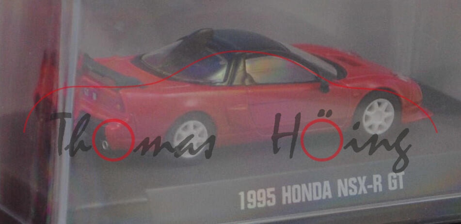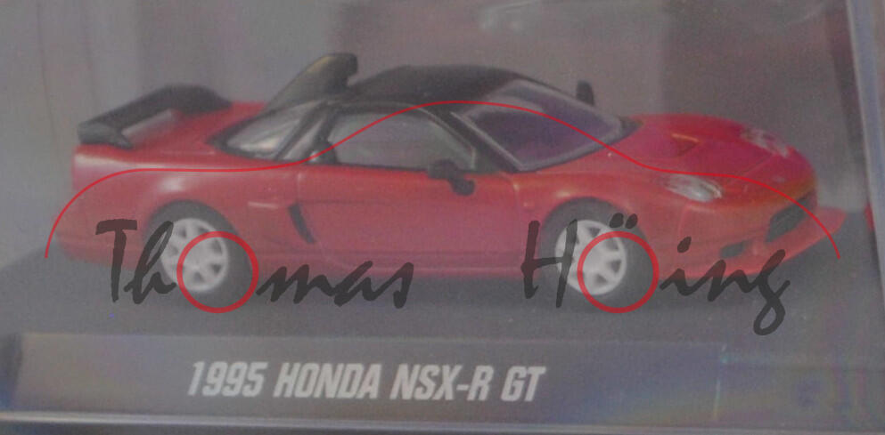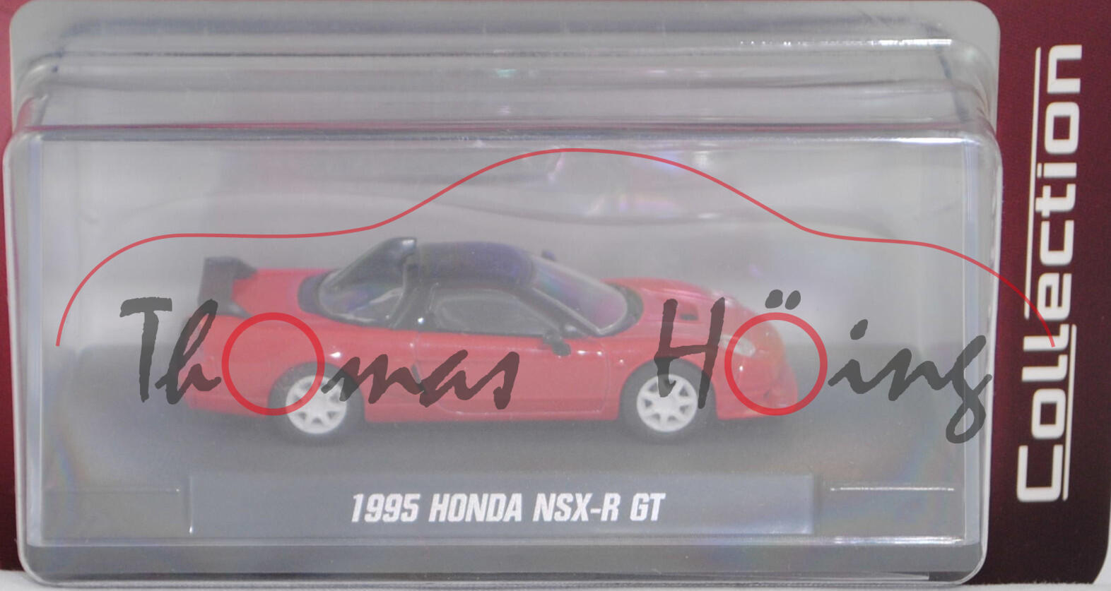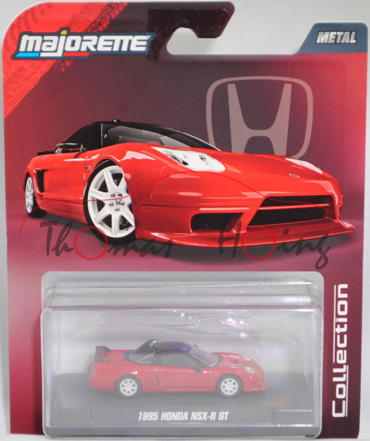 Honda NSX-R GT (1. Generation, Baureihe NSX (New Sportscar eXperimental), 2. Baureihe, interne Baureihenbezeichnung NA-2, zweitüriger Sportwagen als Coupé mit 2 Sitzplätzen, Facelift seit 2001 zum Modelljahr 2002, feststehende Xenon-HID-Frontscheinwerfer, Ziffernblätter der Instrumente in blau, überarbeitetes Fahrwerk mit breiteren Hinterreifen, Seitenschweller etwas verbreitert, in Handarbeit gebaute limitierte Auflage für Japan auf Basis des NSX-R: 5 Fahrzeuge, Homologationsmodell für die Rennserien JGTC (All Japan Grand Touring Car Championship) und Super GT, Ausstattungslinie NSX-R GT: Karosserie um 180 mm verlängert und um 90 mm verbreitert + verlängerte Frontspoilerlippe + vergrößerte Lufteinlässe auf den Seiten hinter den Türen + großer Heckdiffusor + nicht funktionsfähiger Schnorchel an der Heckscheibe, 6-Gang-Schaltgetriebe mit niedriger Endübersetzung, Hinterradantrieb, Motor: Honda Typ C32B2 wassergekühlter Sechszylinder-V-Viertakt-Otto mit Mehrpunkteinspritzung und zwei obenliegende Nockenwelle (DOHC = Double Overhead Camshaft) je Zylinderbank sowie 4 Ventile pro Zylinder und 3179 cm³ sowie 290 PS, Radstand 2530 mm, Länge 4610 mm, Modell 2005-2005), karminrotmetallic, innen schwarz, Sitze schwarz (vgl. Recaro-Carbon-Kevlar-Sitze mit feuerfestem roten Stoffbezug beim Original), Lenkrad schwarz (RHD = Right Hand Drive, Rechtslenker, Momo-Lederlenkrad ohne Airbag), geschmiedete leichte BBS-Leichtmetallräder im 7-Speichen-Design in championship white vorne Größe 7 J x 17 ET 55 mit Lochkreis 5 x 114,3 und Nabendeckel / Radzierdeckel (Farbcode championship white mit Honda-Logo in rot) sowie Bridgestone Potenza Reifen 215/40 ZR17 bzw. hinten Größe 9 J x 17 ET 55 mit Lochkreis 5 x 114,3 und Nabendeckel / Radzierdeckel (Farbcode championship white mit Honda-Logo in rot) sowie Bridgestone Potenza Reifen 255/40 ZR17, majorette, 1:64, PC-Box im Blister (Collection) (EAN 3467452078723)
