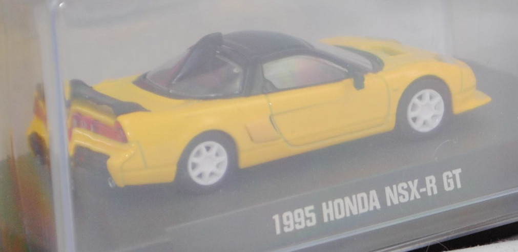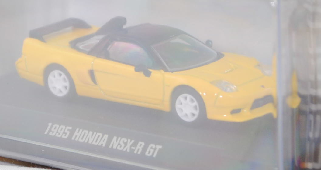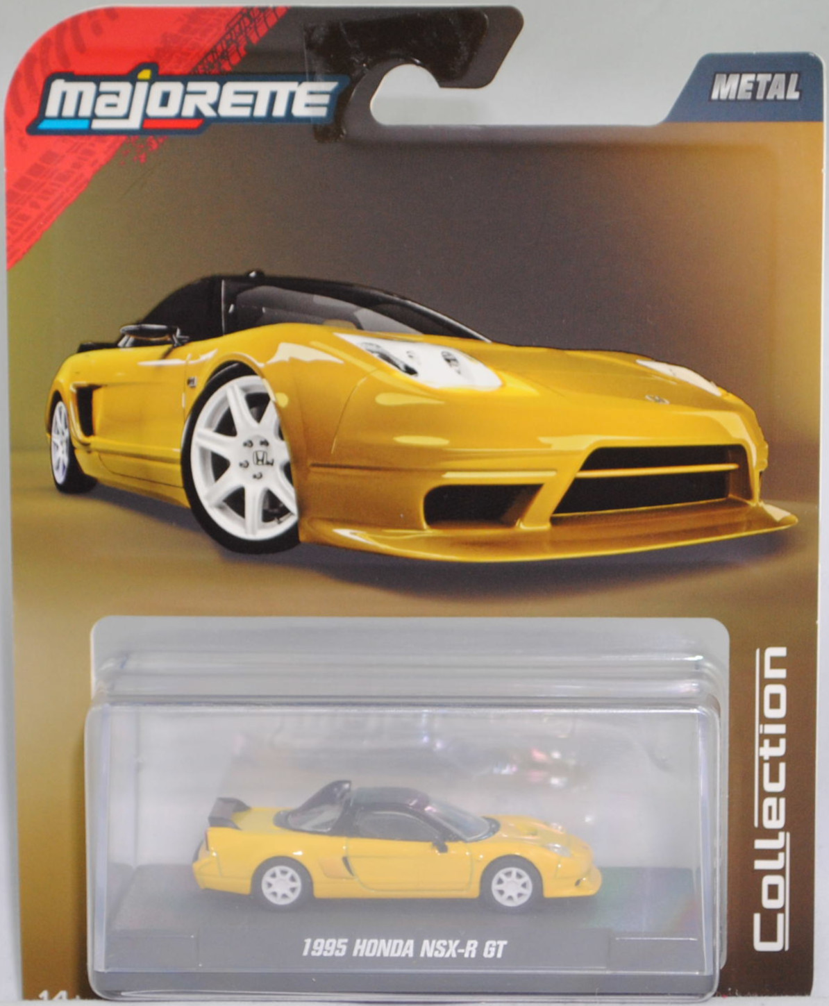 Honda NSX-R GT (1. Generation, Baureihe NSX (New Sportscar eXperimental), 2. Baureihe, interne Baureihenbezeichnung NA-2, zweitüriger Sportwagen als Coupé mit 2 Sitzplätzen, Facelift seit 2001 zum Modelljahr 2002, feststehende Xenon-HID-Frontscheinwerfer, Ziffernblätter der Instrumente in blau, überarbeitetes Fahrwerk mit breiteren Hinterreifen, Seitenschweller etwas verbreitert, in Handarbeit gebaute limitierte Auflage für Japan auf Basis des NSX-R: 5 Fahrzeuge, Homologationsmodell für die Rennserien JGTC (All Japan Grand Touring Car Championship) und Super GT, Ausstattungslinie NSX-R GT: Karosserie um 180 mm verlängert und um 90 mm verbreitert + verlängerte Frontspoilerlippe + vergrößerte Lufteinlässe auf den Seiten hinter den Türen + großer Heckdiffusor + nicht funktionsfähiger Schnorchel an der Heckscheibe, 6-Gang-Schaltgetriebe mit niedriger Endübersetzung, Hinterradantrieb, Motor: Honda Typ C32B2 wassergekühlter Sechszylinder-V-Viertakt-Otto mit Mehrpunkteinspritzung und zwei obenliegende Nockenwelle (DOHC = Double Overhead Camshaft) je Zylinderbank sowie 4 Ventile pro Zylinder und 3179 cm³ sowie 290 PS, Radstand 2530 mm, Länge 4610 mm, Modell 2005-2005), verkehrsgelb, innen schwarz, Sitze schwarz (vgl. Recaro-Carbon-Kevlar-Sitze mit feuerfestem roten Stoffbezug beim Original), Lenkrad schwarz (RHD = Right Hand Drive, Rechtslenker, Momo-Lederlenkrad ohne Airbag), Dach sowie A- und C-Säule schwarz, Schnorchel an der Heckscheibe schwarz, geschmiedete leichte BBS-Leichtmetallräder im 7-Speichen-Design in championship white vorne Größe 7 J x 17 ET 55 mit Lochkreis 5 x 114,3 und Nabendeckel / Radzierdeckel (Farbcode championship white mit Honda-Logo in rot) sowie Bridgestone Potenza Reifen 215/40 ZR17 bzw. hinten Größe 9 J x 17 ET 55 mit Lochkreis 5 x 114,3 und Nabendeckel / Radzierdeckel (Farbcode championship white mit Honda-Logo in rot) sowie Bridgestone Potenza Reifen 255/40 ZR17, majorette, 1:64, PC-Box im Blister (Collection) (EAN 3467452078754)