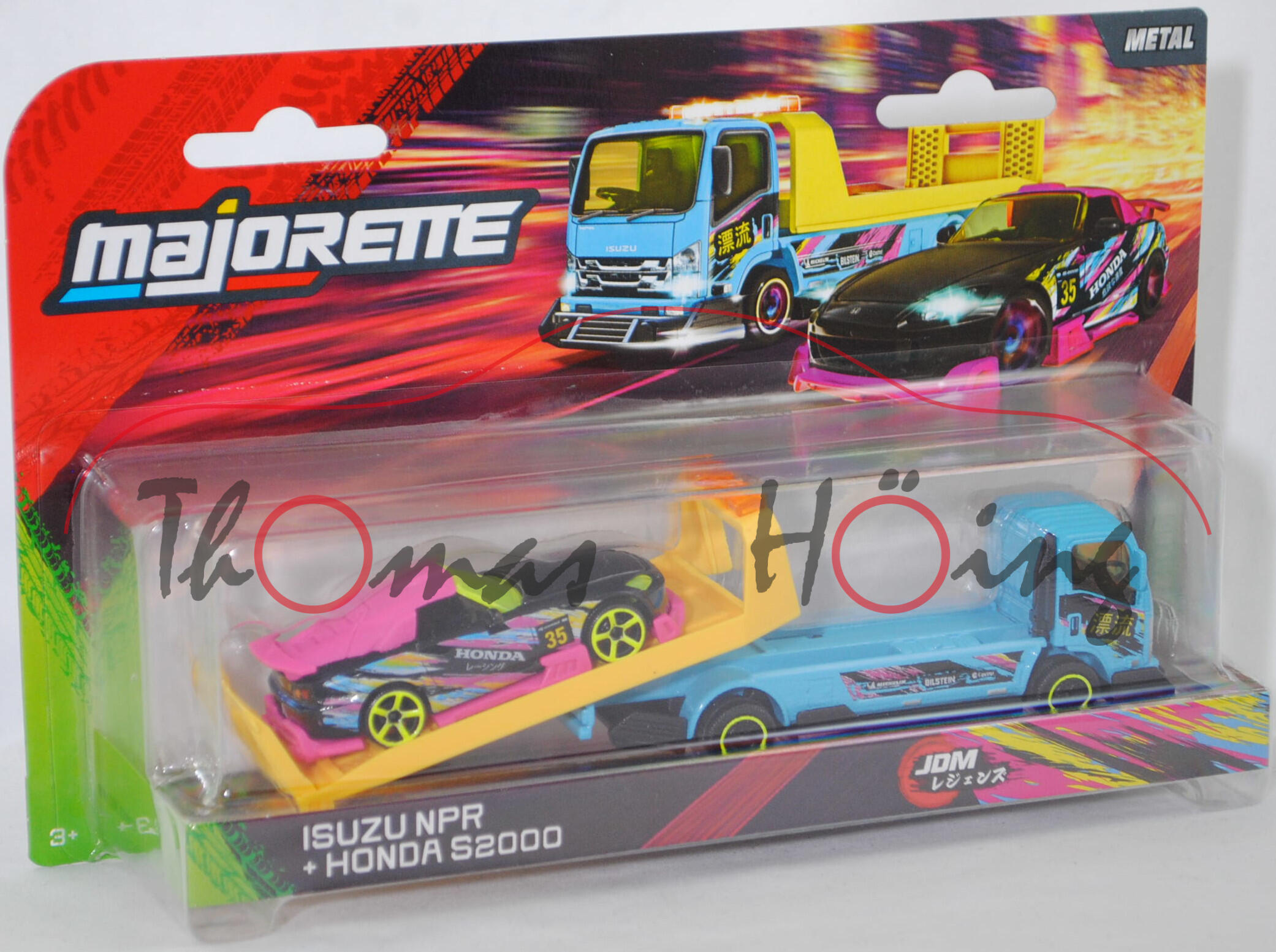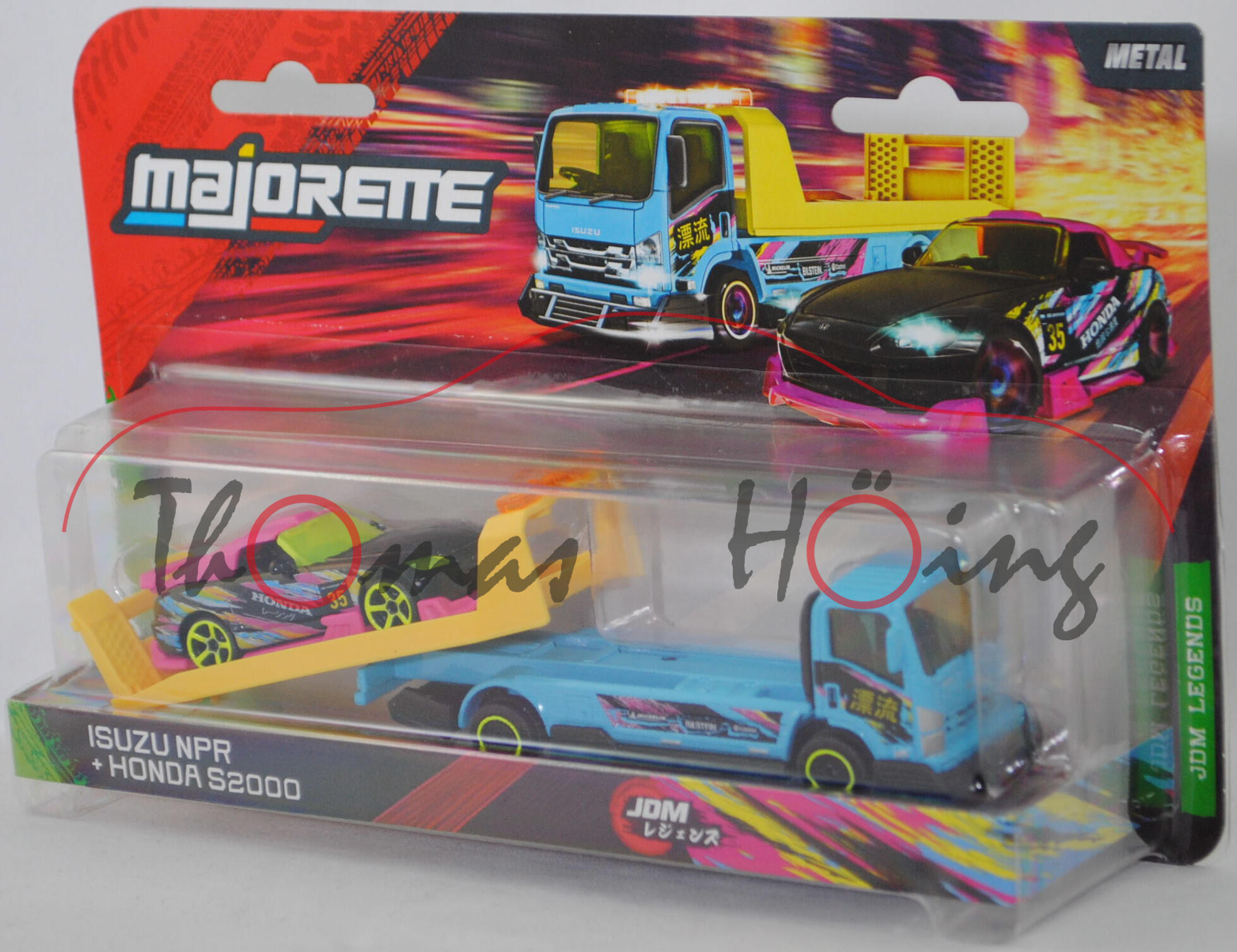 ISUZU NPR75 4x2 (6. Generation, Baureihe N-Serie bzw. Elf, Typ N75, leichter Lastkraftwagen mit 3 Sitzplätzen, Facelift 2016, Kühlergrill mit zwei waagerechten Streben und zwei zusätzlichen schrägen Streben, Ausstattungslinie NPR / N75: breite Fahrerhauskabine, zulässiges Gesamtgewicht 7500 kg, manuelles 6-Gang-Schaltgetriebe, Hinterradantrieb, Motor: ISUZU Typ 4HK1-TCS wassergekühlter Vierzylinder-Reihen-Viertakt-Diesel mit VTG-Turbolader (variable Turbinen-Geometrie) und Common-Rail-Hochdruck-Direkteinspritzung mit elektronischer Steuerung sowie eine obenliegende Nockenwelle (SOHC = Single Overhead Camshaft) und 4 Ventile pro Zylinder sowie Ladeluftkühlung und 5193 cm³ sowie 190 PS, Fahrerhauslänge 1680 mm, Fahrerhausbreite 2040 mm, Länge Aufbau 6135 mm, Radstand 4475 mm, Länge 7815 mm, Modell 2016-2023) Plateaufahrzeug mit Schiebeplateau (Abschleppwagen) (Nr. 3A31) mit Honda S2000 (1. Generation, Baureihe S2000, interne Baureihenbezeichnung AP1, zweitüriger Roadster mit 2 Sitzplätzen, Facelift 2004, große Lüftungsöffnung im vorderen Stoßfänger mit einem zurückgesetzten senkrechten Steg rechts und links, Stoßfänger hinten im unteren Bereich zur Innenseite gezogen, Stoßfänger vorne und hinten im unteren Bereich verjüngt, LED-Rückleuchten mit 3 runden Leuchten je Seite, Auspuffendrohre oval, Ausstattungslinie Roadster: Außenspiegel in Wagenfarbe + Türgriffe in Wagenfarbe + manuelle Klimaanlage mit Pollenfilter + gelochte Aluminiumpedale + elektrisches Dach + elektrische Fensterheber vorne + Kosmetikspiegel mit Deckel in der Beifahrer-Sonnenblende + Stereo-CD-Tuner mit RDS, 6-Gang-Schaltgetriebe, Heckantrieb, Motor: Honda Typ 2.0 VTEC wassergekühlter Vierzylinder-Reihen-Viertakt -Otto mit Mehrpunkteinspritzung und zwei obenliegende Nockenwellen (DOHC = Double Overhead Camshaft) sowie 4 Ventile pro Zylinder mit variabler Ventilsteuerung (VTEC = Variable Valve Timing and Lift Electronic Control) und 1997 cm³ sowie 240 PS, Motorcode F20C (JDM = Japanese Domestic Market bzw. Japanischer Inlandsmarkt), Radstand 2400 mm, Länge 4135 mm, Modell 2004-2009) (Nr. 212D), Abschleppwagen: Fahrerhaus hell-lichtblau, innen schwarz, Sitze schwarz, Lenkrad schwarz (RHD = Right Hand Drive, Rechtslenker), Druck Streifen in erikaviolett/schwarz/verkehrsgelb auf den Türen des Fahrerhauses, Schiebeplateau und Auffahrrampe verkehrsgelb, orangetransparente Warnleiste vorne auf dem Schiebeplateau, Radkästen hell-lichtblau, seitliche Schutzvorrichtung und Unterfahrschutz hell-lichtblau, Druck Michelin-Männchen und MICHELIN / BILSTEIN / Castrol in reinweiß auf schwarz sowie Streifen in erikaviolett/schwarz/verkehrsgelb auf der seitlichen Schutzvorrichtung, Fahrgestell schwarz, Verglasung rauch, 6-Arm-Felgen in schwarz mit Felgenrand in leuchtgelb (ISUZU Stahlfelgen Größe 17,5 Zoll mit Reifen 215/75 R 17,5), Beilage: Bodykit und Tuning-Zubehör, ca. 1:68; Ladegut: schwarz (vgl. berlina black beim Original, Farbcode NH547-T), innen schwarz, Sitze schwarz (vgl. Leder in schwarz beim Original), Lenkrad schwarz (RHD = Right Hand Drive, Rechtslenker, vgl. lederummantelt in schwarz beim Original), Druck HONDA / S2000 in reinweiß und 35 in verkehrsgelb sowie Streifen in erikaviolett/lichtblau/reinweiß/zinkgelb auf den Seiten, Druck Honda-Logo in silber vor der Motorhaube und auf der Heckklappe, Motor unlackiert, Motorhaube zu öffnen und abnehmbar, Verglasung leuchtgelb, 5-Arm-Felgen in leuchtgelb (Honda 17 Zoll Leichtmetallräder im 10-Speichen-Design vorne Größe 7 JJ x 17 ET 55 mit Lochkreis 5 x 114,3 (Teilenummer 63872, Farbcode silber) und Radzierkappen / Nabendeckel (Teilenummer P8397, Farbcode silber mit Honda-Logo in schwarz) sowie Bridgestone Potenza RE050 Reifen 215/45 ZR 17 87W bzw. hinten Größe 8,5 JJ x 17 ET 65 mit Lochkreis 5 x 114,3 (Teilenummer 63873, Farbcode silber) und Radzierkappen / Nabendeckel (Teilenummer P8397, Farbcode silber mit Honda-Logo in schwarz) sowie Bridgestone Potenza RE050 Reifen 245/40 ZR 17 91W), Beilage: Bodykit und Tuning-Zubehör, 1:57, majorette, Blister (JDM Legends (JDM = Japanese Domestic Market bzw. Japanischer Inlandsmarkt) Tuning Transporter) (EAN 3467452076927)