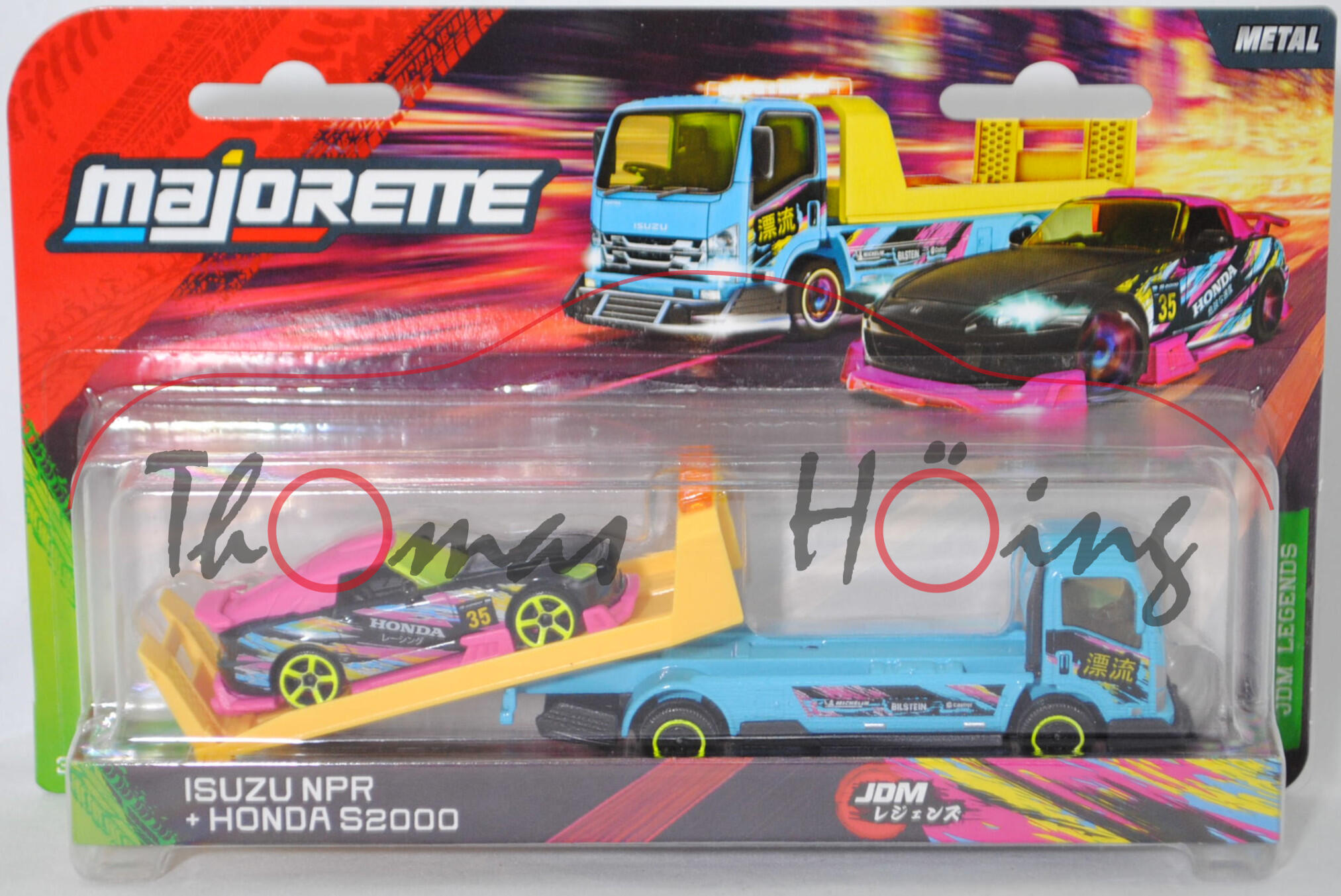 ISUZU NPR75 (Modell 2016-2023) Abschleppwagen mit Honda S2000 (Modell 2004-2009), Abschleppwagen: blau; Ladegut: schwarz, majorette, Blister (JDM Legends Tuning Transporter)
