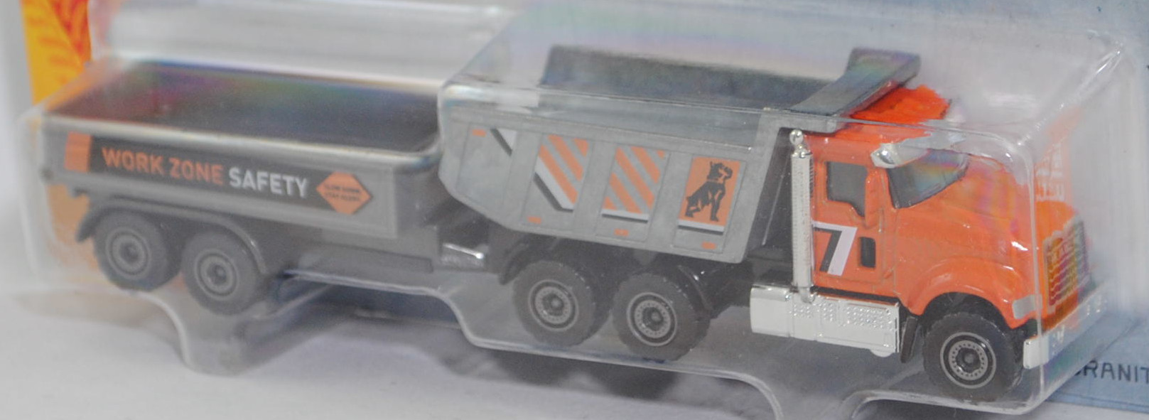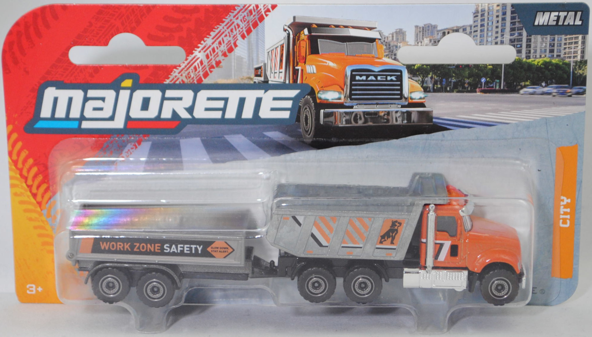 MACK Granite 6x4 (2. Generation, Baureihe Grantie, Typ dreiachsige Sattelzugmaschine, Fahrerhaus Day Cab, Kühlergrill mit 4 waagerechten Streben unter dem MACK Schriftzug, Hinterradantrieb über alle vier Räder, Radstand 4300 mm, Länge vordere Stoßstange bis Hinterkante Kabine 2850 mm (112'' BBC (bumper to back cab lenght)), Gesamtlänge 7160 mm, Modell 2019-) Kipper (Nr. 289B) mit Tandem-Anhänger (Typ 2-Achs-Anhänger als Hochlader), Zugfahrzeug: Fahrerhaus und Motorhaube rotorange (vgl. ähnlich burnt orange beim Original, Farbcode N6893EA), innen schwarz, Sitze schwarz, Lenkrad schwarz, Druck Streifen in reinweiß/schwarz auf den Seiten des Fahrerhauses, Rahmen des Kühlergrill und Streben des Kühlgrills silber lackiert, Schriftzug MACK im Kühlergrill silber, Sonnenschutz chrom, Auspfuff chrom, Stoßstange chrom, Tank (linke Seite) und Abgasreinigungsanlage (rechte Seite) sowie Aufstiege zum Fahrerhaus chrom, Plattform hinter dem Fahrerhaus schwarz, Kippmulde silbergrau, Druck Streifen in schwarz/reinweiß/pastellorange und Mack-Bulldogge in schwarz auf den Seiten der Kippmulde, Chassis mit Anhängerkupplung (AHK) schwarz, Felgen graualuminiummetallic, 1:87; Anhänger: Ladefläche und Heckklappe silbergrau, Druck Streifen in reinorange/schwarz und WORK ZONE SAFETY sowie SLOW DOWN. / STAY ALERT. in reinorange/reinweiß/schwarz auf den Seiten der Bordwände, Fahrgestell mit Deichsel dunkel-quarzgraumetallic, Chassis schwarz, Heckklappe zu öffnen, Felgen graualuminiummetallic, majorette, Blister (CITY Trailer Set) (EAN 3467452077498)