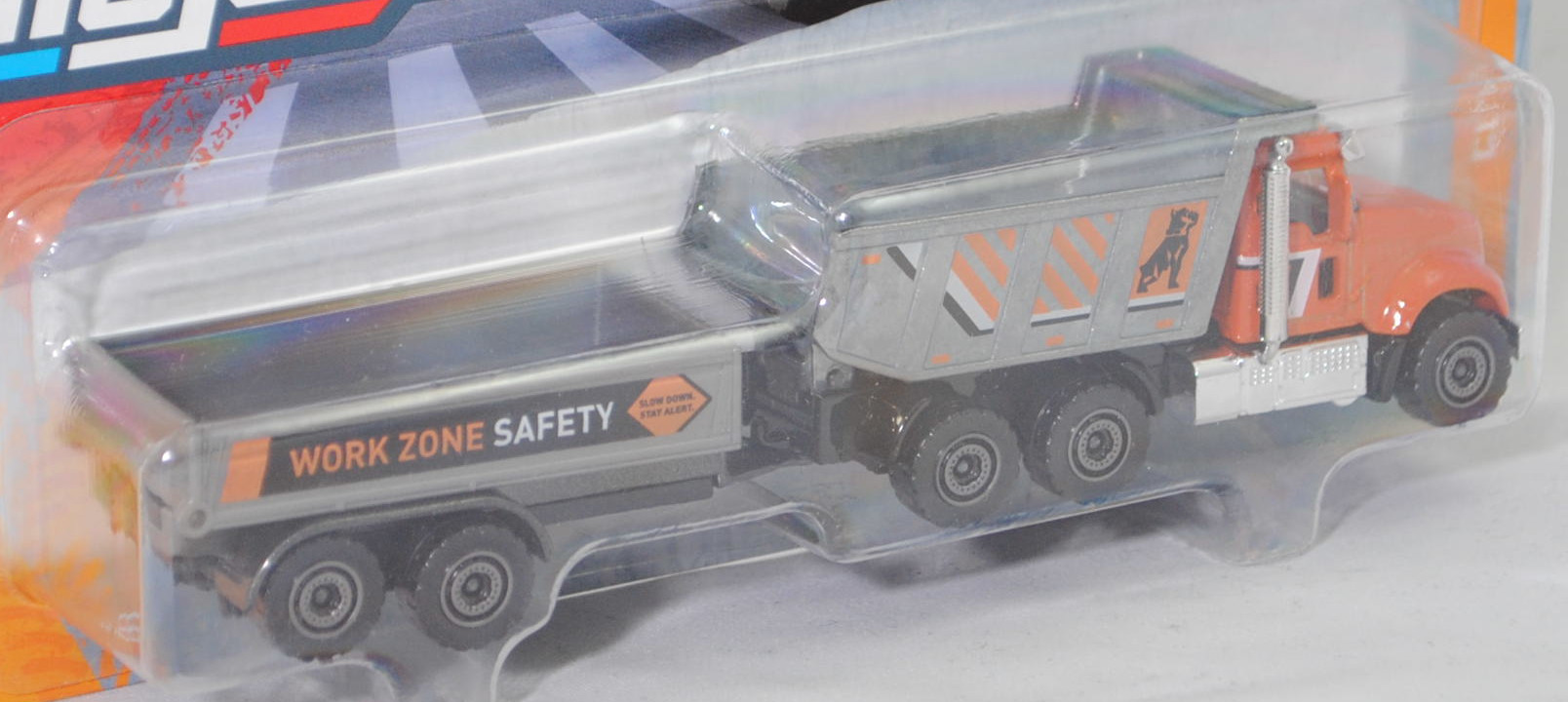 Produktinformationen "MACK Granite 6x4 (Modell 2019-) Kipper mit Tandem-Anhänger, rotorange/silbergrau, WORK ZONE SAFETY / SLOW DOWN. / STAY ALERT., majorette, Blister (CITY Trailer Set)"