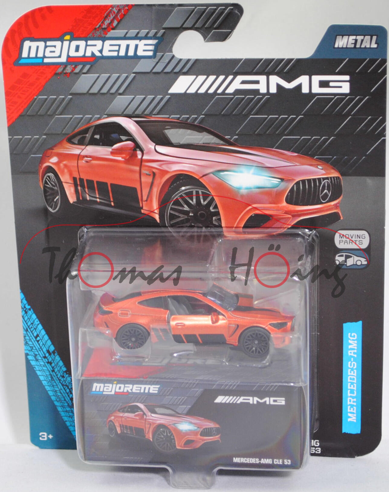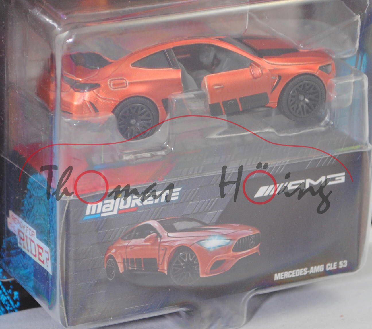 Mercedes-AMG CLE 53 4Matic+ Coupé Premium (1. Generation, Baureihe CLE Coupé, interne Baureihenbezeichnung C 236, zweitüriges Coupé mit 4 Sitzplätzen, Ausstattungslinie AMG CLE 53 4Matic+ Premium: Kühlergrill im Panamericana-Design mit 14 hervorstehenden senkrechten Lamellen in chrom + Mercedes-AMG Exterieur (PUF) inklusive AMG-Styling + Mercedes-AMG Interieur (PTF) + Zentraldisplay mit 30,2 cm (11,9'') Bildschirmdiagolale (868) Fahrerdisplay mit einem 31,2 cm (12,3'') großen LCD-Farbdisplay (464) + Mittelkonsole in schwarz hochglänzend (757) + AMG Einstiegsleisten mit AMG-Schriftzug beleuchtet und mit Wechselcover (U45) + AMG Abrisskante am Heck (U95) + Hinterachslenkung (201) + 19 Zoll AMG Leichtmetallräder im 10-Speichen-Design (RRD), Sonderausstattung gegen Mehrpreis: Panorama-Schiebedach (413), AMG SPEEDSHIFT TCT 9G (9-Gang-Automatikgetriebe, TCT = Torque-Clutch Transmission), Allradantrieb 4Matic+, Motor: Mercedes-AMG Typ M 256 E30 DEH LA G (M = Ottomotor der Baureihe 256 mit 30 Deziliter Hubraum und Direkteinspritzung (DE) sowie homogenem Kraftstoff-Luft-Gemisch (H) und Ladeluftkühler (L) sowie Abgasturbolader (A) und boostfähiger Starter-Generator (G)) wassergekühlter Sechszylinder-Reihen-Viertakt-Otto mit Abgasturbolader und elektrisch angetriebenem Zusatzverdichter sowie Direkteinspritzung und zwei obenliegende Nockenwelle (DOHC = Double Overhead Camshaft) sowie 4 Ventile pro Zylinder und Ladeluftkühler sowie 2999 cm³ und 449 PS, Baumuster Motor: 256.830, zusätzlicher Elektromotor zwischen Verbrennungsmotor und Getriebe als Riemen-Starter-Generator mit 23 PS und Lithium-Ionen-Batterie mit 0,9 kWh brutto, Systemleistung 472 PS, Radstand 2875 mm, Länge ohne Anhängerkupplung (AHK) 4853 mm, Modell 2023-) (Nr. 232Q), kupfermetallic, innen hell-staubgrau, Sitze hell-staubgrau (vgl. Sportsitze mit integrierter Kopfstütze mit Mercedes-AMG spezifischem Nahtbild und Polsterung in Ledernachbildung ARTICO/Mikrofaser MICROCUT AMG schwarz mit roten Kontrastziernähten (651A) beim Original), Lenkrad hell-staubgrau, Druck Streifen in schwarz unten auf den Seiten, Druck zwei Streifen in schwarz auf der Motorhaube und vorne auf dem Dach, Türen zu öffnen, 10-Y-Speichen-Felgen in schwarzgrau (AMG Leichtmetallräder im 10-Speichen-Design (Ausstattungcode RRD) aerodynamisch optimiert und schwarz matt lackiert sowie glanzgedreht vorne Größe 9,5 J x 19 ET 19 mit Lochkreis 5 x 112 (Teilenummer A 236 401 27 00, Farbcode 7X36 schwarz matt glanzgedreht) und Radzierkappen / Nabendeckel (Farbcode schwarz mit Mercedes-Benz-Stern in chrom) sowie Reifen 265/40 ZR 19 102Y bzw. hinten Größe 11 J x 19 ET 24 mit Lochkreis 5 x 112 (Teilenummer A 236 401 28 00, Farbcode 7X36 schwarz matt glanzgedreht) und Radzierkappen / Nabendeckel (Farbcode schwarz mit Mercedes-Benz-Stern in chrom) sowie Reifen 295/35 ZR 19 104Y), mit Sammelschachtel, majorette, ca. 1:66, Blister (MERCEDES-AMG DELUXE CARS) (EAN 3467452077146)