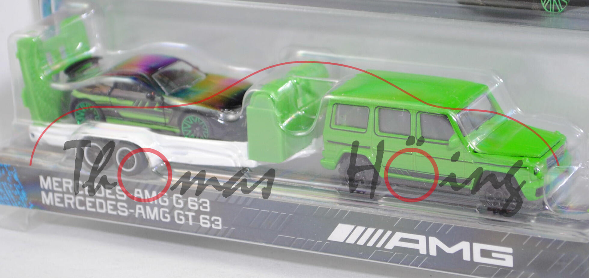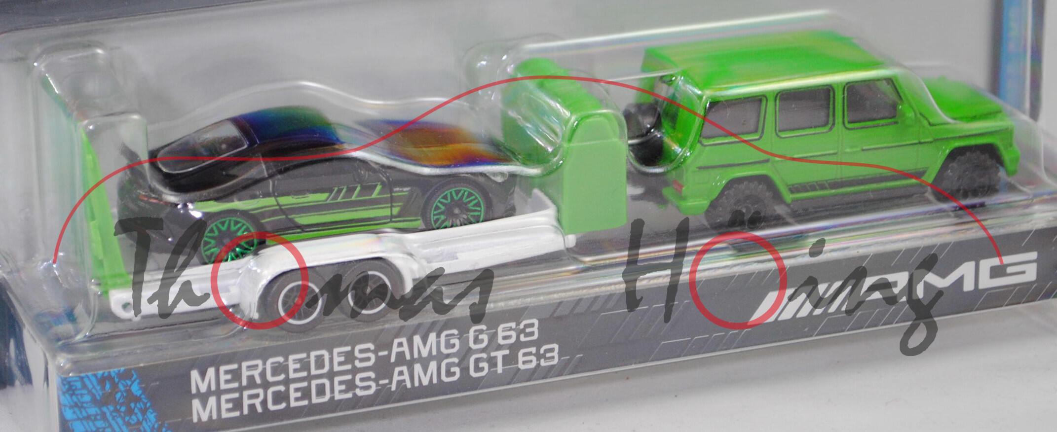Mercedes-AMG G 63 (3. Generation G-Klasse, Baureihe G-Klasse AMG Station-Wagen lang, interne Baureihenbezeichnung W 463, Baumuster 463.272-13, fünftüriger Geländewagen mit 5 Sitzplätzen, 5. MoPf (Modellpflege, Facelift) von 2015 zum Modelljahr 2016, Änderung der Modellbezeichnung in Mercedes-AMG G 63, Erhöhung der Motorleistung auf 571 PS, Schriftzug AMG hinten links neben der Hecktür und G 63 hinten rechts neben der Hecktür, Ausstattungslinie Mercedes-AMG G 63: AMG Styling bestehend aus spezifischer Frontschürze mit schwarzen Kühllufteinlässen und AMG Kotflügelverbreiterung in Wagenfarbe lackiert + AMG Kühlergrill mit verchromter Doppellamelle und schwarzem Gitter sowie AMG Schriftzug in der Doppellamelle + AMG Einstiegsschienen weiß beleuchtet in Edelstahl massiv, glänzend mit AMG Schriftzug 4-fach + Außenschutzleiste mit Einleger in gebürsteter Aluminium-Optik mit AMG Schriftzug + designo Polsterung Leder einfarbig, Türmittelfelder oben und unten in gerafftem Leder + AMG Performance Lenkrad in Leder Nappa schwarz + designo Zierelemente Klavierlack schwarz inkl. Haltegriff Beifahrerseite + Instrumententafel beledert schwarz + AMG Wählhebel mit AMG Wappen + AMG Sportabgasanlage mit zwei verchromten Doppelendrohrblenden seitlich links und rechts + V8 BITURBO Schriftzug an Fahrzeugseiten + Metallic-Lackierung + Leichtmetallräder im 5-Doppelspeichen-Design in titangrau lackiert und glanzgedreht + Reserverad an der Hecktür, AMG SPEEDSHIFT PLUS 7G-TRONIC (7-Gang-Doppelkupplungsgetriebe, Automatik), permanenter Allradantrieb, Motor: Mercedes-AMG Typ M 157 DE 55 AL (M = Ottomotor der Baureihe 157 mit 55 Deziliter Hubraum und Direkteinspritzung (DE) sowie Abgasturbolader (A) und Ladeluftkühler (L)) wassergekühlter Achtzylinder-V-Viertakt-Biturbo-Otto mit Benzindirekteinspritzung und zwei obenliegende Nockenwellen (DOHC = Double Overhead Camshaft) sowie 4 Ventile pro Zylinder und Ladeluftkühler sowie 5461 cm³ und 571 PS, Motor Baumuster 157.984, Radstand 2850 mm, Länge 4662 mm, Modell 2015-2017) (Nr. 250B) mit offenem zweiachsigen Motorsport-Autotransporter (R17A) und Mercedes-AMG GT 63 4Matic+ Premium (2. Generation GT, Baureihe AMG GT Coupé, interne Baureihenbezeichnung C 192, Baumuster 254.680, zweitüriger Sportwagen als Coupé mit 4 Sitzplätzen, Ausstattungslinie AMG Premium: Premium-Paket (PSC) mit Ambientebeleuchtung (891), GUARD 360° Fahrzeugschutz Plus (P82), Lenkradheizung (443), AMG Real Performance Sound (339), AMG Lichtinszenierung (588) + AMG spezifische Kühlerverkleidung mit vertikalen Streben in hochglanzchrom und AMG Schriftzug + V8-spezifisches Frontdesign mit optisch tief ausgeschnittener Kühlerverkleidung und großen Lufteinlässen vorne + V8-spezifisches Heckschürzendesign mit optischen Luftauslässen hinten und trapezförmigen Doppelendrohrblenden in hochglanzchrom links und rechts + V8-spezifische ausgestellte Kotflügel vorn und hinten + Motorhaube mit Powerdomes + AMG DYNAMIC PLUS Paket (P71) mit AMG Bremssättel gelb lackiert (U69), Fahrprogramm RACE inklusive Drift-Modus, AMG Hinterachs-Sperrdifferenzial elektronisch (467), Fahrwerk mit 10 mm Tieferlegung + AMG Performance Lenkrad in Leder Nappa (L6J) + AMG Sportsitze mit Polsterung in Leder Nappa schwarz (801A) + Sonnenblende ausziehbar (543) + Innenhimmel Stoff schwarz (51U) + AMG Zierelemente in schwarz hochglänzend (H80) + Typkennzeichnung auf vorderen Kotflügeln und Heckdeckel + AMG ACTIVE RIDE CONTROL Fahrwerk (470) + 20 Zoll AMG Leichtmetallräder im 10-Doppelspeichen-Design (RTM), Sonderausstattung gegen Mehrpreis: großzügiges festes Glasdach als Panoramadach mit mechanischem Sonnenschutzrollo (416) + AMG Aerodynamik-Paket (B26) bestehend aus Frontschürze mit Flics an den Lufteinlässen und Radhäusern in hochglanzschwarz AMG sowie Heckschürze mit Flics an den seitlichen Luftauslässen in hochglanzschwarz und Diffusor-Aufsatz am Heck in hochglanzschwarz sowie Heckflügel feststehend (U94) in hochglanzschwarz, AMG SPEEDSHIFT MCT 9G (9-Gang-Automatikgetriebe, MCT = Multi Clutch Technology), Allradantrieb 4Matic+, Motor: Mercedes-AMG Typ M 177 DE 40 AL (M = Ottomotor der Baureihe 177 mit 40 Deziliter Hubraum und Direkteinspritzung (DE) sowie Abgasturbolader (A) und Ladeluftkühler (L)) wassergekühlter Achtzylinder-V-Viertakt-Otto mit zwei Twin-Scoll-Turbolader (Abgasturbolader) und Direkteinspritzung sowie zwei obenliegende Nockenwelle (DOHC = Double Overhead Camshaft) je Zylinderbank und 4 Ventile pro Zylinder sowie Ladeluftkühler und 3982 cm³ sowie 585 PS, Baumuster Motor: 177.880, Radstand 2700 mm, Länge 4728 mm, Modell 2023-) (Nr. 232N), Zugfahrzeug: gelbgrün, innen schwarz, Sitze schwarz, Lenkrad schwarz, Druck Streifen in schwarz unten auf den Seiten, Abdeckung Reserverad an der Hecktür schwarz, Motorhaube zu öffnen, mit AHK (Anhängerkupplung), 8-Loch-Felgen in schwarz (Mercedes-AMG Leichtmetallräder im 5-Doppelspeichen-Design in titangrau lackiert und glanzgedreht Größe 9,5 J x 20 ET 50 mit Lochkreis 5 x 130 (Teilenummer A4634013002 bzw. B66031528, Farbcode titangrau) und Nabendeckel / Radzierdeckel (Ø 75 mm, Teilenummer A2204000125, Farbcode graumetallic) sowie Reifen 275/50 R 20 113W), 1:61; Anhänger: Fahrgestell mit Zugdeichsel reinweiß, Auffahrrampe gelbgrün, Staubox mit Regal für Reifen und Benzinkanister sowie Seilwinde gelbgrün, 6-Doppelspeichen-Felgen in schwarz mit Felgenrand in reinweiß; Ladegut: schwarz, innen schwarz, Sitze schwarz, Lenkrad schwarz, Druck Streifen in gelbgrün auf den Seiten, Türen zu öffnen, 10-V-Speichen-Felgen in grünmetallic/schwarzgrau (AMG Leichtmetallräder im 10-Doppelspeichen-Design aerodynamisch optimiert Design in tantalgrau lackiert und glanzgedreht (Ausstattungcode RTM) vorne Größe 10,5 J x 20 ET 42 mit Lochkreis 5 x 112 (Teilenummer A 192 400 10 00, Farbcode tantalgrau lackiert und glanzgedreht) und Nabendeckel / Radzierdeckel (Farbcode grau mit Mercedes-Benz-Stern in chrom) sowie Reifen 295/35 ZR 20 105Y