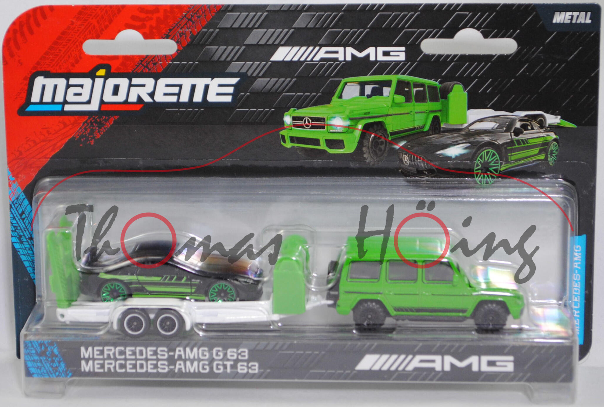 Mercedes-AMG G 63 (Modell 2015-2017) mit Autotransporter und Mercedes-AMG GT 63 4Matic+ (Modell 2023-), gelbgrün + reinweiß/gelbgrün + schwarz, majorette, Blister