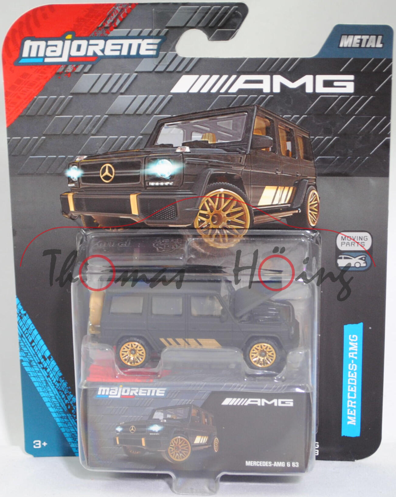 Mercedes-AMG G 63 (3. Generation G-Klasse, Baureihe G-Klasse AMG Station-Wagen lang, interne Baureihenbezeichnung W 463, Baumuster 463.272-13, fünftüriger Geländewagen mit 5 Sitzplätzen, 5. MoPf (Modellpflege, Facelift) von 2015 zum Modelljahr 2016, Änderung der Modellbezeichnung in Mercedes-AMG G 63, Erhöhung der Motorleistung auf 571 PS, Schriftzug AMG hinten links neben der Hecktür und G 63 hinten rechts neben der Hecktür, Ausstattungslinie Mercedes-AMG G 63: AMG Styling bestehend aus spezifischer Frontschürze mit schwarzen Kühllufteinlässen und AMG Kotflügelverbreiterung in Wagenfarbe lackiert + AMG Kühlergrill mit verchromter Doppellamelle und schwarzem Gitter sowie AMG Schriftzug in der Doppellamelle + AMG Einstiegsschienen weiß beleuchtet in Edelstahl massiv, glänzend mit AMG Schriftzug 4-fach + Außenschutzleiste mit Einleger in gebürsteter Aluminium-Optik mit AMG Schriftzug + designo Polsterung Leder einfarbig, Türmittelfelder oben und unten in gerafftem Leder + AMG Performance Lenkrad in Leder Nappa schwarz + designo Zierelemente Klavierlack schwarz inkl. Haltegriff Beifahrerseite + Instrumententafel beledert schwarz + AMG Wählhebel mit AMG Wappen + AMG Sportabgasanlage mit zwei verchromten Doppelendrohrblenden seitlich links und rechts + V8 BITURBO Schriftzug an Fahrzeugseiten + Metallic-Lackierung + Leichtmetallräder im 5-Doppelspeichen-Design in titangrau lackiert und glanzgedreht + Reserverad an der Hecktür, AMG SPEEDSHIFT PLUS 7G-TRONIC (7-Gang-Doppelkupplungsgetriebe, Automatik), permanenter Allradantrieb, Motor: Mercedes-AMG Typ M 157 DE 55 AL (M = Ottomotor der Baureihe 157 mit 55 Deziliter Hubraum und Direkteinspritzung (DE) sowie Abgasturbolader (A) und Ladeluftkühler (L)) wassergekühlter Achtzylinder-V-Viertakt-Biturbo-Otto mit Benzindirekteinspritzung und zwei obenliegende Nockenwellen (DOHC = Double Overhead Camshaft) sowie 4 Ventile pro Zylinder und Ladeluftkühler sowie 5461 cm³ und 571 PS, Motor Baumuster 157.984, Radstand 2850 mm, Länge 4662 mm, Modell 2015-2017) (Nr. 250B), mattschwarz, innen gold, Sitze gold, Lenkrad gold, Druck Streifen in gold unten auf den Seiten, Abdeckung Reserverad an der Hecktür gold, Motorhaube zu öffnen, mit AHK (Anhängerkupplung), 10-Y-Speichen-Felgen in gold (Mercedes-AMG Leichtmetallräder im 5-Doppelspeichen-Design in titangrau lackiert und glanzgedreht Größe 9,5 J x 20 ET 50 mit Lochkreis 5 x 130 (Teilenummer A4634013002 bzw. B66031528, Farbcode titangrau) und Nabendeckel / Radzierdeckel (Ø 75 mm, Teilenummer A2204000125, Farbcode graumetallic) sowie Reifen 275/50 R 20 113W), mit Sammelschachtel, majorette, 1:61, Blister (MERCEDES-AMG DELUXE CARS) (EAN 3467452077146)