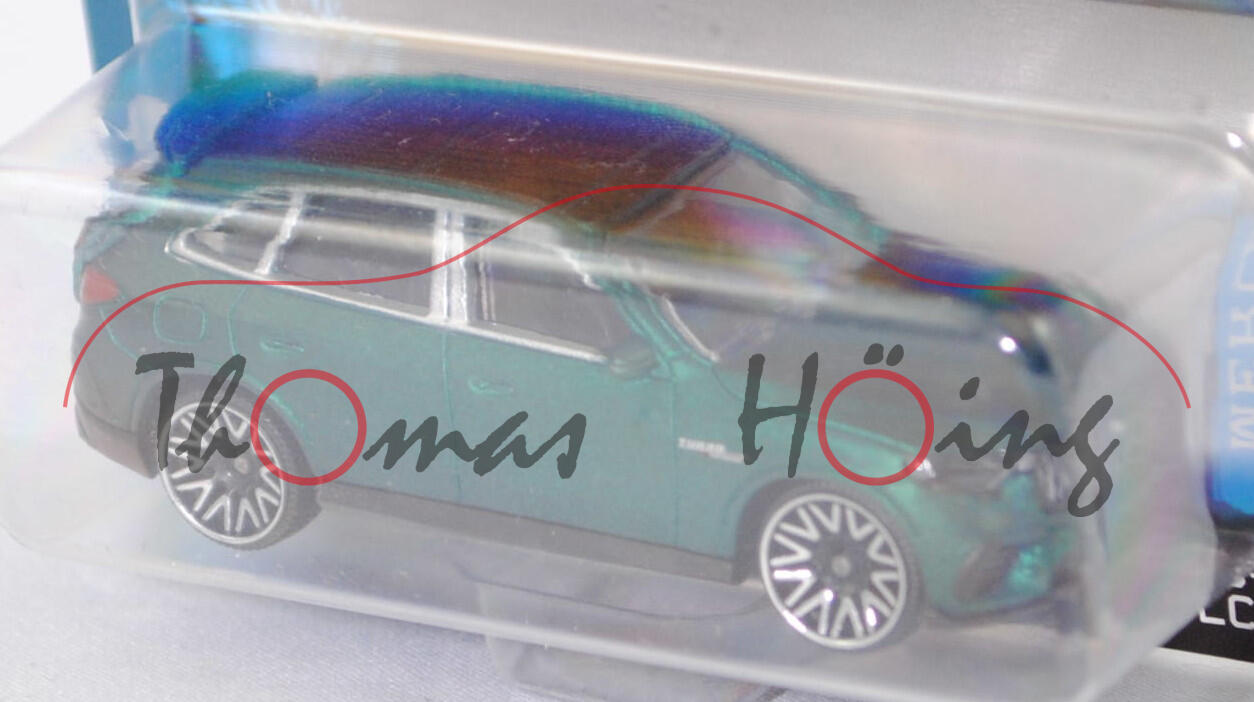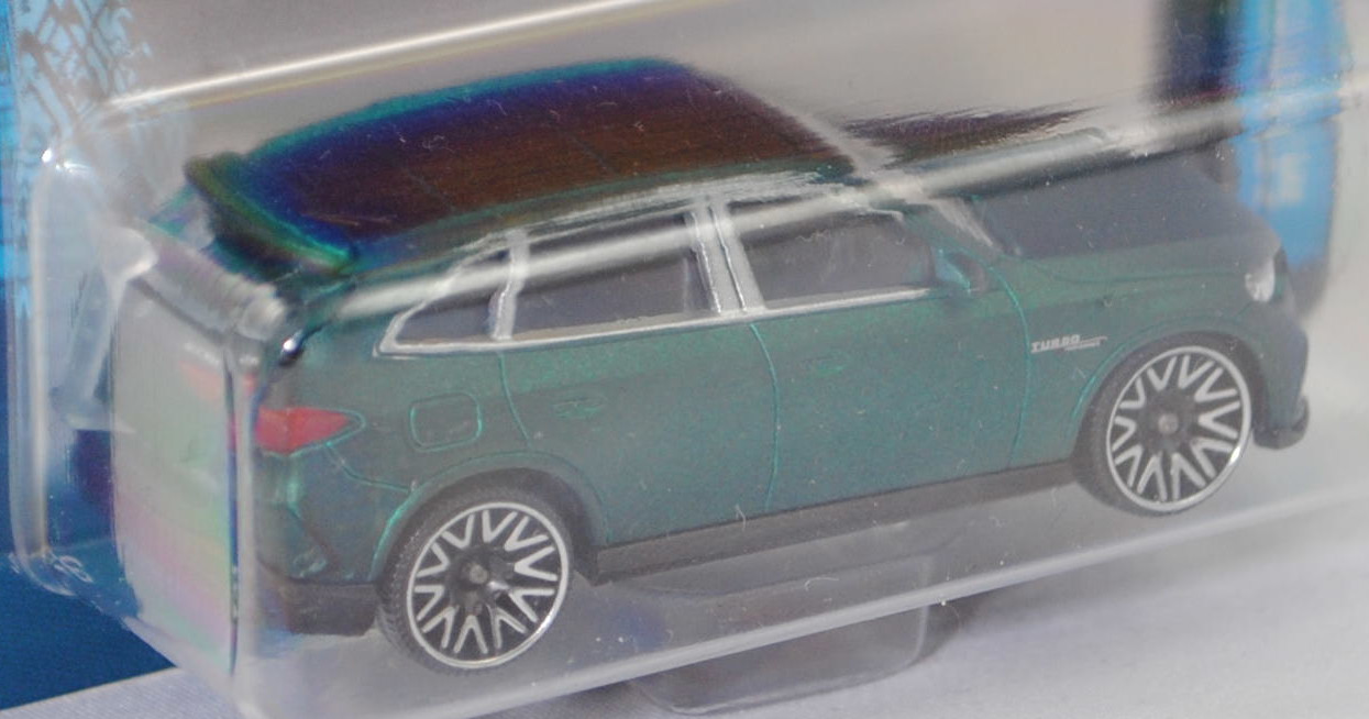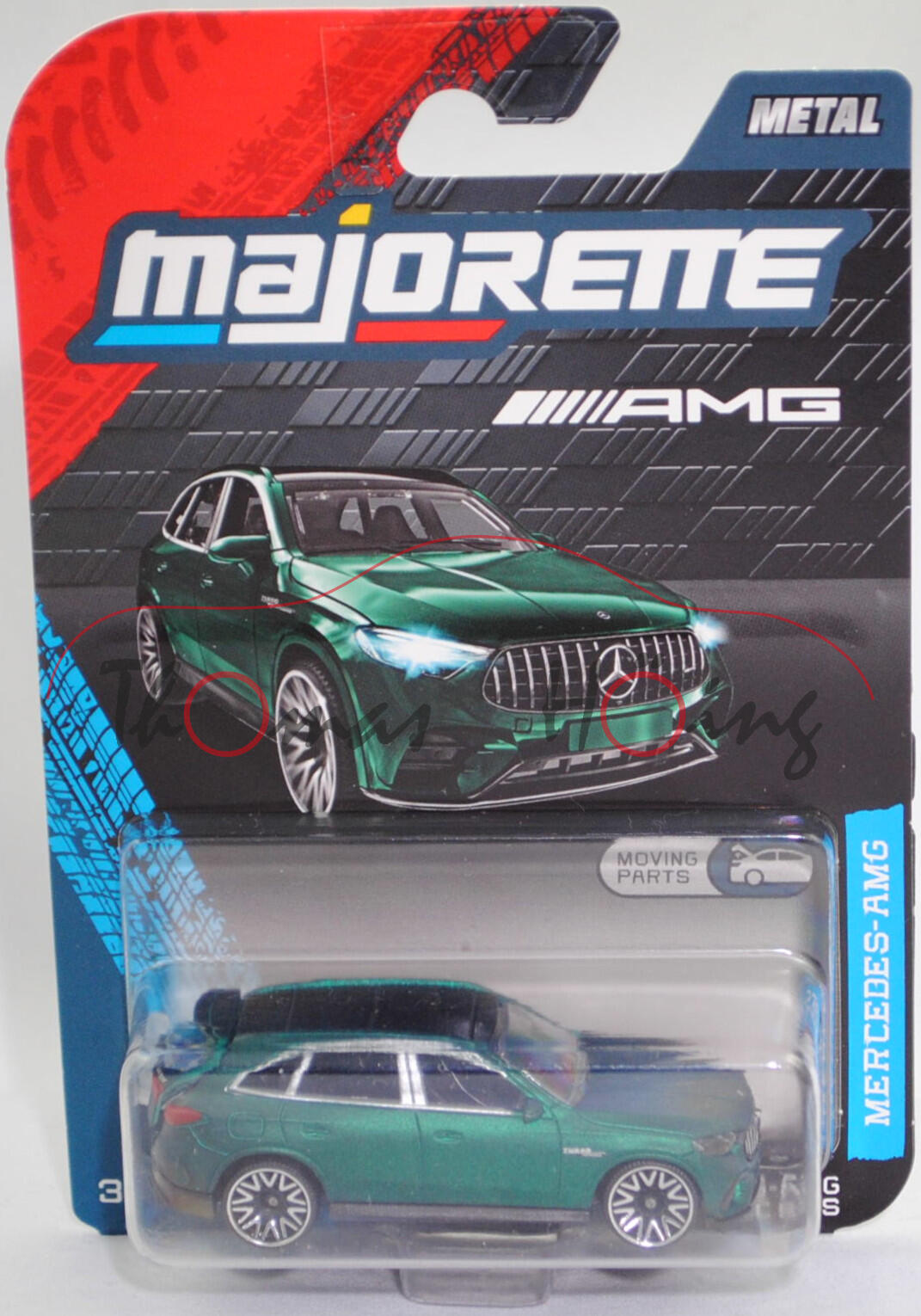 Mercedes-AMG GLC 63 S E PERFORMANCE Premium (2. Generation GLC, Baureihe GLC AMG, interne Baureihenbezeichnung X 254, Baumuster 254.680, fünftüriger SUV (Sport Utility Vehicle) mit 5 Sitzplätzen, PHEV (plug-in hybrid electric vehicle), Ausstattungslinie AMG Premium: AMG Styling bestehend aus spezifischer Frontschürze im Jet-Wing-Design mit schwarzen Kühllufteinlässen + Kühlergrill im Panamericana-Design mit 14 hervorstehenden senkrechten Lamellen in chrom + Radlaufverbreitungen in Wagenfarbe + Chrompaket Exterieur + Dachreling in poliertem Aluminium + AMG Abrisskante am Heck + Sportsitze mit in die Kopfstützen eingeprägten AMG-Logos + AMG Performance Lenkrad in Leder Nappa und Mikrofaser MICROCUT + Hinterachslenkung + trapezförmige Doppelendrohrblenden rechts und links + 20 Zoll AMG Leichtmetallräder im 10-Doppelspeichen-Design in tantalgrau lackiert und glanzgedreht (RVM), Sonderausstattung gegen Mehrpreis: Panorama-Schiebedach (413), AMG SPEEDSHIFT MCT 9G (9-Gang-Automatikgetriebe, MCT = Multi Clutch Technology), Allradantrieb 4Matic+, Motor: Mercedes-AMG Typ M 139 E20 DEH LA (M = Ottomotor der Baureihe 139 mit 20 Deziliter Hubraum und Direkteinspritzung (DE) sowie homogenem Kraftstoff-Luft-Gemisch (H) und Ladeluftkühler (L) sowie Abgasturbolader (A)) wassergekühlter Vierzylinder-Reihen-Viertakt-Otto mit Abgasturbolader und elektrisch angetriebenem Zusatzverdichter sowie Direkteinspritzung und zwei obenliegende Nockenwelle (DOHC = Double Overhead Camshaft) sowie 4 Ventile pro Zylinder und Ladeluftkühler sowie 1991 cm³ und 476 PS, Baumuster Motor: 139.580, zusätzlicher Elektromotor an der Hinterachse als Permanentmagnet-Synchronmaschine (PSM) mit 204 PS und Lithium-Ionen-Batterie mit Kapazität 6,1 kWh brutto bzw. 4,84 kWh netto, Systemleistung 680 PS, Radstand 2888 mm, Länge ohne Anhängerkupplung (AHK) 4749 mm, Modell 2023-) (Nr. 232P), Karosserie matt hell-moosgrünmetallic, Dach mattschwarz, innen schwarz, Sitze schwarz, Lenkrad schwarz, Heckklappe zu öffnen, 10-V-Felgen in chrom (Mercedes-AMG 10-Doppelspeichen-Design in tantalgrau lackiert und glanzgedreht (Ausstattungcode RVM) vorne Größe 9,5 J x 20 ET 32,1 mit Lochkreis 5 x 112 (Teilenummer A 254 400 06 00, Farbcode tantalgrau lackiert und glanzgedreht) und Nabendeckel / Radzierdeckel (Farbcode grau mit Mercedes-Benz-Stern in chrom) sowie Reifen 265/45 ZR 20 108Y bzw. hinten Größe 10 J x 20 ET 24 mit Lochkreis 5 x 112 (Teilenummer A 254 400 02 00, Farbcode tantalgrau lackiert und glanzgedreht) und Nabendeckel / Radzierdeckel (Farbcode grau mit Mercedes-Benz-Stern in chrom) sowie Reifen 295/40 ZR 20 110Y), majorette, ca. 1:67, Blister (MERCEDES-AMG PREMIUM CARS) (EAN 3467452077139)