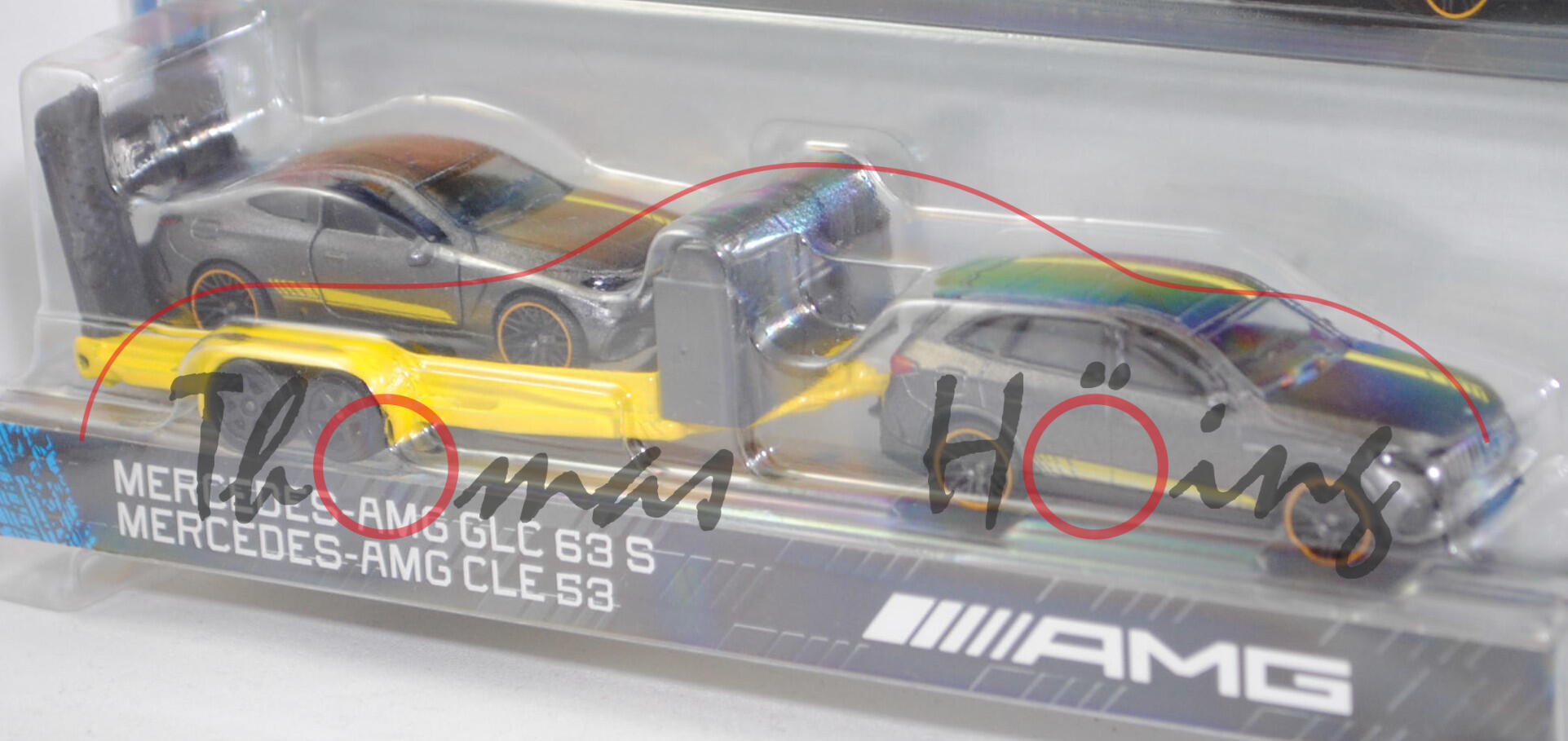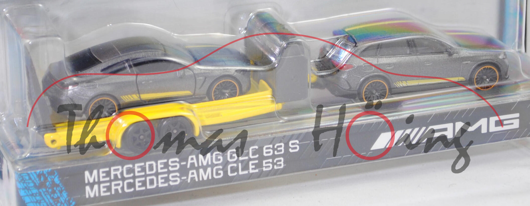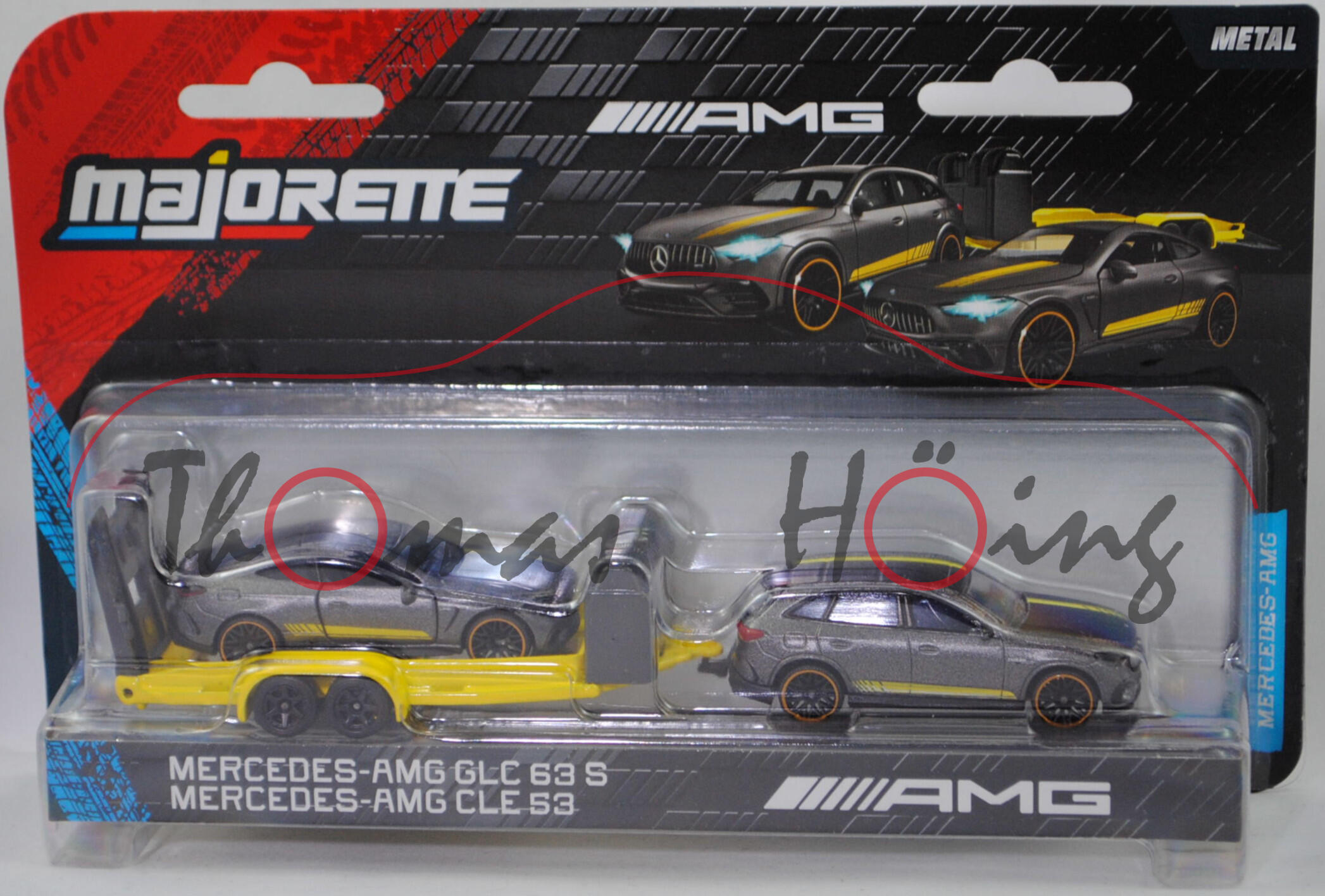 Mercedes-AMG GLC 63 S E PERFORMANCE Premium (Modell 2023-) mit Autotransporter und Mercedes-AMG CLE 53 4Matic+ Coupé (Modell 2023-), dunkel-graualuminiummetallic + zinkgelb/basaltgrau, majorette, Blister