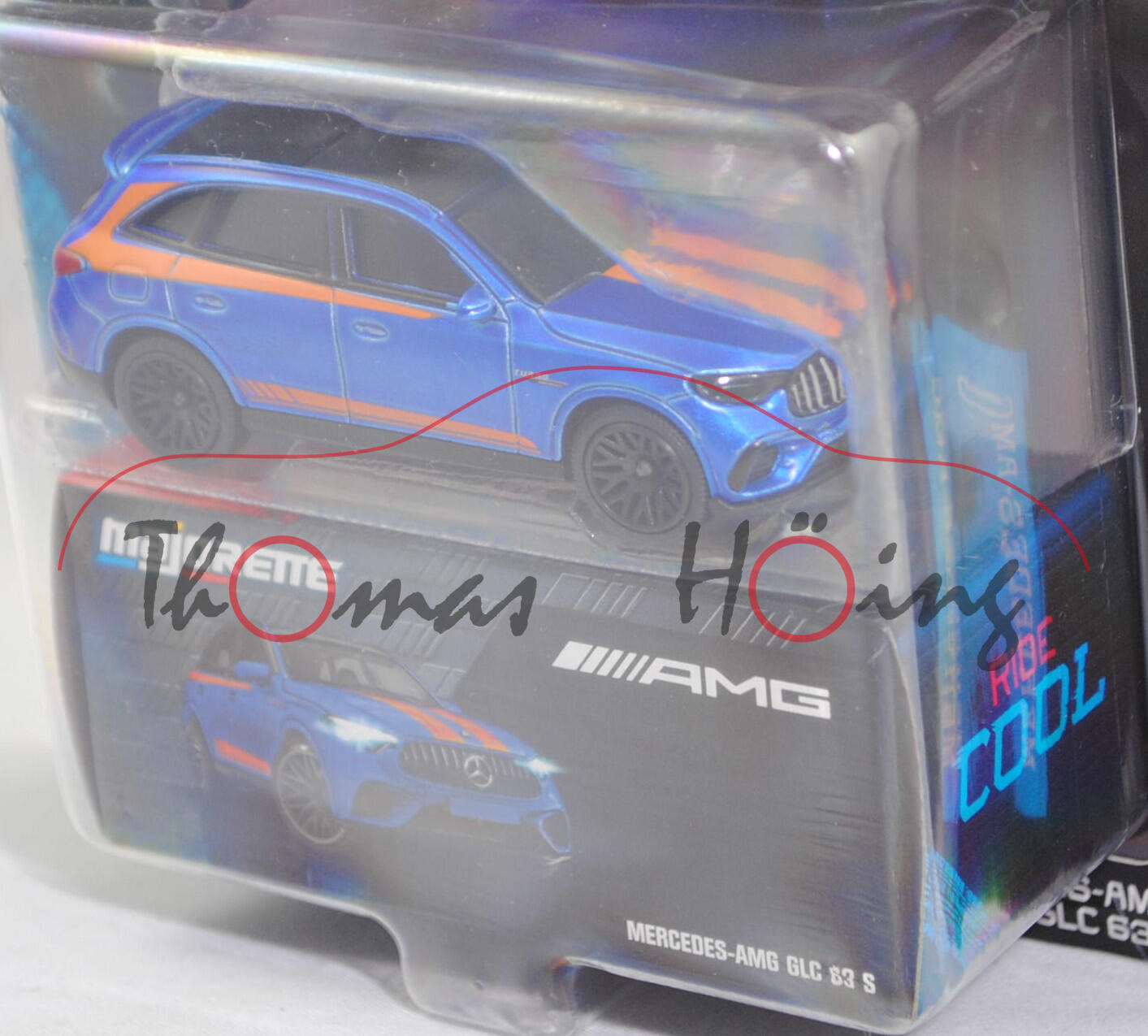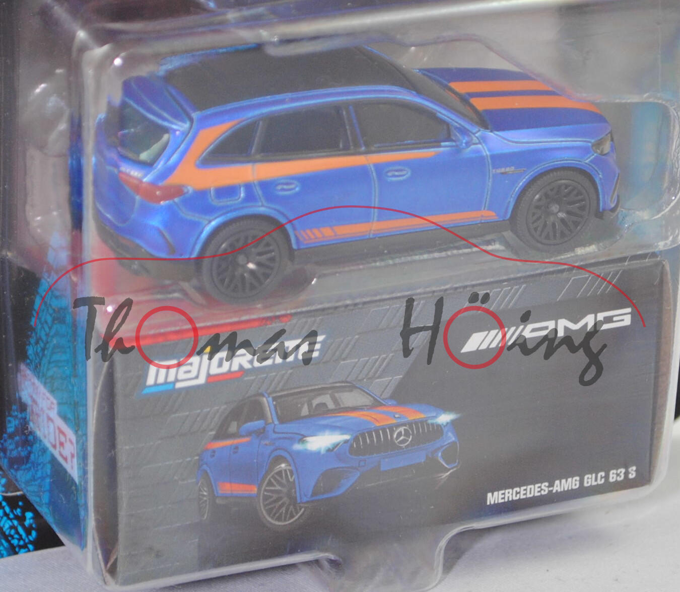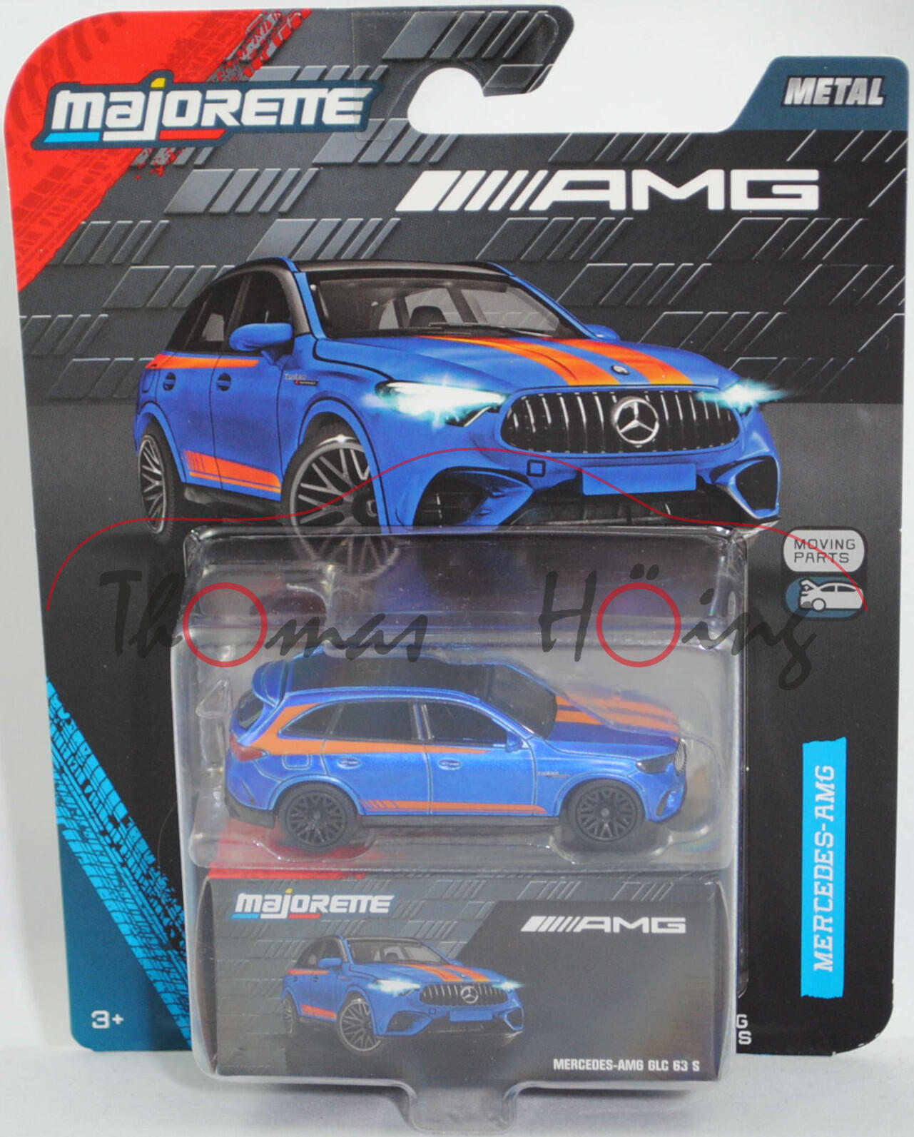 Mercedes-AMG GLC 63 S E PERFORMANCE Premium (2. Generation GLC, Baureihe GLC AMG, interne Baureihenbezeichnung X 254, Baumuster 254.680, fünftüriger SUV (Sport Utility Vehicle) mit 5 Sitzplätzen, PHEV (plug-in hybrid electric vehicle), Ausstattungslinie AMG Premium: AMG Styling bestehend aus spezifischer Frontschürze im Jet-Wing-Design mit schwarzen Kühllufteinlässen + Kühlergrill im Panamericana-Design mit 14 hervorstehenden senkrechten Lamellen in chrom + Radlaufverbreitungen in Wagenfarbe + Chrompaket Exterieur + Dachreling in poliertem Aluminium + AMG Abrisskante am Heck + Sportsitze mit in die Kopfstützen eingeprägten AMG-Logos + AMG Performance Lenkrad in Leder Nappa und Mikrofaser MICROCUT + Hinterachslenkung + trapezförmige Doppelendrohrblenden rechts und links + 20 Zoll AMG Leichtmetallräder im 10-Doppelspeichen-Design in tantalgrau lackiert und glanzgedreht (RVM), Sonderausstattung gegen Mehrpreis: Panorama-Schiebedach (413), AMG SPEEDSHIFT MCT 9G (9-Gang-Automatikgetriebe, MCT = Multi Clutch Technology), Allradantrieb 4Matic+, Motor: Mercedes-AMG Typ M 139 E20 DEH LA (M = Ottomotor der Baureihe 139 mit 20 Deziliter Hubraum und Direkteinspritzung (DE) sowie homogenem Kraftstoff-Luft-Gemisch (H) und Ladeluftkühler (L) sowie Abgasturbolader (A)) wassergekühlter Vierzylinder-Reihen-Viertakt-Otto mit Abgasturbolader und elektrisch angetriebenem Zusatzverdichter sowie Direkteinspritzung und zwei obenliegende Nockenwelle (DOHC = Double Overhead Camshaft) sowie 4 Ventile pro Zylinder und Ladeluftkühler sowie 1991 cm³ und 476 PS, Baumuster Motor: 139.580, zusätzlicher Elektromotor an der Hinterachse als Permanentmagnet-Synchronmaschine (PSM) mit 204 PS und Lithium-Ionen-Batterie mit Kapazität 6,1 kWh brutto bzw. 4,84 kWh netto, Systemleistung 680 PS, Radstand 2888 mm, Länge ohne Anhängerkupplung (AHK) 4749 mm, Modell 2023-) (Nr. 232P), Karosserie matt hell-signalblaumetallic, Dach mattschwarz, innen schwarz, Sitze schwarz, Lenkrad schwarz, Druck Streifen in pastellorange mittig und unten auf den Seiten, Druck zwei Streifen in pastellorange auf der Motorhaube, Heckklappe zu öffnen, 10-Y-Felgen in schwarzgrau (Mercedes-AMG 10-Doppelspeichen-Design in tantalgrau lackiert und glanzgedreht (Ausstattungcode RVM) vorne Größe 9,5 J x 20 ET 32,1 mit Lochkreis 5 x 112 (Teilenummer A 254 400 06 00, Farbcode tantalgrau lackiert und glanzgedreht) und Nabendeckel / Radzierdeckel (Farbcode grau mit Mercedes-Benz-Stern in chrom) sowie Reifen 265/45 ZR 20 108Y bzw. hinten Größe 10 J x 20 ET 24 mit Lochkreis 5 x 112 (Teilenummer A 254 400 02 00, Farbcode tantalgrau lackiert und glanzgedreht) und Nabendeckel / Radzierdeckel (Farbcode grau mit Mercedes-Benz-Stern in chrom) sowie Reifen 295/40 ZR 20 110Y), mit Sammelschachtel, majorette, ca. 1:67, Blister (MERCEDES-AMG DELUXE CARS) (EAN 3467452077146)