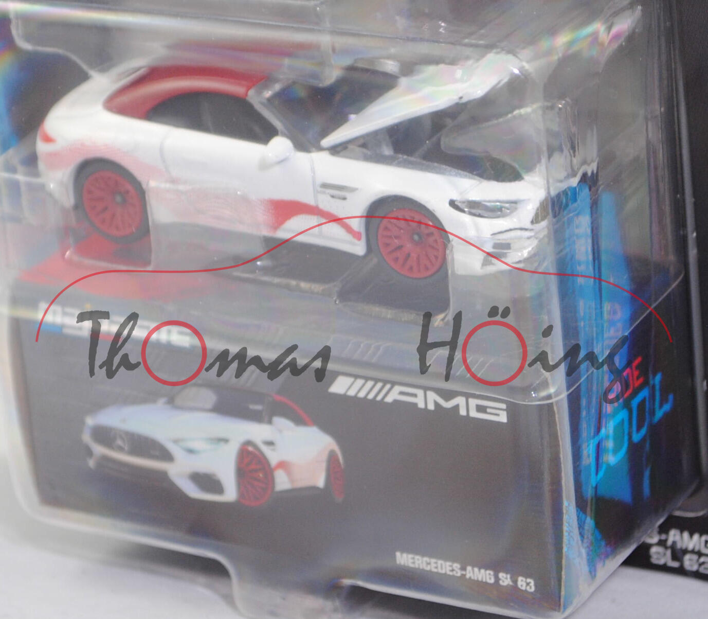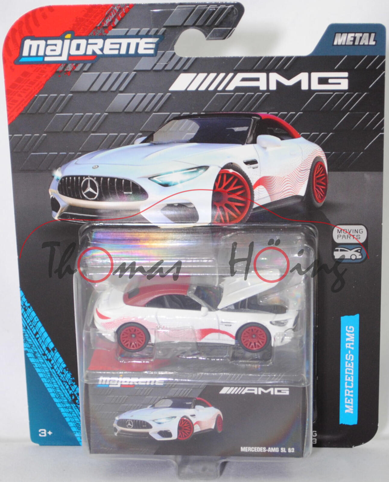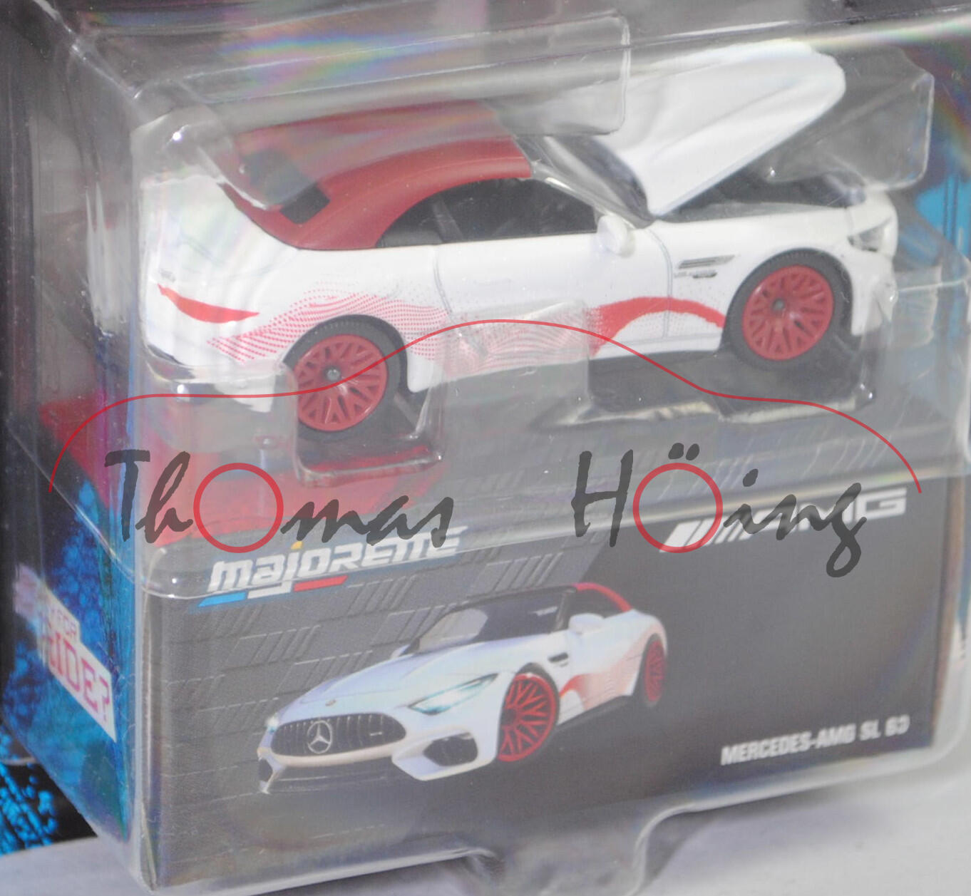 Mercedes-AMG SL 63 4MATIC+ Premium (7. Generation SL-Klasse, Baureihe Mercedes-AMG SL 63 4MATIC+, interne Baureihenbezeichnung R 232, Baumuster 232.481, zweitüriger Sportwagen als Roadster mit 4 Sitzplätzen, SL = Super-Leicht, Entwicklung durch die Mercedes-AMG GmbH Affalterbach, Ausstattungslinie Premium: Premium-Paket (PSC) mit Ambientebeleuchtung (891), URBAN GUARD Fahrzeugschutz Plus (P82), Lenkradheizung (443), AMG Real Performance Sound (339), AMG Lichtinszenierung (588) + AMG spezifische Kühlerverkleidung + Motorhaube mit Powerdomes + Zierteil auf den vorderen Kotflügeln in hochglanzchrom + Seitenschwellerverkleidung mit Zierleiste in silberchrom + oberer Teil der Instrumententafel mit Bezug in Nappaoptik + AMG Performance Lenkrad im 3-Doppelspeichen-Design unten abgeflacht, vertikale Doppelspeiche in silberchrom mit AMG Schriftzug in Leder Nappa (L6J) + AMG Sportsitze mit Polsterung in Leder Nappa schwarz (801A) mit Kontrastnaht in mittelgrau + Sonnenblende ausziehbar (543) + Innenhimmel Stoff schwarz (51U) + Windschott mechanisch + Stoffverdeck schwarz (740) mit beheizbarer Heckscheibe + AMG Zierelemente in schwarz hochglänzend (H80) + Typkennzeichnung auf vorderen Kotflügeln und Heckdeckel + 20 Zoll AMG Leichtmetallräder im 5-Doppelspeichen-Design aerodynamisch optimiert tantalgrau lackiert und glanzgedreht, Sonderausstattung gegen Mehrpreis: AMG Chrom-Paket-Exterieur (750) mit Frontsplitter in hochglanzchrom und Zierleiste auf A-Wing in hochglanzchrom sowie Seitenschwellerverkleidung mit Zierleiste in hochglanzchrom und Einleger an der Heckschürze in hochglanzchrom, AMG SPEEDSHIFT MCT 9G (9-Gang-Automatikgetriebe, MCT = Multi Clutch Technology), Allradantrieb 4MATIC+, Motor: Mercedes-AMG Typ M 177 DE 40 AL (M = Ottomotor der Baureihe 177 mit 40 Deziliter Hubraum und Direkteinspritzung (DE) sowie Abgasturbolader (A) und Ladeluftkühler (L)) wassergekühlter Achtzylinder-V-Viertakt-Otto mit zwei Twin-Scoll-Turbolader (Abgasturbolader) und Direkteinspritzung sowie zwei obenliegende Nockenwelle (DOHC = Double Overhead Camshaft) je Zylinderbank und 4 Ventile pro Zylinder sowie Ladeluftkühler und 3982 cm³ sowie 585 PS, Baumuster Motor: 177.880, Radstand 2700 mm, Länge 4705 mm, Modell 2022-) (Nr. 232L), reinweißmetallic, innen schwarz (vgl. Leder Nappa schwarz beim Original), Sitze schwarz (vgl. Leder Nappa schwarz beim Original), Lenkrad schwarz, Stoffverdeck purpurrot, Druck Streifen in rubinrot auf den Seiten, Motorhaube zu öffnen, 10-Y-Speichen-Felge in purpurrot (Mercedes-AMG Leichtmetallräder im 5-Doppelspeichen-Design aerodynamisch optimiert tantalgrau lackiert und glanzgedreht vorne Größe 9,5 J x 20 H2 ET 53,5 mit Lochkreis 5 x 112 (Teilenummer A 232 401 21 00, Farbcode 7Y51 tantalgrau) und Nabendeckel / Radzierkappe (Ø auße 75 mm, Teilenummer A 000 400 38 00, Farbcode 7756 himalaya grau mit Mercedes-Stern in chrom) sowie Reifen 265/40 R 20 104Y bzw. hinten Größe 11 J x 20 H2 ET 63 mit Lochkreis 5 x 112 (Teilenummer A 232 401 22 00, Farbcode 7Y51 tantalgrau) und Nabendeckel / Radzierkappe (Ø auße 75 mm, Teilenummer A 000 400 38 00, Farbcode 7756 himalaya grau mit Mercedes-Stern in chrom) sowie Reifen 295/35 R 20 105Y), mit Sammelschachtel, majorette, 1:60, Blister (MERCEDES-AMG DELUXE CARS) (EAN 3467452077146)