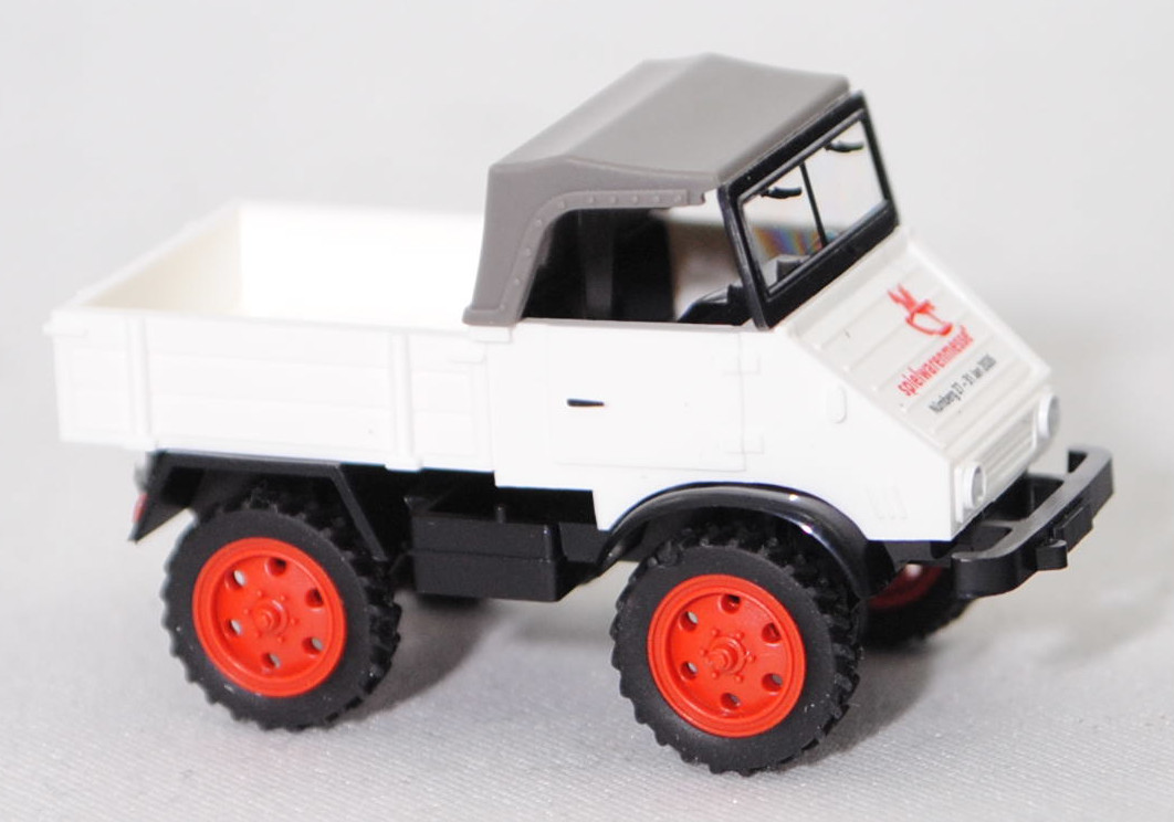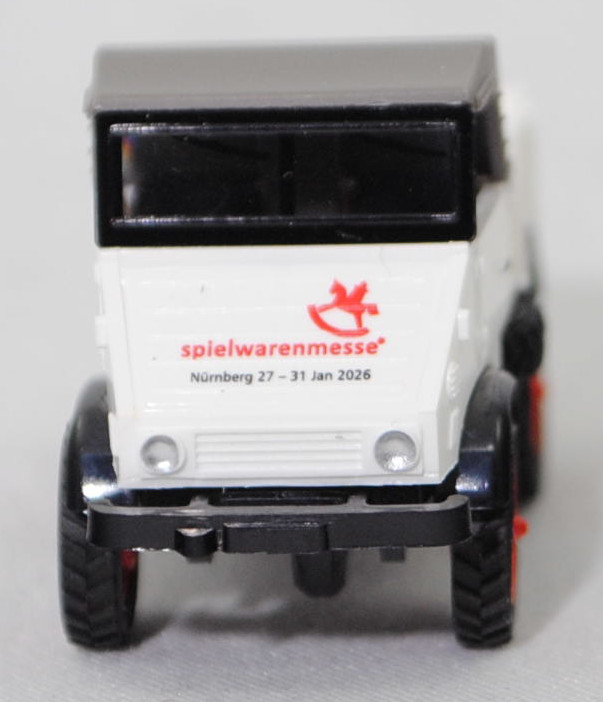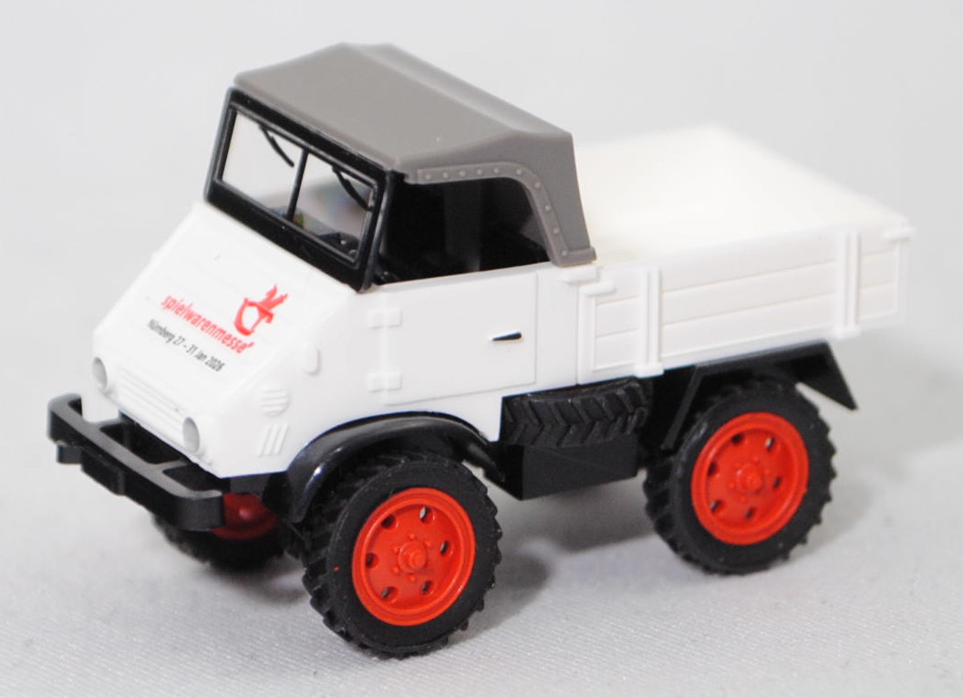 Mercedes-Benz Unimog 411 mit Verdeck (Dach) (Baureihe Unimog, Universal-Motor-Gerät, Typ U30, Baumuster 411.110, Frontscheinwerfer am Rahmen befestigt (somit fast bündig mit dem Kühlergrill), Stoßstange an den Enden eckig (von Wiking abgerundet ausgeführt), Pritsche seitlich mit 3 Brettern, zulässiges Gesamtgewicht 3200 kg, Ausstattungslinie U30 Grundausführung: Ganzstahlkarosserie + Kupplungsmaul vorne mit Steckbolzen + Windschutzscheibe + 2 gut gefederte und gepolsterte Sitze + zusammenklappbares Fahrerhausverdeck + seitliche Steckscheiben + Pritsche mit ca. 2,2 qm Ladefläche + Motor mit Vorkammereinspritzung und 1767 cm³ sowie 30 PS + Kraftstoffbehälter für 40 Liter + Bereifung 7,50-18 AS Spezial für Gelände und Straße, Daimler-Benz 6-Gang-Schaltgetriebe, Heckantrieb mit zuschaltbarem Vorderradantrieb, Motor: Daimler-Benz OM 636 wassergekühlter Vierzylinder-Reihen-Viertakt-Vorkammer-Diesel mit Bosch Vorkammereinspritzung und eine zahnradgetriebene seitliche Nockenwelle sowie 2 hängende Ventile pro Zylinder und 1767 cm³ sowie 30 PS, Baumuster Motor 636.914, Radstand 1720 mm, Länge 3520 mm, Modell 1957-1961), Karosserie reinweiß, Sitze schwarz, Sitze schwarz, Lenkrad schwarz, Druck spielwarenmesse-Logo und spielwarenmesse® in signalrot sowie Nürnberg 27 - 31 Jan 2026 in schwarz auf der Motorhaube, Pritsche reinweiß, Faltdach grau, Kotflügel vorne und hinten schwarz, Fahrgestell schwarz, Felgen rot (Reifen 7,5-18), Wiking, 1:87, mb (Schachteleinlage mit Druck spielwarenmesse® / 2026) (Limited Edition / Sondermodell zur 75. Spielwarenmesse in Nürnberg vom 27. Januar bis 31. Januar 2026) (EAN 4006190870689)
