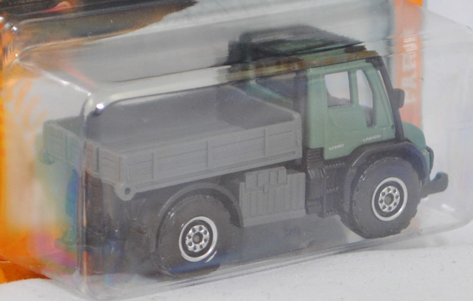 Mercedes-Benz Unimog U 530 (4. Generation, Modellreihe: Geräteträger, Baureihe Unimog 405, MoPf (Modellpflege) 2013 zum Modelljahr 2014, Variante UGE (Unimog Geräteträger Evotution), Kühlergrill mit einem Mittelsteg und integriertem Mercedes-Benz-Stern, Freisichtfahrerhaus, Scheibenwischer oben am Dach befestigt, Baumuster 405.202, Unimog = Universal-Motor-Gerät, Fahrerhaus mit 2 Sitzplätzen, Innenmaße Kipppritsche Länge x Breite = 2650 x 2200 mm, Ausstattungslinie U 530 mit Pritsche: Taglicht-Scheinwerfer geschützt in Stoßfänger + automatisches Fahrlicht + Einstiegsleuchten im Aufstiegsbereich + Freisichtfahrerhaus aus Faserverbundwerkstoff kippbar + tief nach unten gezogene Windschutzscheibe aus Verbundglas + Tiefsichtfenster in den Türen + großes Rückwandfenster + elektrisch verstellbare und beheizbare Außenspiegel + dreistufige Scheibenwischanlage oben mit Intervallschaltung + Multifunktionslenkrad + Sitze mit integrierten 3-Punkt-Sicherheitsgurten + Türverkleidung mit Armlehne und Flaschenhalter + drei Einzel-Sonnenblenden + 3 Kleiderhaken + Integralträger für Frontanbauplatte + Luftansaugung hochgezogen + Abgasanlage mit Endrohr nach oben + Nebelschlussleuchte + Rückfahrscheinwerfer + durchgehender formstabiler Leiterrahmen, Sonderausstattung gegen Mehrpreis: Fahrerhaus-Überrollschutz für EU-Traktorzulassung + Sonnenblende außen + Dreiseiten-Kipppritsche, Leergewicht 9400 kg, zulässiges Gesamtgewicht 16500 kg, vollsynchronisiertes Mercedes-Benz Wendegetriebe mit 8-Gang-Schaltgetriebe (in zwei Schaltgruppen), permanenter Allradantrieb, Motor: Mercedes-Benz Typ OM 906 LA stehender wassergekühlter Sechszylinder-Reihen-Viertakt-Turbo-Diesel mit Common-Rail-Direkteinspritzung und zwei obenliegende Nockenwellen (DOHC = Double Overhead Camshaft) sowie 4 Ventile pro Zylinder und Ladeluftkühler sowie 7698 cm³ und 299 PS, Baumuster Motor 936.971, Radstand 3350 mm, Länge 4050 mm, Modell 2013-) (Nr. 251A), Fahrerhaus und Motorhaube resedagrün, innen staubgrau, Sitze staubgrau, Lenkrad staubgrau, Fahrerhaus-Überrollschutz schwarz, Sonnenblende schwarz, Druck Mercedes-Benz-Stern in silber auf schwarz im Kühlergrill, Druck Warntafeln in rot/weiß rechts und links auf der Frontseite der Motorhaube, Pritsche staubgrau, Luftansaugstutzen schwarz, Auspuff schwarz, Stufen zum Fahrerhaus schwarz, Batteriekasten auf der rechten Seite staubgrau, Tank auf der linken Seite staubgrau, Radkästen schwarz, Fahrgestell schwarz mit Anhängerkupplung (AHK), 8-Loch-Felgen in chrom (Mercedes-Benz Unimog Stahlscheibenräder Größe 9 x 22,5 mit Bereifung 385/65 R 22,5), majorette, ca. 1:83, Blister (FARM Premium Vehicles) (EAN 3467452077269 / 3467452080436)