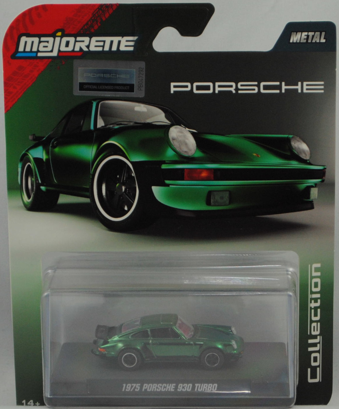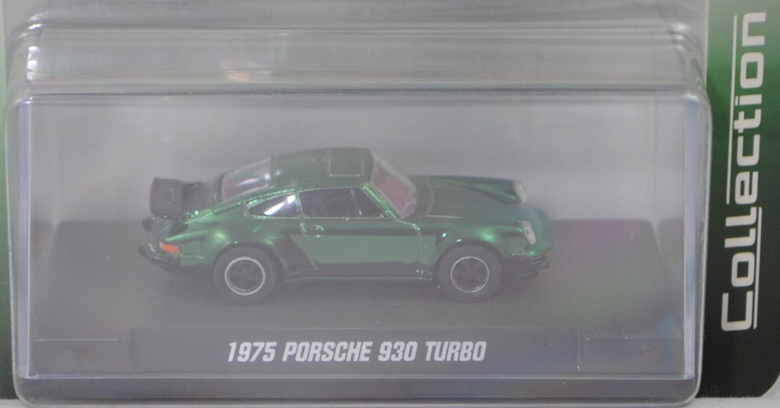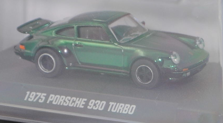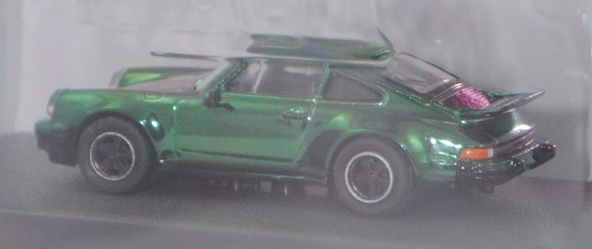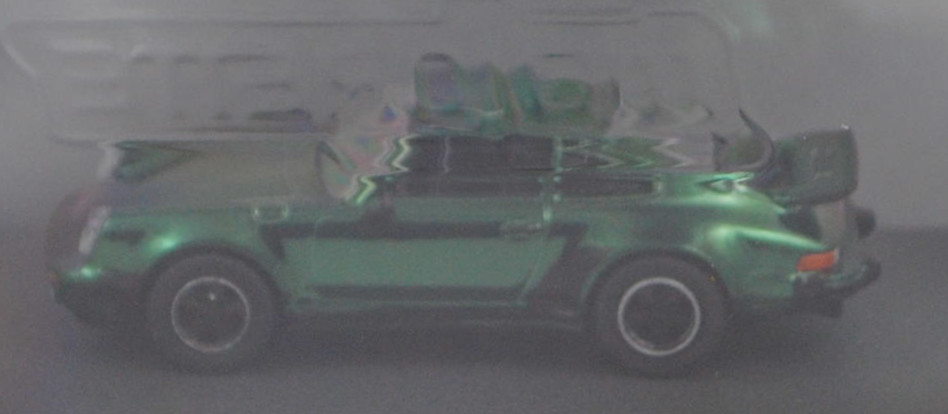 Porsche 911 Turbo 3,0 (2. Generation Porsche 911, Baureihe 911, interne Baureihenbezeichnung G-Modell Typ 930 Coupé, zweitüriger Sportwagen als Coupé mit 4 Sitzplätzen, Vorfacelift, Abgasanlage mit einem Auspuffendrohr auf der linken Seite, Motor mit 3,0 Liter Hubraum und 260 PS, Ausstattungslinie 911 Turbo: um 12 cm verbreitere Karosserie im Bereich der hinteren Kotflügel + mit Bugspoiler + Scheibenrahmen und Zierleisten mattschwarz + Scheinwerferringe in Wagenfarbe + Außenspiegel in Wagenfarbe + grüne Verglasung rundherum + Metalliclackierung + Innenausstattung aus Leder-Stoff-Kombination + schwarze Steinschlagschutzfolie vor den hinteren Radläufen + großer Heckflügel mit breiter schwarzer Umrandung aus Hartgummi auf dem Heckdeckel, vollsynchronisiertes 4-Gang-Schaltgetriebe, Hinterradantrieb, Motor: Porsche Typ 930.52 luftgekühlter Sechszylinder-Boxer-Viertakt-Turbo-Otto mit Bosch K-Jetronic Mehrpunkteinspritzung und eine obenliegende Nockenwelle (OHC = Overhead Camshaft) je Zylinderbank sowie 2 v-förmig hängende Ventile pro Zylinder und Ladeluftkühler sowie 2993 cm³ und 260 PS, Radstand 2272 mm, Länge 4291 mm, Modell 1975-1976), hell-moosgrünmetallic (vgl. ähnlich oakgrün metallic beim Original, Farbcode 265), innen schwarz, Sitze schwarz, Lenkrad schwarz, Porsche geschmiedete Leichtmetallfelgen (Hersteller: Otto Fuchs KG Derschlager Straße 26 58540 Meinerzhagen) vorne Größe 7 J x 15 ET 23,3 mit Lochkreis 5 x 130 (Teilenummer 911 361 020 93, Farbcode Felgenstern schwarz und Felgenhorn poliert) und Nabenkappe / Radzierdeckel (Teilenummer 911 361 032 28, Farbcode schwarz) sowie Reifen 185/70 VR 15 bzw. hinten Größe 8 J x 15 ET 10,6 mit Lochkreis 5 x 130 (Teilenummer 911 361 020 94, Farbcode Felgenstern schwarz und Felgenhorn poliert) und Nabenkappe / Radzierdeckel (Teilenummer 911 361 032 28, Farbcode schwarz) sowie Reifen 215/60 VR 15, majorette, 1:64, PC-Box im Blister (Collection) (EAN 3467452078822)