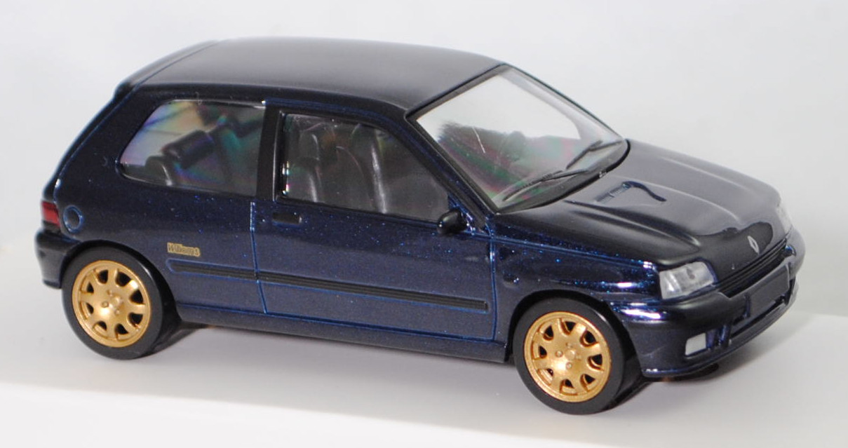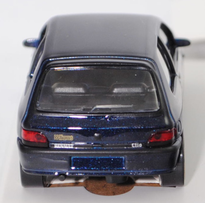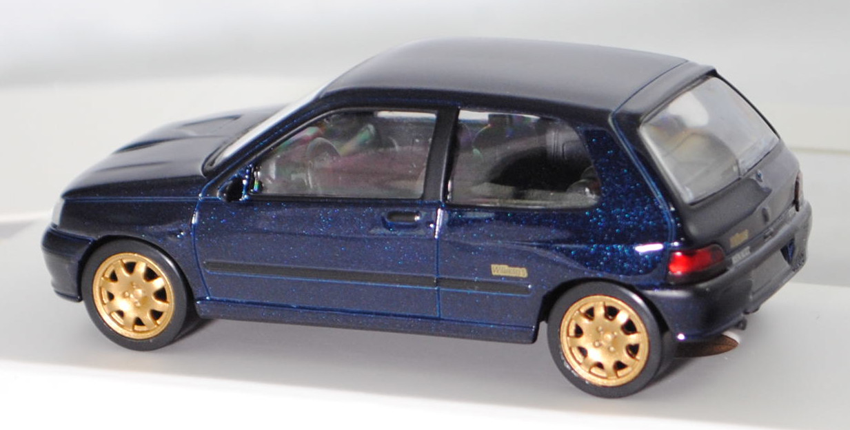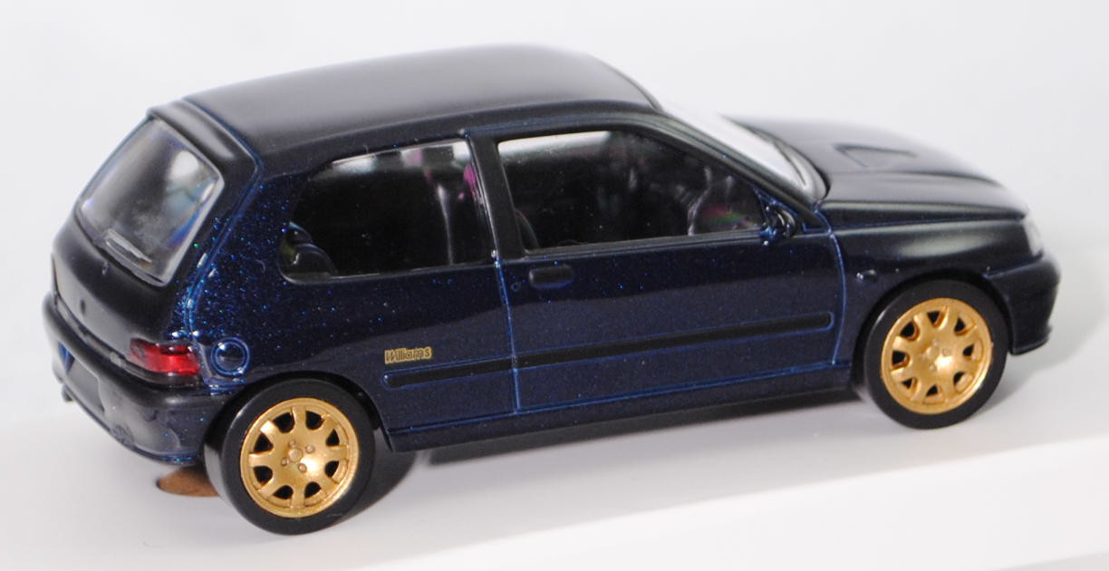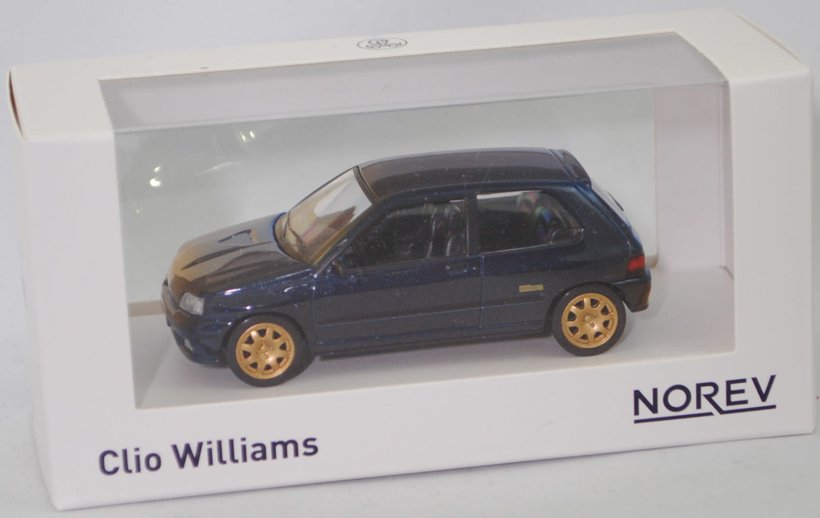 Renault Clio 16V Williams (1. Generation, Baureihe Clio, interne Baureihenbezeichnung Typ 57, Baumuster C57M, dreitürige Schräghecklimousine mit 5 Sitzplätzen, Vorfacelift (Phase 1), Kühlergrill mit 2 Streben, Heckklappe ohne zusätzlicher Zierleiste, Schriftzug auf der Heckklappe ganz unten angebracht, Ausstattungslinie Clio 16V Williams: Nebelscheinwerfer + aerodynamischer Spoiler in Wagenfarbe + Stoßfänger in Wagenfarbe mit Schutzstreifen + Seitenschweller in Wagenfarbe + elektrisch verstellbare und beheizbare Außenspiegel + elektrische Fensterheber vorne mit Schnellschalter für den Fahrer + spezifische Instrumentenanzeigen mit weißer Schrift auf blauem Hintergrund + elektronischer Drehzahlmesser + Servolenkung + teilweise lederbezogenes 3-Speichen-Sportlenkrad + Schalthebel mit schwarzem Lederknauf + Fahrersitz höhenverstellbar und mit verstellbarer Lendenwirbelstütze + spezifische graue Velour-Polsterung mit blauer Paspelierung und Monogramm W auf den Vordersitzen + blaue Sicherheitsgurte + blauer Teppichboden + Ausstellfenster hinten + stilisierter Heckscheibenwischer mit Intervallfunktion + Außenfarbe le mans blau metallic + seitliche Schriftzüge und Heckschriftzug Williams in gold + 15 Zoll-Leichtmetallfelgen Typ Speedline in goldmetallic Größe 7 J x 15 mit Michelin MXV3 Reifen 185/55 VR 15 + Reserverad grau, auf 5000 Stück limitiertes Sondermodell zu Ehren von Frank Williams, 5-Gang-Schaltgetriebe, Vorderradantrieb, Motor: Renault Typ 2.0 16V wassergekühlter Vierzylinder-Reihen-Viertakt-Otto mit Mehrpunkteinspritzung und zwei obenliegende Nockenwellen (DOHC = Double Overhead Camshaft) sowie 4 Ventile pro Zylinder und 1998 cm³ sowie 150 PS, Motorcode F7R 700, Radstand 2471 mm, Länge 3712 mm, Modell 1993-1994, Baujahr 1993), sports blue metallic (oder auch le mans blau metallic genannt, Farbcode 449), innen schwarz, Sitze schwarz, Lenkrad schwarz, Renault Leichtmetallfelgen im 8-Speichen-Design Typ Speedline (Hersteller Speedline, Typ SL 782) in goldmetallic Größe 7 J x 15 ET 36 mit Lochkreis 4 x 100 (Teilenummer RSP6001025892, Farbcode gold) und Nabenkappe / Radzierdeckel (Teilenummer 6001040447) sowie Michelin MXV3 Reifen 185/55 VR 15, Norev Jet-car / Youngtimers, 1:43, mb (weiße Kartonbox) (EAN 3551094302015)