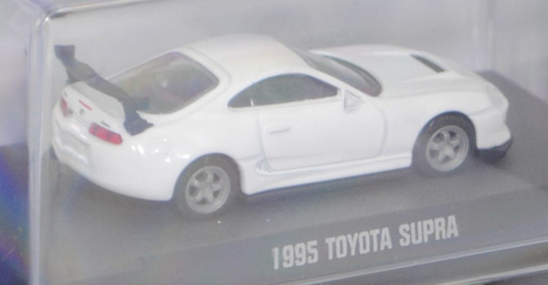 Toyota Supra RZ (4. Generation, Baureihe Supra, interne Baureihenbezeichnung JZA80 (in den USA Supry MKIV genannt), zweitüriger Sportwagen als Coupé mit 4 Sitzplätzen, Vorfacelift, Stoßfänger vorne ohne Strebe im Bereich der mittleren Lüftungsöffnung, Frontscheinwerfer ohne schwarzen Kunststoffeinsatz, Blinker vorne mit Verglasung in orange, Seitenblinker mit Verglasung in orange auf den vorderen Kotflügeln, Rückleuchen mit schwarzen Einfassungen, Armaturenbrett mit drei großen Rundinstrumenten, Ausstattungslinie Supra RZ: Halogenscheinwerfer + fester Frontspoiler + wärmeabsorbierendes Windschutzscheibenglas + Instrumententafel mit Digitaluhr + Scheibenwischer mit Waschanlage und einstellbarer Intervallschaltung + automatische Klimaanlage + AM/FM-Multituner-Radio mit integriertem CD-Player und Kassettenspieler sowie 6 Lautsprechern + Heckscheibenantenne + 3-Speichen-Leder-Lenkrad + progressive Servolenkung + Leder-Schalthebelknopf + Recaro-Sitze Typ SZ-II + Sitze mit Stoffbezug + elektrisch abklappbare Außenspiegel in Wagenfarbe + elektrische Fensterheber + Heckscheibenwischer + großer Heckspoiler + hoch angebrachte LED-Bremsleuchte in der Heckklappe + Bilstein Stoßdämpfer + Aluminiumfelgen vorne Größe 8 JJ x 16 mit Reifen 225/50 ZR 16 sowie hinten Größe 9 JJ x 16 mit Reifen 245/50 ZR 16 + Ersatzreifen Stahlfelge mit Reifen T 14570 R 17, zusätzliche An- und Umbauteile gegen Mehrpreis: zusätzlicher Carbon Frontspoiler zum Anbau unterhalb des Serien-Stossfängers + Carbon Motorhaube mit integrierter Lufthutze + Carbon Seitenschweller + Carbon Heckflügel, Getrag (Getriebe-AG) Typ V160 6-Gang-Schaltgetriebe, Hinterradantrieb, Motor: Toyota in Zusammenarbeit mit Yamaha Typ 3000 TwinCam24 Two Way Twin Turbo Modell 2JZ-GTE wassergekühlter Sechszylinder-Reihen-Viertakt-Otto mit Twin Turbo (2 Turbolader) und elektronische Einspritzung (EFI = Electronic Fuel Injection) sowie zwei obenliegende Nockenwelle (DOHC = Double Overhead Camshaft) und 4 Ventile pro Zylinder sowie Ladeluftkühler und 2997 cm³ sowie 280 PS, Motorcode E-JZA80-ALFQZ, Radstand 2550 mm, Länge 4515 mm, Modell 1993-1996, Baujahr 1995), reinweiß (vgl. superweiß II beim Original, Farbcode 040), innen schwarz, Sitze schwarz, Lenkrad schwarz (RHD = Right Hand Drive, Rechtslenker), Heckflügel schwarz, Toyota Aluminiumfelgen im 5-Arm-Design in silber vorne Größe 8 JJ x 16 ET 50 mit Lochkreis 5 x 114,3 (Teilenummer 42611-1B070, Farbcode silber) und Nabendeckel / Radzierdeckel (Teilenummer 42603-14320, Farbcode silber mit Toyota-Logo in der Mitte) sowie Reifen 225/50 ZR 16 sowie hinten Größe 9 JJ x 16 ET 50 mit Lochkreis 5 x 114,3 (Teilenummer 42611-1B080, Farbcode silber) und Nabendeckel / Radzierdeckel (Teilenummer 42603-14320, Farbcode silber mit Toyota-Logo in der Mitte) sowie Reifen 245/50 ZR 16, majorette, 1:64, PC-Box im Blister (Collection, JDM Legends (JDM = Japanese Domestic Market bzw. Japanischer Inlandsmarkt)) (EAN 3467452078846)