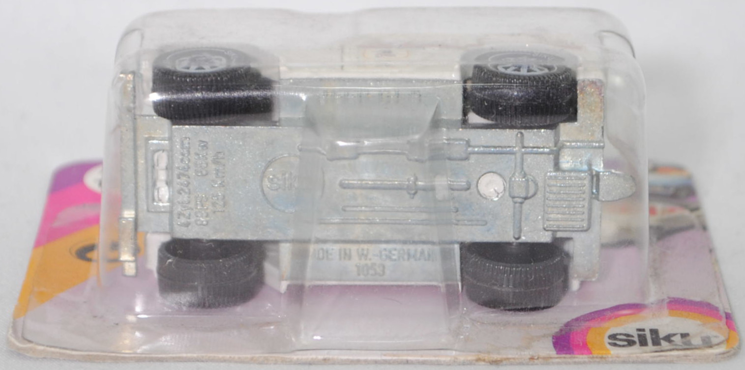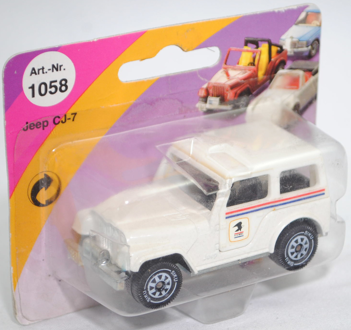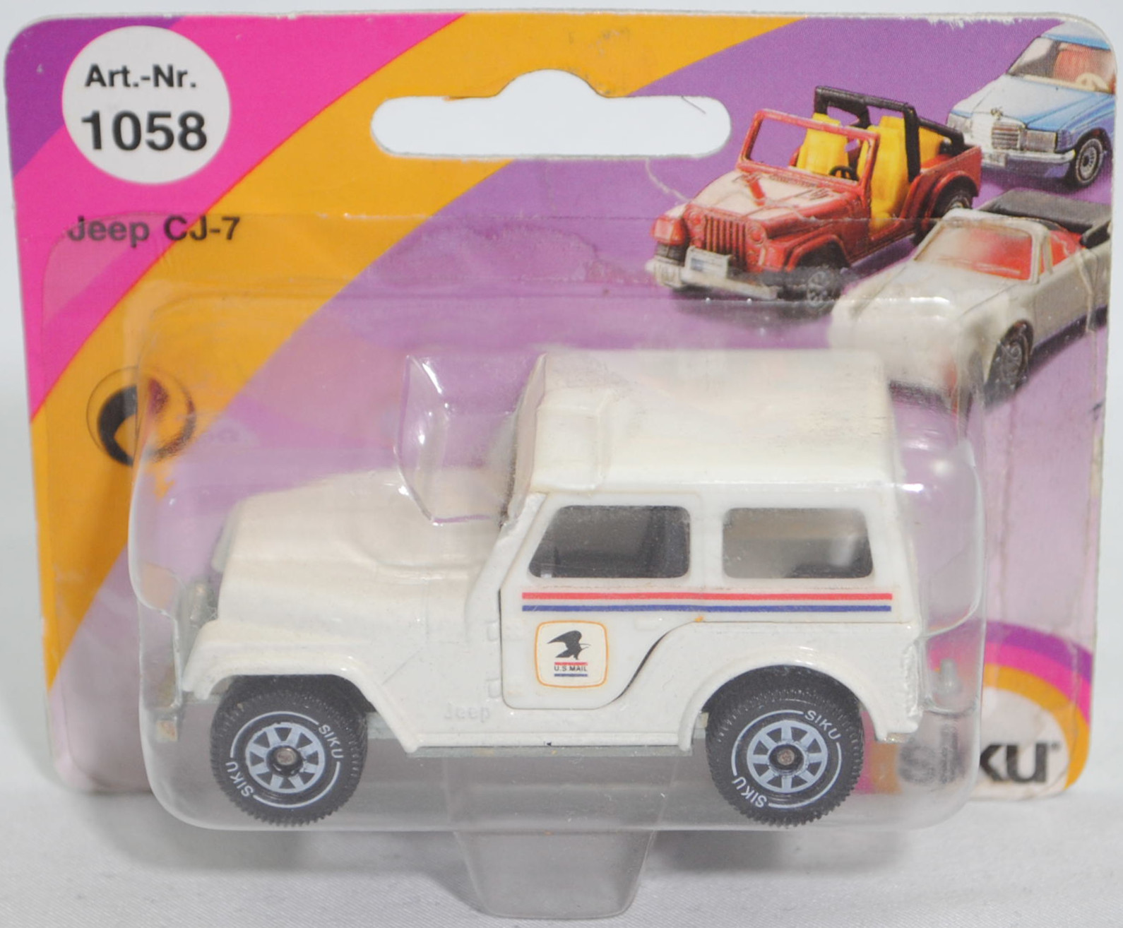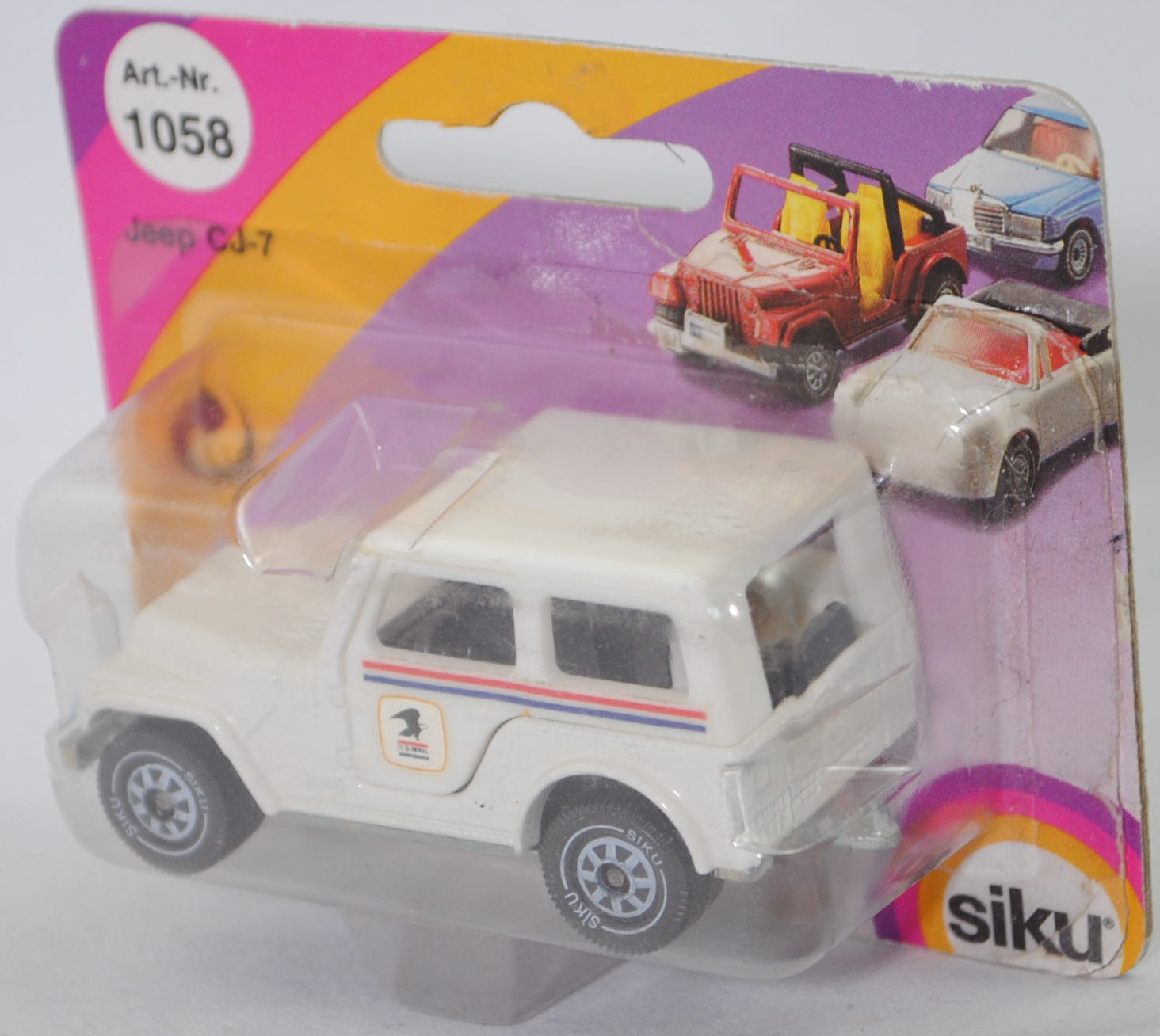 USA Jeep CJ-5 2.5L (5. Generation, Baureihe Geländewagen der CJ-Serie, CJ = Civilian Jeep, zweitüriger Geländewagen mit 4 Sitzplätzen, kleine im hinteren Bereich abgerundete Türen, kurzer Radstand, ohne Softtop bzw. Fiberglas Hardtop, Änderungen 1979 zum Modelljahr 1980, Einbau des GM Iron Duke Vierzylinder-Reihenmotors, Ausstattungslinie CJ Grundausstattung: H4-Scheinwerfer + Doppelstoßstange vorne lackiert + 2,5 Liter (151 CID) 4-Zylinder-Benzin-Motor mit 88 PS + Außenspiegel auf der Fahrerseite + Innenspiegel 20,3 cm + gepolsterte Sonnenblenden + Beifahrerhaltegriff + energieabsorbierende Lenksäule mit Diebstahlsicherung + elektrische Scheibenwaschanlage und elektrische Scheibenwischer mit zwei Geschwindigkeiten + Schalensitze vorne + Sitzbank hinten + hinten montiertes Reserverad mit fester Rückwand + Unterfahrschutz für Getriebe und Kraftstofftank + Auspuffanlage mit einem Endrohr + 5-Loch Stahlfelgen Größe 38,1 x 15,2 cm mit schlauchlosen Suburbanite X-Grip Reifen H78 x 15B mit schwarzer Seitenwand, Sonderausstattung gegen Mehrpreis: elektrische Seilwinde bis 3,5 t Zugleistung + Fiberglas Hardtop + Anhängerkupplung (AHK), vollsynchronisiertes 4-Gang-Schaltgetriebe mit Mittelschaltung von Borg-Warner Corporation Typ SR4, Allradantrieb, Motor: Pontiac Motor Division von General Motors (GM) Typ 151 CID bzw. CUI (auch Iron Duke Motor genannt, Motorcode B151) wassergekühlter Vierzylinder-Reihen-Viertakt-Otto mit einem Rochester Varajet II Fallstrom-Registervergaser und eine zentrale Nockenwelle sowie OHV-Ventilsteuerung (Overhead valve engine) und 2 Ventile pro Zylinder sowie 2471 cm³ und 88 PS, Radstand 2121 mm, Länge 3665 mm, Modell 1979-1983) mit Fiberglas Hardtop (von Siku als Jeep CJ-7 bezeichnet), reinweiß (vgl. olympic white beim Original, Farbcode 9B-FW9), innen schwarz, Sitze schwarz, Lenkrad schwarz, Hardtop reinweiß, Aufkleber Streifen in verkehrsrot/ultramarinblau und U.S. MAIL-Logo in maisgelb/cremeweiß/schwarz/verkehrsrot/ultramarinblau auf den Seiten des Hardtop, W-Germ, Chassis chrom, ohne CE-Zeichen, B5 (Jeep Stahlfelgen im 4-Schlitz-Design Größe 5,5 x 15 ET 12 mit Lochkreis 5 x 139,7 und Nabendeckel sowie schlauchlose Suburbanite X-Grip Reifen H78 x 15B mit schwarzer Seitenwand), SIKU SUPER, ca. 1:55, P23 (Limited Edition / USA SPECIAL) (Vitrinenmodell, Schachtel mit Lagerspuren, Schachtel war offen) (EAN 4006874010585)