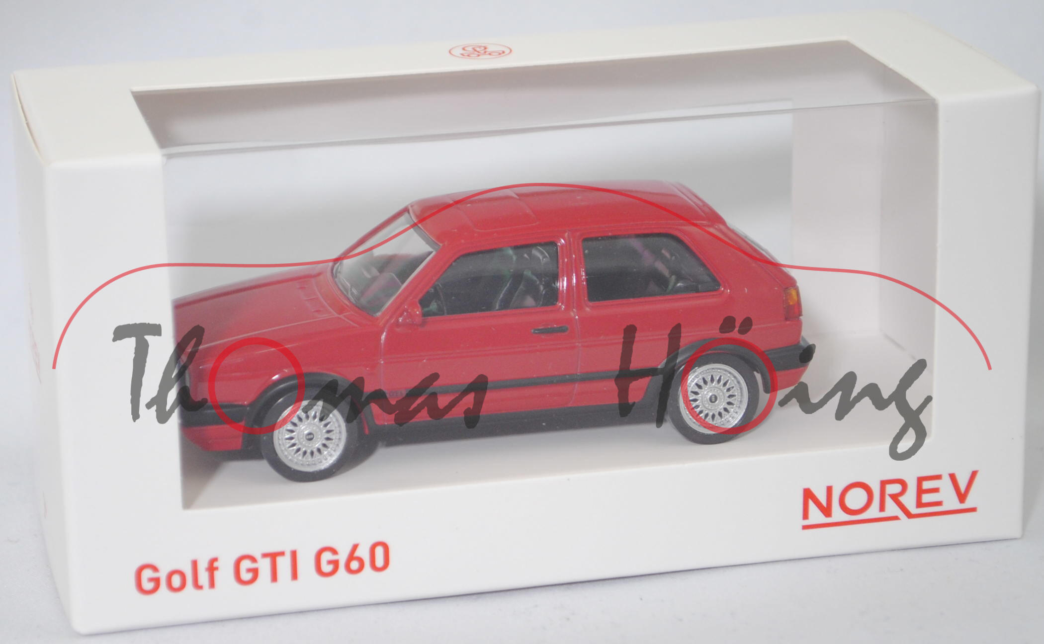 VW Golf GTI G60 (2. Generation, Baureihe Golf, interne Baureihenbezeichnung 1G1, dreitürige Schräghecklimousine mit 5 Sitzplätzen, Facelift 2 1989, Kühlergrill mit Doppelscheinwerfer und roter Umrandung, ohne Dreiecksfenster in den Vordertüren, Außenspiegel weiter vorne angebracht, große Stoßfängerverkleidungen, Vorderradantrieb, Motor: VW Typ EA827 wassergekühlter Vierzylinder-Reihen-Viertakt-Otto mit G-Lader (Spirallader mit Ladeluftkühler) und elektrischer Mehrpunkteinspritzung (Digifant) sowie eine obenliegende Nockenwelle (SOHC = Single Overhead Camshaft) und 2 Ventile pro Zylinder sowie 1781 cm³ und 160 PS, Motorkennbuchstabe PG, Radstand 2475 mm, Länge 4040 mm, Modell 1990-1991, Baujahr 1990), tornadorot (Verkaufskennzeichen G2, Lacknummer LY3D), innen schwarz, Sitze schwarz, Lenkrad schwarz, mehrteilige BBS-Leichtmetallräder Typ 451 Größe 6,5 J x 15 H2 ET 33 mit Lochkreis 4 x 100 (Teilenummer 191 601 025 R, Farbcode AEV chromfarben) und Nabendeckel / Radzierkappe (Teilenummer 191 601 149 K, Farbcode AEV chromfarben) sowie Reifen 195/50 VR 15, Norev Jet-car / Youngtimers, 1:43, mb (weiße Kartonbox) (EAN 3551098400625)