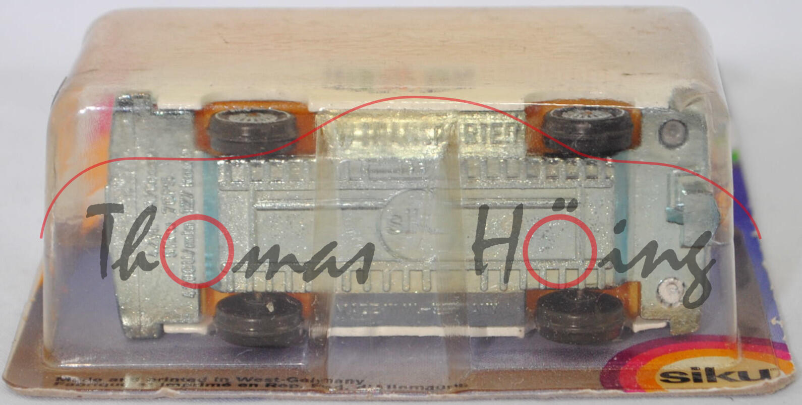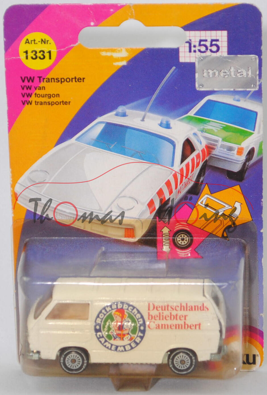 VW Transporter Kastenwagen 2,0 Liter (3. Generation, Baureihe Transporter, interne Baureihenbezeichnung Typ 2 Transporter 3 (T3, Modell '80), interne Konstruktionsbezeichnung der Baureihe EA 162, oder auch Bulli genannt, Typ 251 Kastenwagen mit geschlossenem Aufbau, viertüriger Kleintransporter als Kastenwagen mit 2 Sitzplätzen, Vorfacelift, Kühlergrill nur zwischen den Scheinwerfern, Lufteinlässe hinten auf den Seiten aus Blech in Wagenfarbe lackiert, Schriftzüge auf flacher schwarzer Platte mit silbernem Schriftzug, Ausstattungslinie Kastenwagen 2,0 Liter: zwei Rückblickspiegel + Trittstufen im Fahrerhaus + zweisitziges Fahrerhaus mit Durchgang zum Laderaum + Kunstledersitzbezüge + volle Kunststoffauskleidung im Fußraum mit Kunststofffolie, Fußboden mit wärmeisolierenden Gummimatten ausgelegt + Sicherheitstürverriegelung + Kleiderhaken + Zuziehgriffe + Beifahrerhaltegriff + Ablagekasten + blendfreie und gepolsterte Abdeckung der Armaturentafel + Scheibenwischer mit Zweistufen-Schaltung + Ladeboden aus Stahl + Seitenwände innen mit Verstärkungsprofil + seitliche Schiebetür auf der rechten Seite + nach oben öffnende selbstfeststellende Heckklappe + Innenleuchte Fahrerhaus mit Türkontaktschalter + Innenleuchte Laderaum mit Schiebetürkontaktschalter + Motor mit 1970 cm³ und 70 PS, Sonderausstattung gegen Mehrpreis: Anhängevorrichtung (AHK), zulässiges Gesamtgewicht 2360 kg, vollsynchronisiertes 4-Gang-Schaltgetriebe, Heckantrieb, Motor: VW Typ-4 luftgekühlter Vierzylinder-Boxer-Viertakt-Otto mit zwei Solex Fallstromvergaser 34 PDSIT-2/-3 und eine zentrale Nockenwelle sowie 2 Ventile pro Zylinder und 1970 cm³ sowie 70 PS, Motorkennbuchstabe CU, Radstand 2460 mm, Länge 4570 mm, Modell 1979-1982), cremeweiß, innen dahliengelb, Sitze dahliengelb, Lenkrad integriert, Aufkleber Rotkäppchen / CAMEMBERT / Deutschlands / beliebter Camembert in ultramarinblau/reinweiß/verkehrsrot/minzgrün/zinkgelb auf den Seiten, W-Germ, Chassis chrom, ohne CE-Zeichen, Verglasung rauch, R11 glatt (VW Stahlfelgen im 20-Loch-Design Größe 5,5 J x 14 H1 ET 39 mit Lochkreis 5 x 112 (Teilenummer 211 601 027 H, chromfarbig) und Gürtelreifen 185 SR 14 sowie Radzierkappe (Ø 256 mm, Teilenummer 251 601 151 A, verchromt)), SIKU SUPER, ca. 1:60, P21 (Limited Edition) (Vitrinenmodell, Schachtel gebrochen und vergilbt sowie mit Lagerspuren) (EAN 4006874013319)