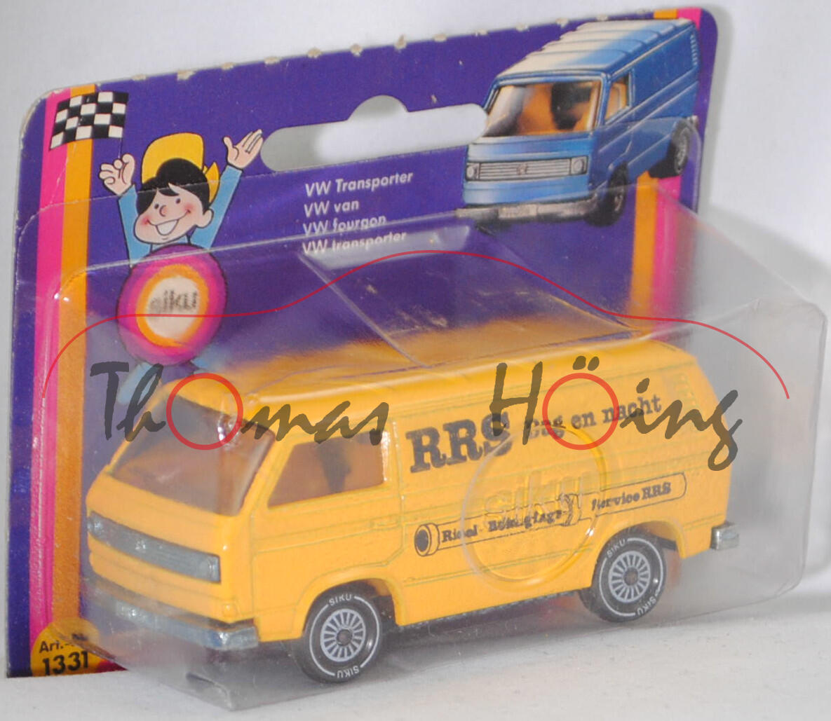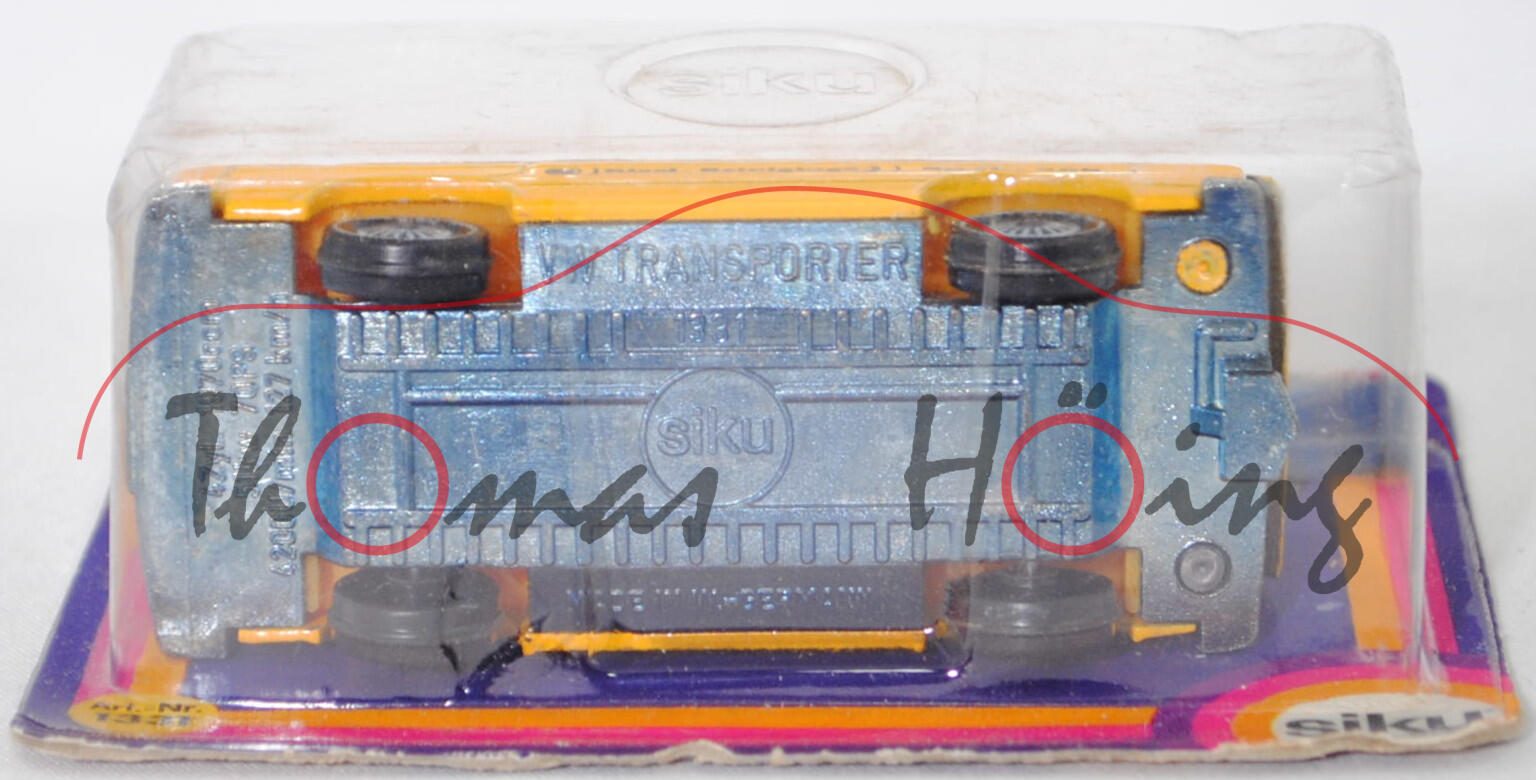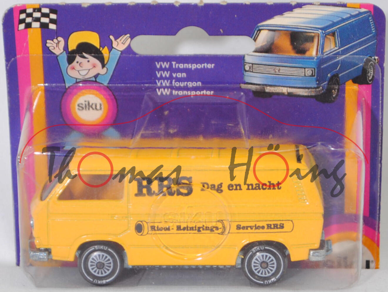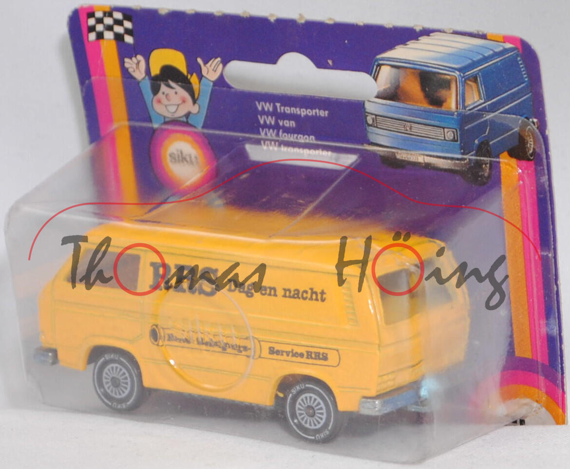VW Transporter Kastenwagen 2,0 Liter (3. Generation, Baureihe Transporter, interne Baureihenbezeichnung Typ 2 Transporter 3 (T3, Modell '80), interne Konstruktionsbezeichnung der Baureihe EA 162, oder auch Bulli genannt, Typ 251 Kastenwagen mit geschlossenem Aufbau, viertüriger Kleintransporter als Kastenwagen mit 2 Sitzplätzen, Vorfacelift, Kühlergrill nur zwischen den Scheinwerfern, Lufteinlässe hinten auf den Seiten aus Blech in Wagenfarbe lackiert, Schriftzüge auf flacher schwarzer Platte mit silbernem Schriftzug, Ausstattungslinie Kastenwagen 2,0 Liter: zwei Rückblickspiegel + Trittstufen im Fahrerhaus + zweisitziges Fahrerhaus mit Durchgang zum Laderaum + Kunstledersitzbezüge + volle Kunststoffauskleidung im Fußraum mit Kunststofffolie, Fußboden mit wärmeisolierenden Gummimatten ausgelegt + Sicherheitstürverriegelung + Kleiderhaken + Zuziehgriffe + Beifahrerhaltegriff + Ablagekasten + blendfreie und gepolsterte Abdeckung der Armaturentafel + Scheibenwischer mit Zweistufen-Schaltung + Ladeboden aus Stahl + Seitenwände innen mit Verstärkungsprofil + seitliche Schiebetür auf der rechten Seite + nach oben öffnende selbstfeststellende Heckklappe + Innenleuchte Fahrerhaus mit Türkontaktschalter + Innenleuchte Laderaum mit Schiebetürkontaktschalter + Motor mit 1970 cm³ und 70 PS, Sonderausstattung gegen Mehrpreis: Anhängevorrichtung (AHK), zulässiges Gesamtgewicht 2360 kg, vollsynchronisiertes 4-Gang-Schaltgetriebe, Heckantrieb, Motor: VW Typ-4 luftgekühlter Vierzylinder-Boxer-Viertakt-Otto mit zwei Solex Fallstromvergaser 34 PDSIT-2/-3 und eine zentrale Nockenwelle sowie 2 Ventile pro Zylinder und 1970 cm³ sowie 70 PS, Motorkennbuchstabe CU, Radstand 2460 mm, Länge 4570 mm, Modell 1979-1982), hell-signalgelb, innen dahliengelb, Sitze dahliengelb, Lenkrad integriert, Druck RRS Dag en nacht / Riool - Reinigings- Service RRS in schwarz auf den Seiten, W-Germ, Chassis chrom, ohne CE-Zeichen, Verglasung rauch, R11 glatt (VW Stahlfelgen im 20-Loch-Design Größe 5,5 J x 14 H1 ET 39 mit Lochkreis 5 x 112 (Teilenummer 211 601 027 H, chromfarbig) und Gürtelreifen 185 SR 14 sowie Radzierkappe (Ø 256 mm, Teilenummer 251 601 151 A, verchromt)), SIKU SUPER, ca. 1:60, P18 (Limited Edition) (Vitrinenmodell, Schachtel mit Lagerspuren) (EAN 4006874013319)