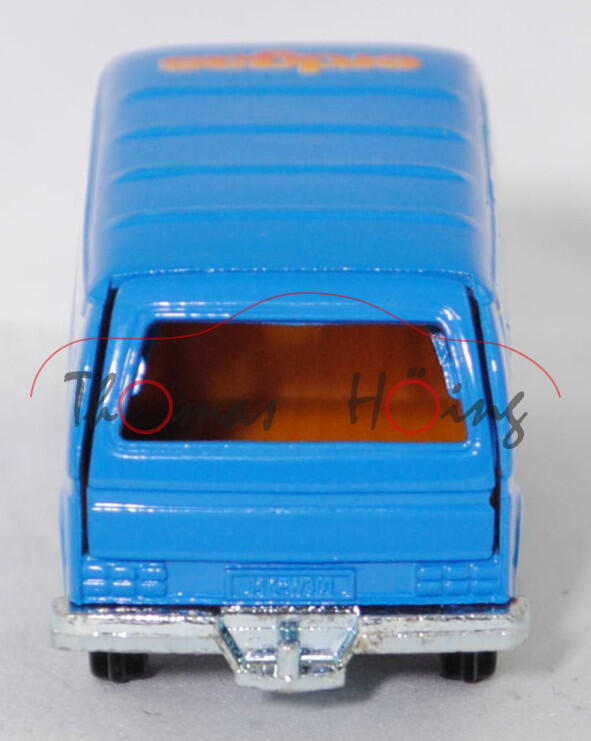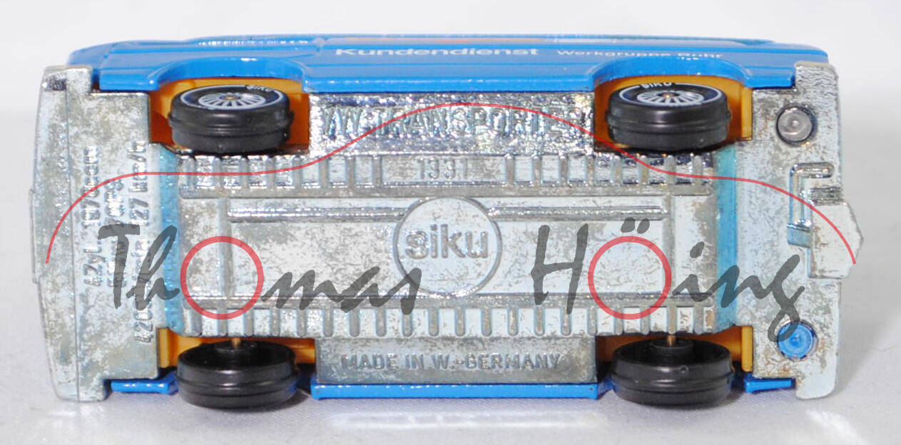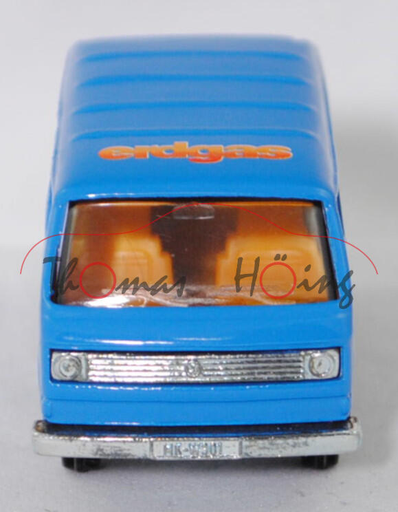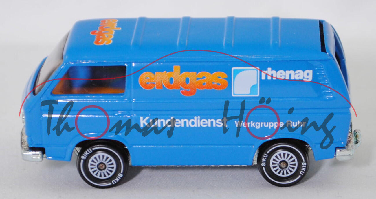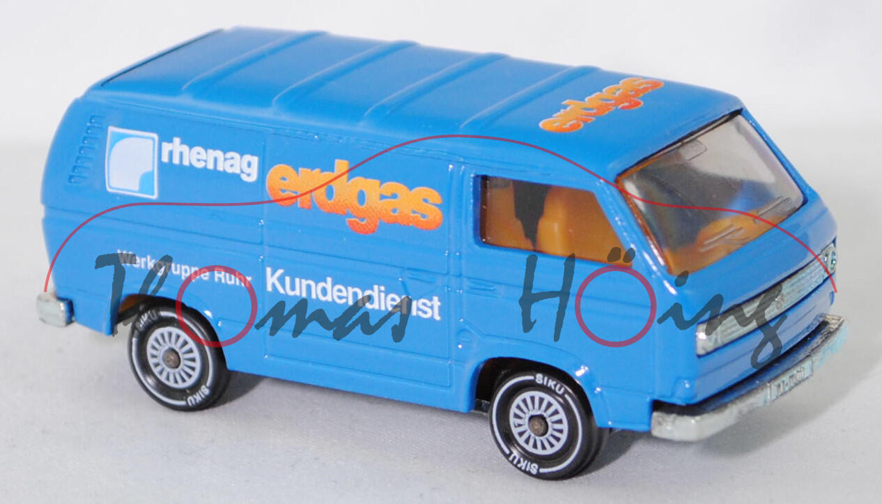 VW Transporter Kastenwagen 2,0 Liter (3. Generation, Baureihe Transporter, interne Baureihenbezeichnung Typ 2 Transporter 3 (T3, Modell '80), interne Konstruktionsbezeichnung der Baureihe EA 162, oder auch Bulli genannt, Typ 251 Kastenwagen mit geschlossenem Aufbau, viertüriger Kleintransporter als Kastenwagen mit 2 Sitzplätzen, Vorfacelift, Kühlergrill nur zwischen den Scheinwerfern, Lufteinlässe hinten auf den Seiten aus Blech in Wagenfarbe lackiert, Schriftzüge auf flacher schwarzer Platte mit silbernem Schriftzug, Ausstattungslinie Kastenwagen 2,0 Liter: zwei Rückblickspiegel + Trittstufen im Fahrerhaus + zweisitziges Fahrerhaus mit Durchgang zum Laderaum + Kunstledersitzbezüge + volle Kunststoffauskleidung im Fußraum mit Kunststofffolie, Fußboden mit wärmeisolierenden Gummimatten ausgelegt + Sicherheitstürverriegelung + Kleiderhaken + Zuziehgriffe + Beifahrerhaltegriff + Ablagekasten + blendfreie und gepolsterte Abdeckung der Armaturentafel + Scheibenwischer mit Zweistufen-Schaltung + Ladeboden aus Stahl + Seitenwände innen mit Verstärkungsprofil + seitliche Schiebetür auf der rechten Seite + nach oben öffnende selbstfeststellende Heckklappe + Innenleuchte Fahrerhaus mit Türkontaktschalter + Innenleuchte Laderaum mit Schiebetürkontaktschalter + Motor mit 1970 cm³ und 70 PS, Sonderausstattung gegen Mehrpreis: Anhängevorrichtung (AHK), zulässiges Gesamtgewicht 2360 kg, vollsynchronisiertes 4-Gang-Schaltgetriebe, Heckantrieb, Motor: VW Typ-4 luftgekühlter Vierzylinder-Boxer-Viertakt-Otto mit zwei Solex Fallstromvergaser 34 PDSIT-2/-3 und eine zentrale Nockenwelle sowie 2 Ventile pro Zylinder und 1970 cm³ sowie 70 PS, Motorkennbuchstabe CU, Radstand 2460 mm, Länge 4570 mm, Modell 1979-1982), himmelblau, innen dahliengelb, Sitze dahliengelb, Lenkrad integriert, Druck erdgas rhenag / Kundendienst Werkgruppe Ruhr in orange/reinweiß/lichtblau auf den Seiten, Druck erdgas in orange/reinweiß vorne auf dem Dach, W-Germ, Chassis chrom, mit CE-Zeichen, Verglasung rauch, R11 glatt (VW Stahlfelgen im 20-Loch-Design Größe 5,5 J x 14 H1 ET 39 mit Lochkreis 5 x 112 (Teilenummer 211 601 027 H, chromfarbig) und Gürtelreifen 185 SR 14 sowie Radzierkappe (Ø 256 mm, Teilenummer 251 601 151 A, verchromt)), SIKU SUPER, ca. 1:60, m (Limited Edition) (Vitrinenmodell) (EAN 4006874013319)
