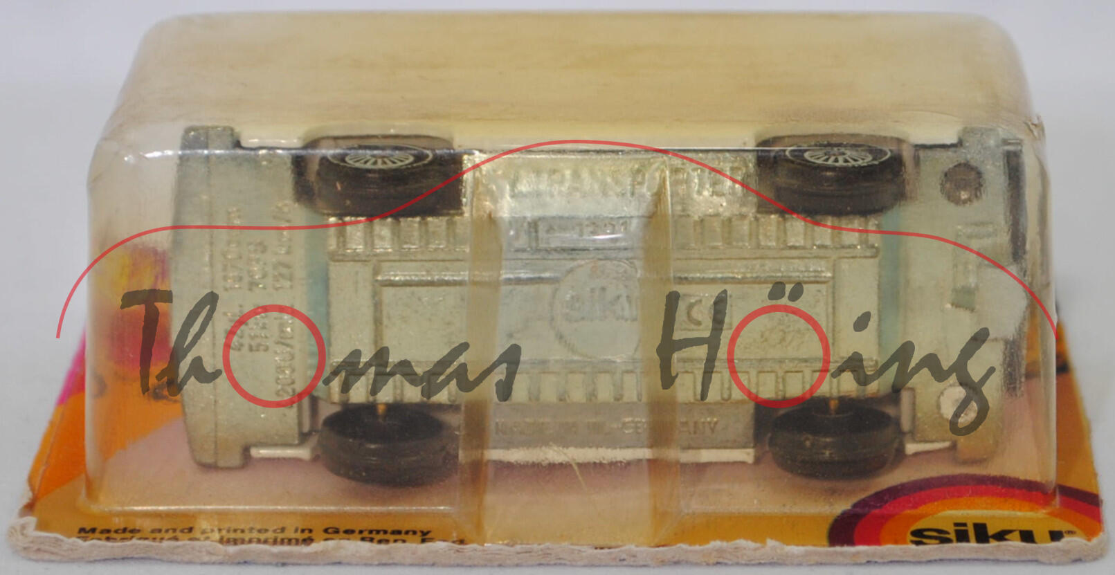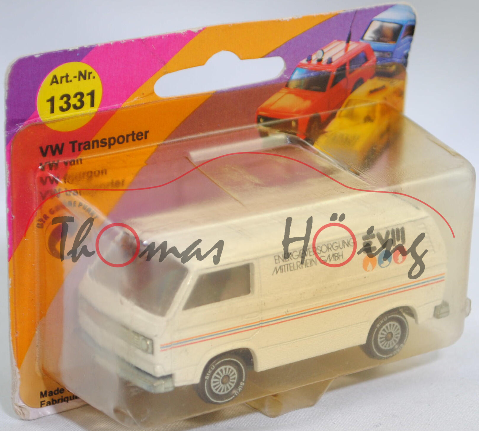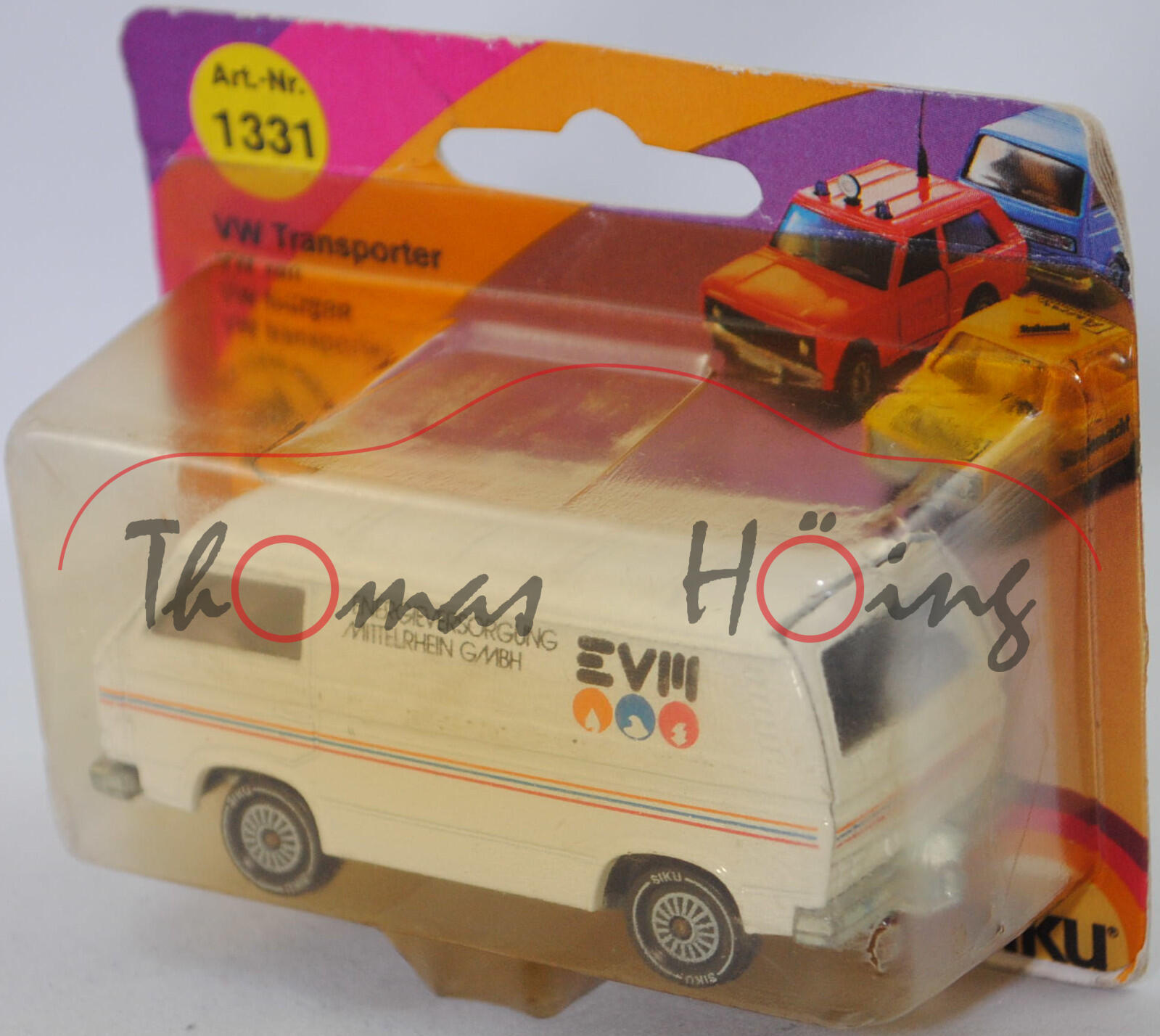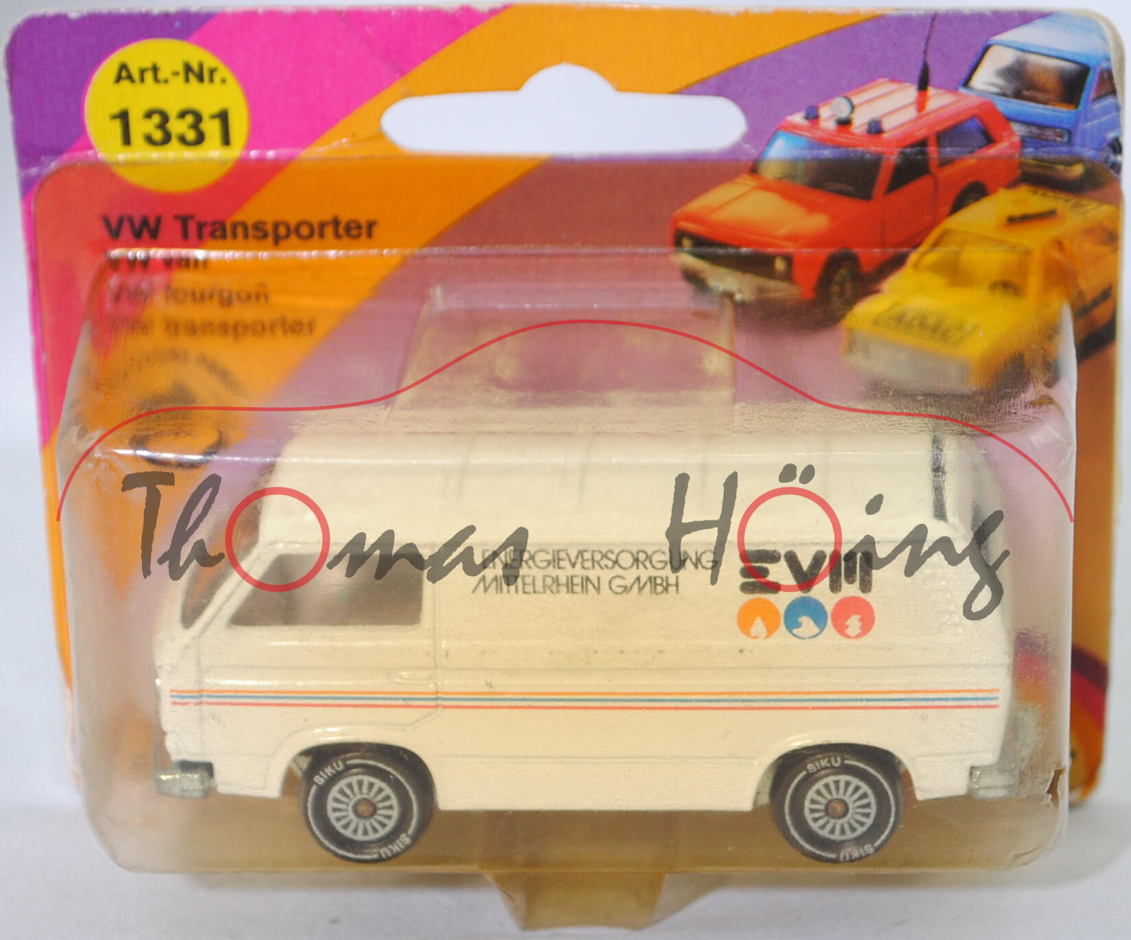 VW Transporter Kastenwagen 2,0 Liter (3. Generation, Baureihe Transporter, interne Baureihenbezeichnung Typ 2 Transporter 3 (T3, Modell '80), interne Konstruktionsbezeichnung der Baureihe EA 162, oder auch Bulli genannt, Typ 251 Kastenwagen mit geschlossenem Aufbau, viertüriger Kleintransporter als Kastenwagen mit 2 Sitzplätzen, Vorfacelift, Kühlergrill nur zwischen den Scheinwerfern, Lufteinlässe hinten auf den Seiten aus Blech in Wagenfarbe lackiert, Schriftzüge auf flacher schwarzer Platte mit silbernem Schriftzug, Ausstattungslinie Kastenwagen 2,0 Liter: zwei Rückblickspiegel + Trittstufen im Fahrerhaus + zweisitziges Fahrerhaus mit Durchgang zum Laderaum + Kunstledersitzbezüge + volle Kunststoffauskleidung im Fußraum mit Kunststofffolie, Fußboden mit wärmeisolierenden Gummimatten ausgelegt + Sicherheitstürverriegelung + Kleiderhaken + Zuziehgriffe + Beifahrerhaltegriff + Ablagekasten + blendfreie und gepolsterte Abdeckung der Armaturentafel + Scheibenwischer mit Zweistufen-Schaltung + Ladeboden aus Stahl + Seitenwände innen mit Verstärkungsprofil + seitliche Schiebetür auf der rechten Seite + nach oben öffnende selbstfeststellende Heckklappe + Innenleuchte Fahrerhaus mit Türkontaktschalter + Innenleuchte Laderaum mit Schiebetürkontaktschalter + Motor mit 1970 cm³ und 70 PS, Sonderausstattung gegen Mehrpreis: Anhängevorrichtung (AHK), zulässiges Gesamtgewicht 2360 kg, vollsynchronisiertes 4-Gang-Schaltgetriebe, Heckantrieb, Motor: VW Typ-4 luftgekühlter Vierzylinder-Boxer-Viertakt-Otto mit zwei Solex Fallstromvergaser 34 PDSIT-2/-3 und eine zentrale Nockenwelle sowie 2 Ventile pro Zylinder und 1970 cm³ sowie 70 PS, Motorkennbuchstabe CU, Radstand 2460 mm, Länge 4570 mm, Modell 1979-1982), reinweiß, innen dahliengelb, Sitze dahliengelb, Lenkrad integriert, Druck ENERGIEVERSORGUNG / MITTELRHEIN GMBH / EVM in schwarz und Logos in gelborange/verkehrsblau/rubinrot auf den Seiten, Druck Streifen in gelborange/verkehrsblau/hell-verkehrsrot auf den Seiten und auf der Heckklappe, W-Germ, Chassis chrom, mit CE-Zeichen, Verglasung rauch, R11 glatt (VW Stahlfelgen im 20-Loch-Design Größe 5,5 J x 14 H1 ET 39 mit Lochkreis 5 x 112 (Teilenummer 211 601 027 H, chromfarbig) und Gürtelreifen 185 SR 14 sowie Radzierkappe (Ø 256 mm, Teilenummer 251 601 151 A, verchromt)), SIKU SUPER, ca. 1:60, P23 (Limited Edition) (Vitrinenmodell, Schachtel vergilbt und mit Lagerspuren) (EAN 4006874013319)