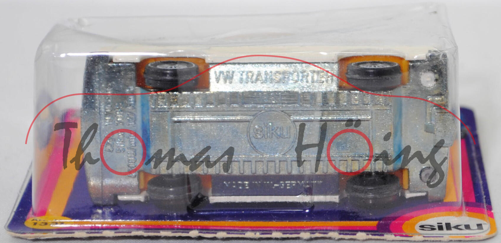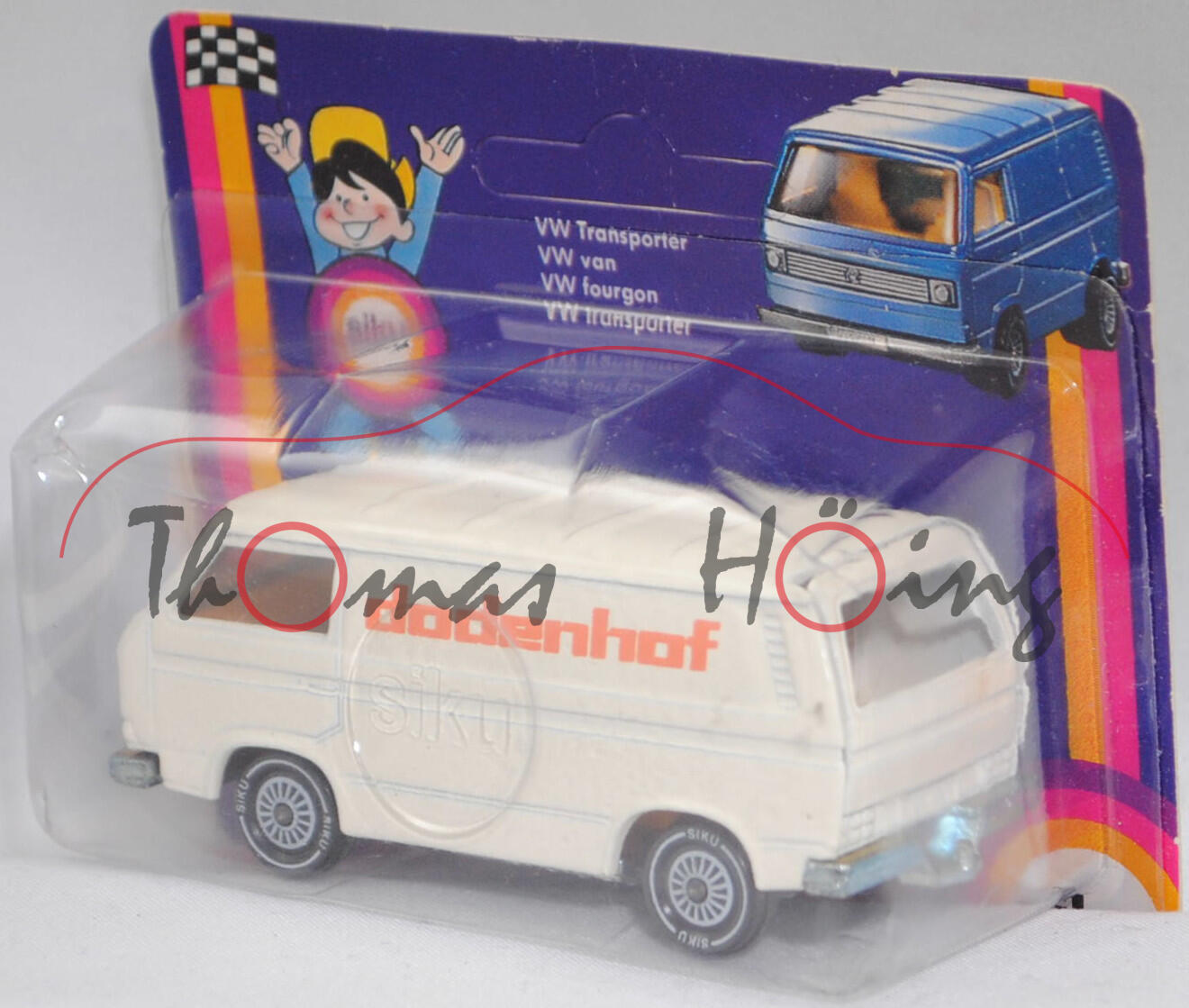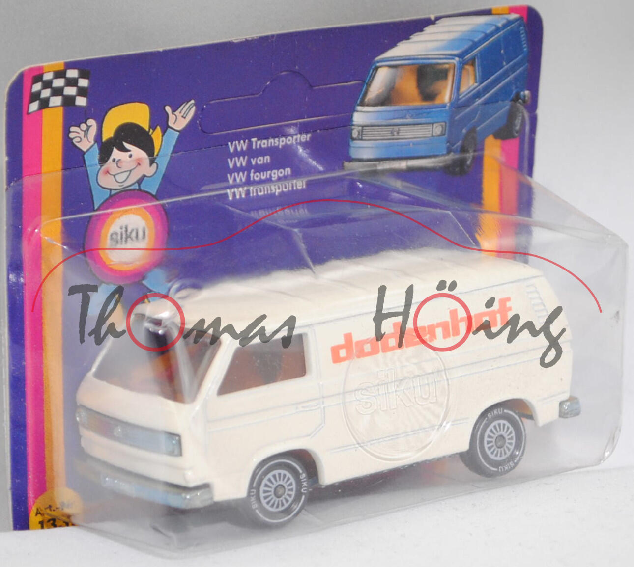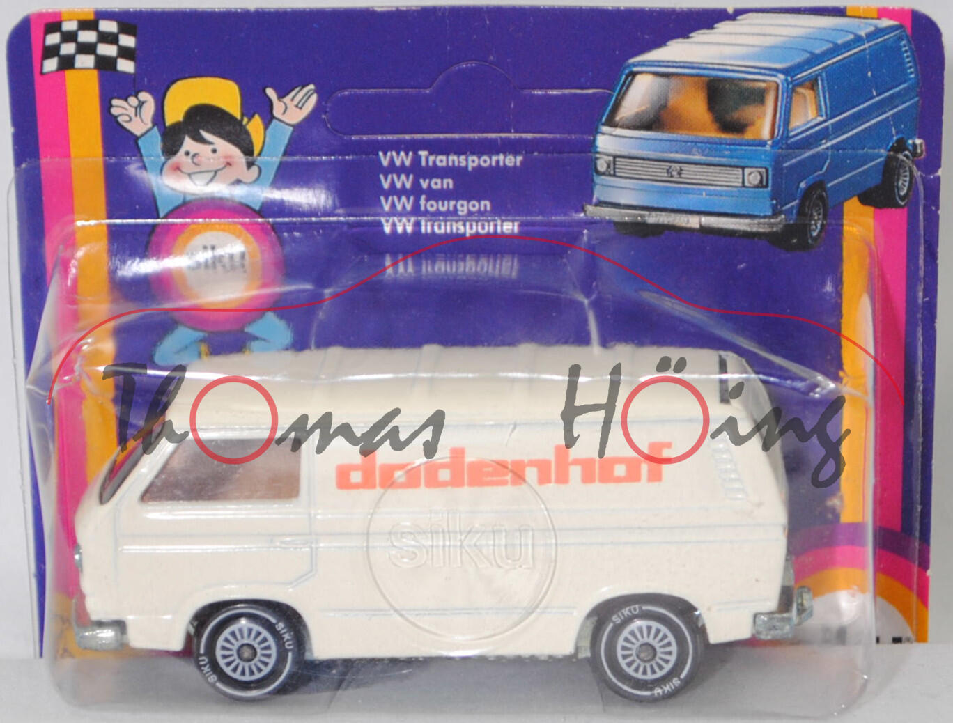 VW Transporter Kastenwagen 2,0 Liter (3. Generation, Baureihe Transporter, interne Baureihenbezeichnung Typ 2 Transporter 3 (T3, Modell '80), interne Konstruktionsbezeichnung der Baureihe EA 162, oder auch Bulli genannt, Typ 251 Kastenwagen mit geschlossenem Aufbau, viertüriger Kleintransporter als Kastenwagen mit 2 Sitzplätzen, Vorfacelift, Kühlergrill nur zwischen den Scheinwerfern, Lufteinlässe hinten auf den Seiten aus Blech in Wagenfarbe lackiert, Schriftzüge auf flacher schwarzer Platte mit silbernem Schriftzug, Ausstattungslinie Kastenwagen 2,0 Liter: zwei Rückblickspiegel + Trittstufen im Fahrerhaus + zweisitziges Fahrerhaus mit Durchgang zum Laderaum + Kunstledersitzbezüge + volle Kunststoffauskleidung im Fußraum mit Kunststofffolie, Fußboden mit wärmeisolierenden Gummimatten ausgelegt + Sicherheitstürverriegelung + Kleiderhaken + Zuziehgriffe + Beifahrerhaltegriff + Ablagekasten + blendfreie und gepolsterte Abdeckung der Armaturentafel + Scheibenwischer mit Zweistufen-Schaltung + Ladeboden aus Stahl + Seitenwände innen mit Verstärkungsprofil + seitliche Schiebetür auf der rechten Seite + nach oben öffnende selbstfeststellende Heckklappe + Innenleuchte Fahrerhaus mit Türkontaktschalter + Innenleuchte Laderaum mit Schiebetürkontaktschalter + Motor mit 1970 cm³ und 70 PS, Sonderausstattung gegen Mehrpreis: Anhängevorrichtung (AHK), zulässiges Gesamtgewicht 2360 kg, vollsynchronisiertes 4-Gang-Schaltgetriebe, Heckantrieb, Motor: VW Typ-4 luftgekühlter Vierzylinder-Boxer-Viertakt-Otto mit zwei Solex Fallstromvergaser 34 PDSIT-2/-3 und eine zentrale Nockenwelle sowie 2 Ventile pro Zylinder und 1970 cm³ sowie 70 PS, Motorkennbuchstabe CU, Radstand 2460 mm, Länge 4570 mm, Modell 1979-1982), cremeweiß, innen dahliengelb, Sitze dahliengelb, Lenkrad integriert, Druck dodenhof in hellrotorange auf den Seiten, W-Germ, Chassis chrom, ohne CE-Zeichen, Verglasung rauch, R11 glatt (VW Stahlfelgen im 20-Loch-Design Größe 5,5 J x 14 H1 ET 39 mit Lochkreis 5 x 112 (Teilenummer 211 601 027 H, chromfarbig) und Gürtelreifen 185 SR 14 sowie Radzierkappe (Ø 256 mm, Teilenummer 251 601 151 A, verchromt)), SIKU SUPER, ca. 1:60, P18 (Limited Edition) (Vitrinenmodell, Schachtel mit Lagerspuren) (EAN 4006874013319)