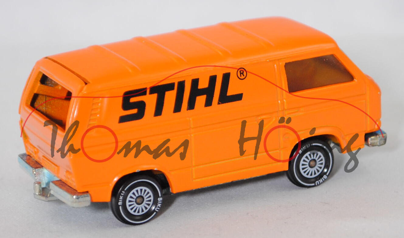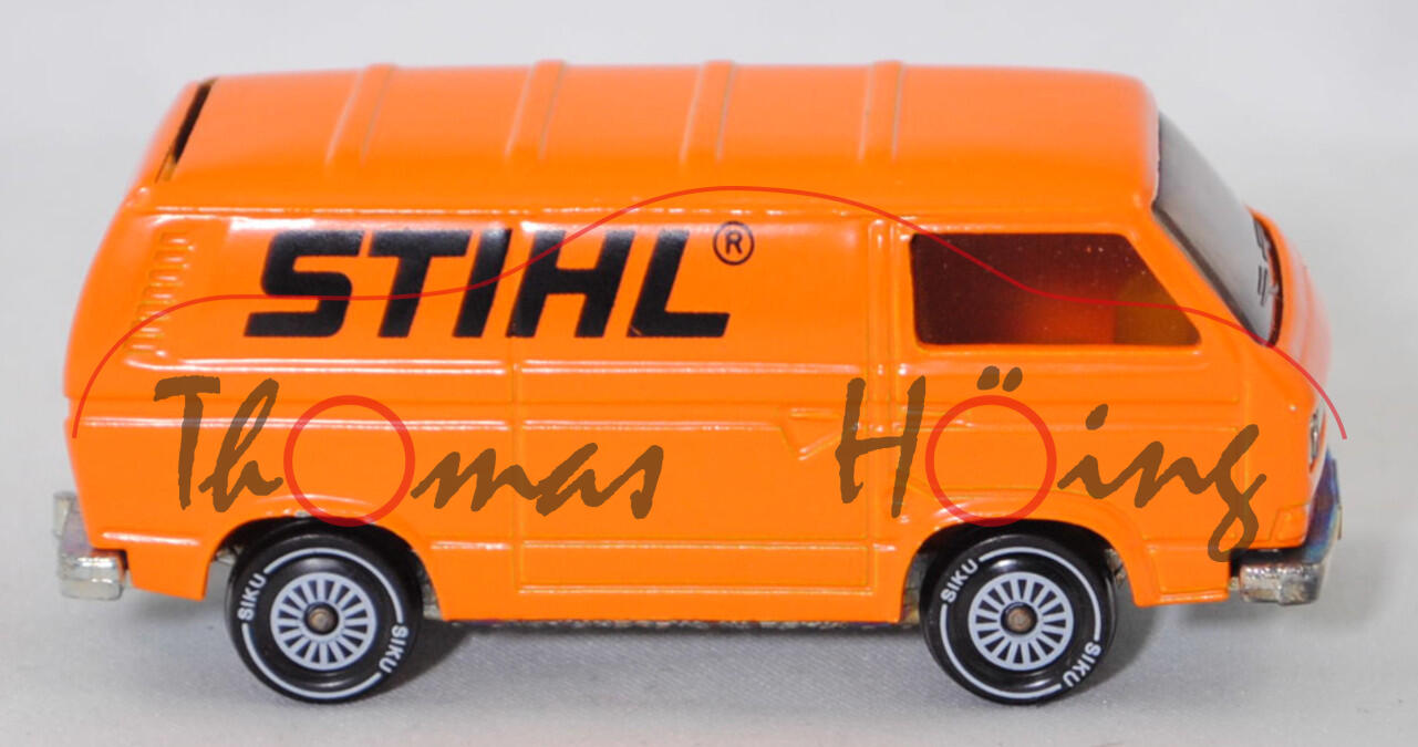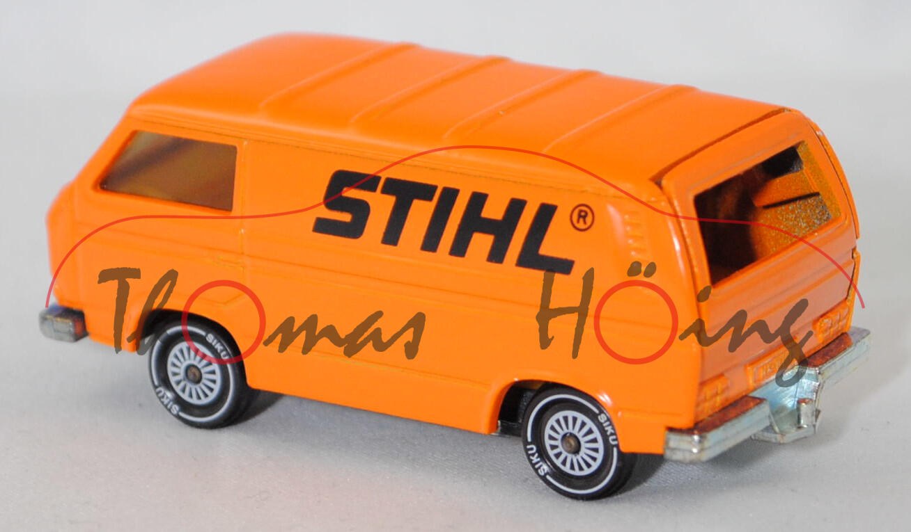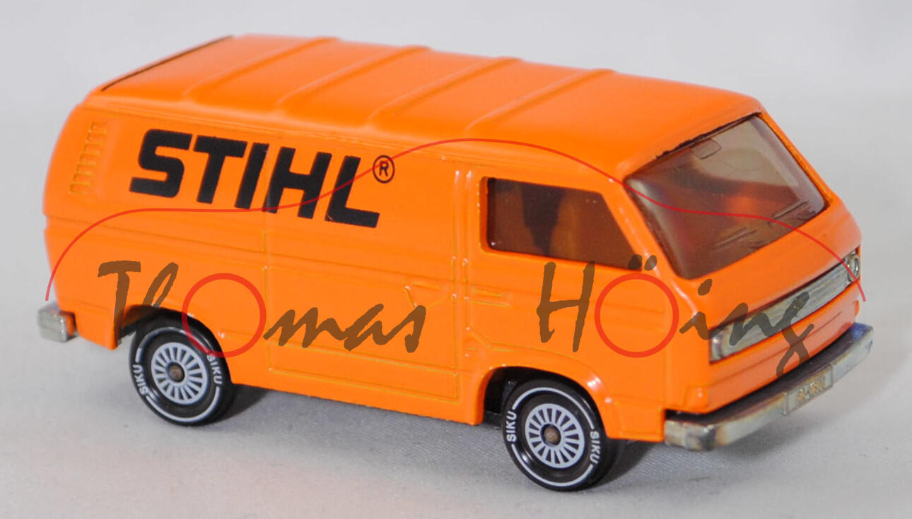 VW Transporter Kastenwagen 2,0 Liter (3. Generation, Baureihe Transporter, interne Baureihenbezeichnung Typ 2 Transporter 3 (T3, Modell '80), interne Konstruktionsbezeichnung der Baureihe EA 162, oder auch Bulli genannt, Typ 251 Kastenwagen mit geschlossenem Aufbau, viertüriger Kleintransporter als Kastenwagen mit 2 Sitzplätzen, Vorfacelift, Kühlergrill nur zwischen den Scheinwerfern, Lufteinlässe hinten auf den Seiten aus Blech in Wagenfarbe lackiert, Schriftzüge auf flacher schwarzer Platte mit silbernem Schriftzug, Ausstattungslinie Kastenwagen 2,0 Liter: zwei Rückblickspiegel + Trittstufen im Fahrerhaus + zweisitziges Fahrerhaus mit Durchgang zum Laderaum + Kunstledersitzbezüge + volle Kunststoffauskleidung im Fußraum mit Kunststofffolie, Fußboden mit wärmeisolierenden Gummimatten ausgelegt + Sicherheitstürverriegelung + Kleiderhaken + Zuziehgriffe + Beifahrerhaltegriff + Ablagekasten + blendfreie und gepolsterte Abdeckung der Armaturentafel + Scheibenwischer mit Zweistufen-Schaltung + Ladeboden aus Stahl + Seitenwände innen mit Verstärkungsprofil + seitliche Schiebetür auf der rechten Seite + nach oben öffnende selbstfeststellende Heckklappe + Innenleuchte Fahrerhaus mit Türkontaktschalter + Innenleuchte Laderaum mit Schiebetürkontaktschalter + Motor mit 1970 cm³ und 70 PS, Sonderausstattung gegen Mehrpreis: Anhängevorrichtung (AHK), zulässiges Gesamtgewicht 2360 kg, vollsynchronisiertes 4-Gang-Schaltgetriebe, Heckantrieb, Motor: VW Typ-4 luftgekühlter Vierzylinder-Boxer-Viertakt-Otto mit zwei Solex Fallstromvergaser 34 PDSIT-2/-3 und eine zentrale Nockenwelle sowie 2 Ventile pro Zylinder und 1970 cm³ sowie 70 PS, Motorkennbuchstabe CU, Radstand 2460 mm, Länge 4570 mm, Modell 1979-1982), pastellorange, innen dahliengelb, Sitze dahliengelb, Lenkrad integriert, Druck STIHL® in schwarz auf den Seiten, W-Germ, Chassis chrom, ohne CE-Zeichen, Verglasung rauch, R11 glatt (VW Stahlfelgen im 20-Loch-Design Größe 5,5 J x 14 H1 ET 39 mit Lochkreis 5 x 112 (Teilenummer 211 601 027 H, chromfarbig) und Gürtelreifen 185 SR 14 sowie Radzierkappe (Ø 256 mm, Teilenummer 251 601 151 A, verchromt)), SIKU SUPER, ca. 1:60, Werbeschachtel (Limited Edition) (Vitrinenmodell, SChachtel mit Lagerspuren) (EAN 4006874013319)