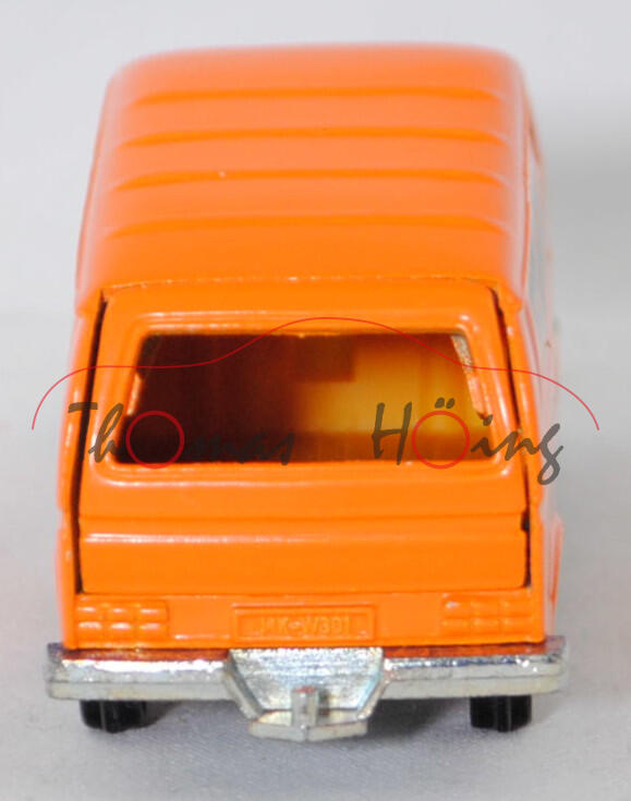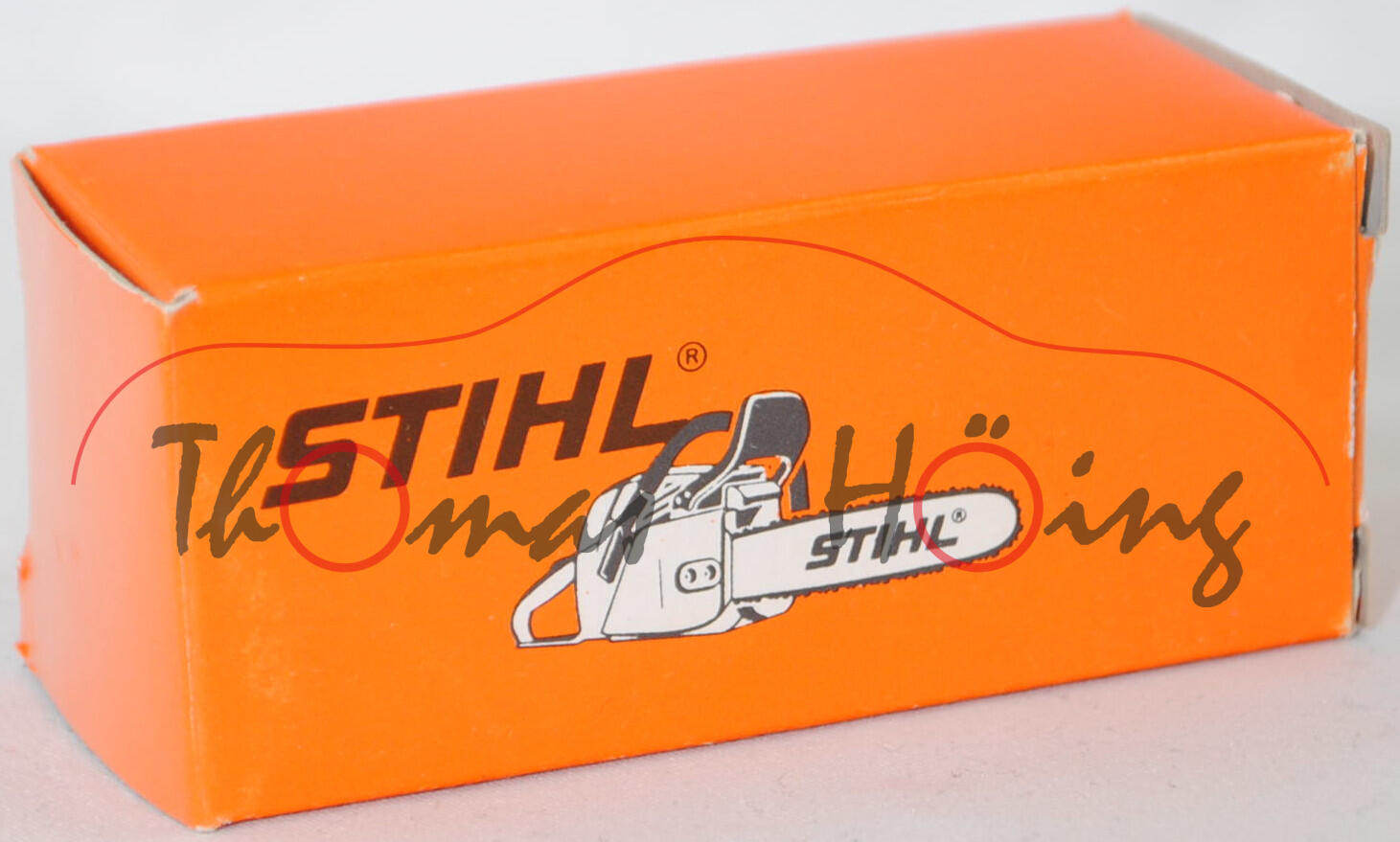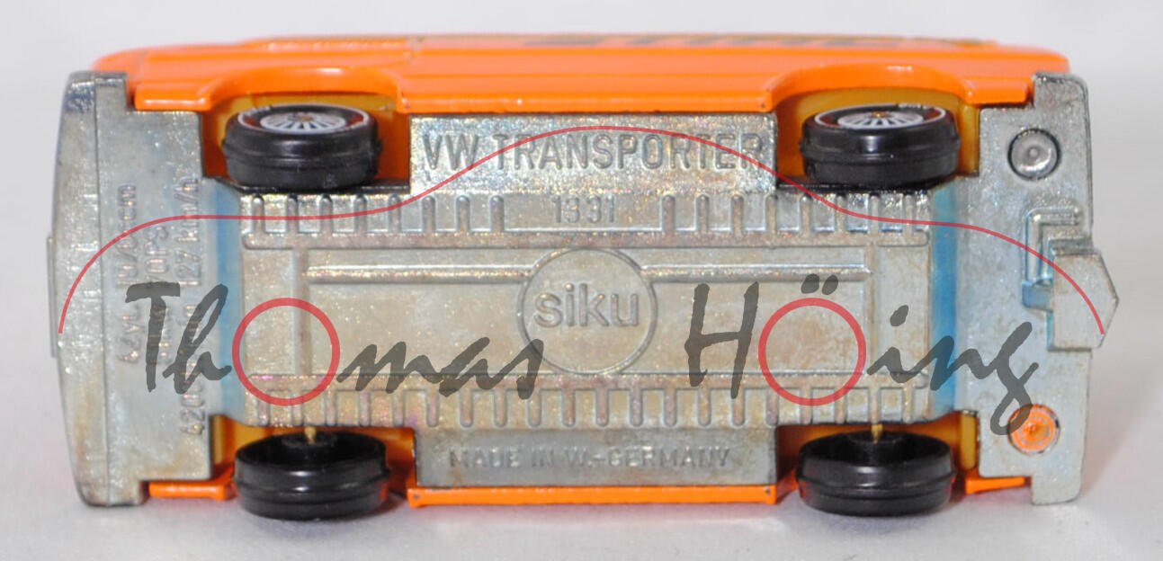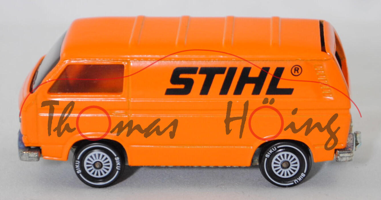 VW Transporter Kastenwagen 2,0 Liter (3. Generation, Baureihe Transporter, interne Baureihenbezeichnung Typ 2 Transporter 3 (T3, Modell '80), interne Konstruktionsbezeichnung der Baureihe EA 162, oder auch Bulli genannt, Typ 251 Kastenwagen mit geschlossenem Aufbau, viertüriger Kleintransporter als Kastenwagen mit 2 Sitzplätzen, Vorfacelift, Kühlergrill nur zwischen den Scheinwerfern, Lufteinlässe hinten auf den Seiten aus Blech in Wagenfarbe lackiert, Schriftzüge auf flacher schwarzer Platte mit silbernem Schriftzug, Ausstattungslinie Kastenwagen 2,0 Liter: zwei Rückblickspiegel + Trittstufen im Fahrerhaus + zweisitziges Fahrerhaus mit Durchgang zum Laderaum + Kunstledersitzbezüge + volle Kunststoffauskleidung im Fußraum mit Kunststofffolie, Fußboden mit wärmeisolierenden Gummimatten ausgelegt + Sicherheitstürverriegelung + Kleiderhaken + Zuziehgriffe + Beifahrerhaltegriff + Ablagekasten + blendfreie und gepolsterte Abdeckung der Armaturentafel + Scheibenwischer mit Zweistufen-Schaltung + Ladeboden aus Stahl + Seitenwände innen mit Verstärkungsprofil + seitliche Schiebetür auf der rechten Seite + nach oben öffnende selbstfeststellende Heckklappe + Innenleuchte Fahrerhaus mit Türkontaktschalter + Innenleuchte Laderaum mit Schiebetürkontaktschalter + Motor mit 1970 cm³ und 70 PS, Sonderausstattung gegen Mehrpreis: Anhängevorrichtung (AHK), zulässiges Gesamtgewicht 2360 kg, vollsynchronisiertes 4-Gang-Schaltgetriebe, Heckantrieb, Motor: VW Typ-4 luftgekühlter Vierzylinder-Boxer-Viertakt-Otto mit zwei Solex Fallstromvergaser 34 PDSIT-2/-3 und eine zentrale Nockenwelle sowie 2 Ventile pro Zylinder und 1970 cm³ sowie 70 PS, Motorkennbuchstabe CU, Radstand 2460 mm, Länge 4570 mm, Modell 1979-1982), pastellorange, innen dahliengelb, Sitze dahliengelb, Lenkrad integriert, Druck STIHL® in schwarz auf den Seiten, W-Germ, Chassis chrom, ohne CE-Zeichen, Verglasung rauch, R11 glatt (VW Stahlfelgen im 20-Loch-Design Größe 5,5 J x 14 H1 ET 39 mit Lochkreis 5 x 112 (Teilenummer 211 601 027 H, chromfarbig) und Gürtelreifen 185 SR 14 sowie Radzierkappe (Ø 256 mm, Teilenummer 251 601 151 A, verchromt)), SIKU SUPER, ca. 1:60, Werbeschachtel (Limited Edition) (Vitrinenmodell, SChachtel mit Lagerspuren) (EAN 4006874013319)
