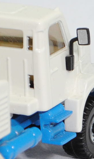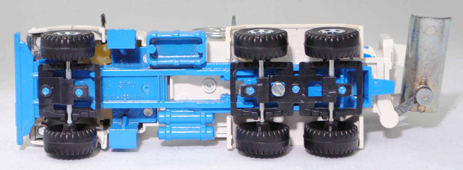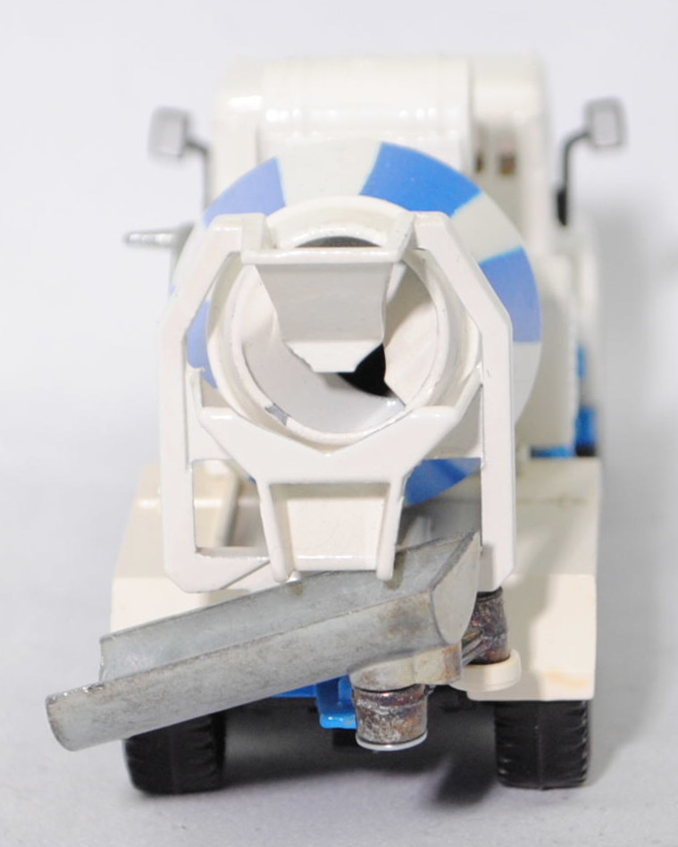 Volvo N10-38 Turbo 6 6x4 (1. Generation, Fahrerhaus: short day cab, Radstand 3800 mm + 1370 mm, Modell 1979-1983) Autotransport-Betonmischer mit Stetter Fahrmischer-Aufbau (Zweiachs-Beton-Fahrmischer mit 3,5 cbm Trommel, Aufbauhersteller: Stetter GmbH, Memmingen), Fahrerhaus und Motorhaube cremeweiß, innen cremeweiß, Sitze cremeweiß, Lenkrad cremeweiß, Kühlergrill schwarz mit Druck 10 / Turbo 6 und Rahmen in reinweiß, Doppel-Metall-Frontscheinwerfer, Luftansaugstutzen hinten rechts an der Rückwand des Fahrerhauses weg, Motor an der Mischtrommel cremeweiß, Handrad chrom, Mischtrommel und Einfülltrichter cremeweiß, Druck Streifen in himmelblau auf der Mischtrommel, Betonrutsche chrom, Stoßstange himmelblau, Stoßstange von unten geschlossen, Stufen zum Fahrerhaus himmelblau, Kotflügel vorne und hinten cremeweiß, Chassis mit Anhängerkupplung (AHK) himmelblau, Verglasung rauch, Volvo10, SIKU SUPER, ca. 1:55 (Fahrerhaus) / 1:58 (Aufbau), m (Limited Edition) (Vitrinenmodell, Luftansaugstutzen weg) (EAN 4006874028177)
