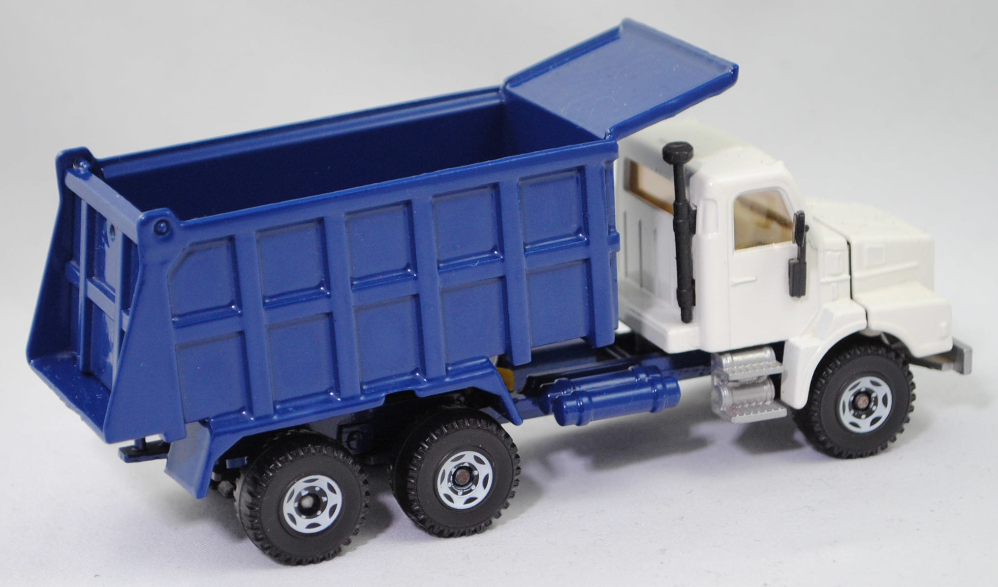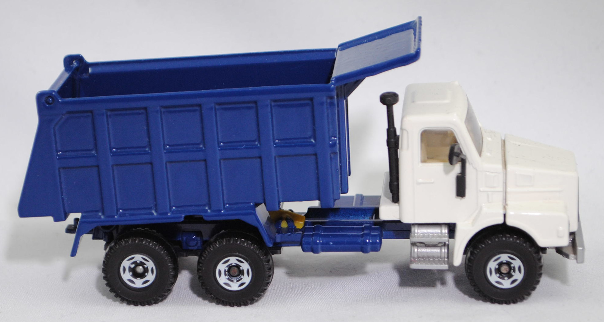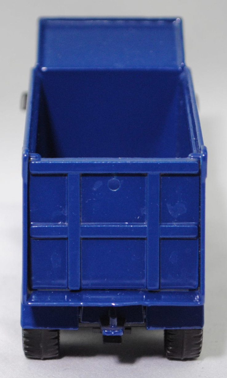 Volvo N12-38 INTERCOOLER 6x4 (2. Generation, Fahrerhaus: short day cab, Radstand 3800 mm + 1370 mm, Modell 1985-1989) Muldenkipper mit Fahrerhausschutzschild (Aufbau Typ: Hinterkipper als Sandkipper mit Leitblech und Heckklappe, Hersteller: Franz Xaver MEILLER Fahrzeug- und Maschinenfabrik GmbH & Co. KG, Landshuter Allee 20 8000 München 19), Fahrerhaus und Motorhaube cremeweiß, innen cremeweiß, Sitze cremeweiß, Lenkrad cremeweiß, Kühlergrill schwarz mit Druck VOLVO / N12 / INTERCOOLER und Rahmen in reinweiß, Frontscheinwerfer rechteckig, Mulde mit Heckklappe saphirblau, mit Loch in der Heckklappe, Stoßstange silbergraumetallic, Stoßstange von unten geschlossen, Stufen zum Fahrerhaus silbergraumetallic, Chassis mit Anhängerkupplung (AHK) saphirblau, Verglasung rauch, Volvo10, SIKU SUPER, ca. 1:55 (Fahrerhaus) / 1:58 (Aufbau), m (Limited Edition) (Vitrinenmodell) (EAN 4006874025145)