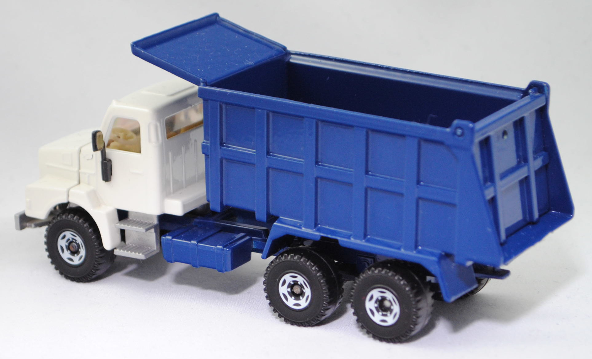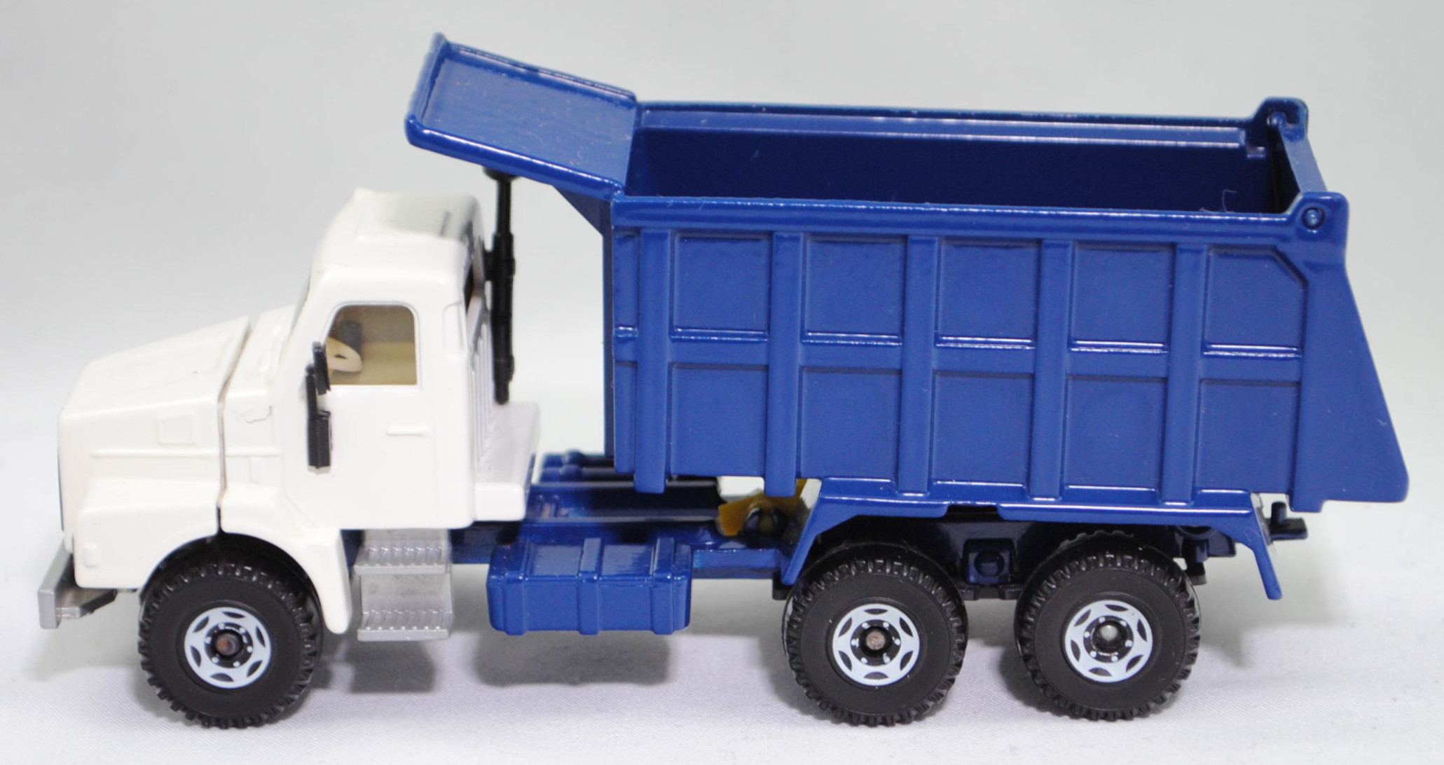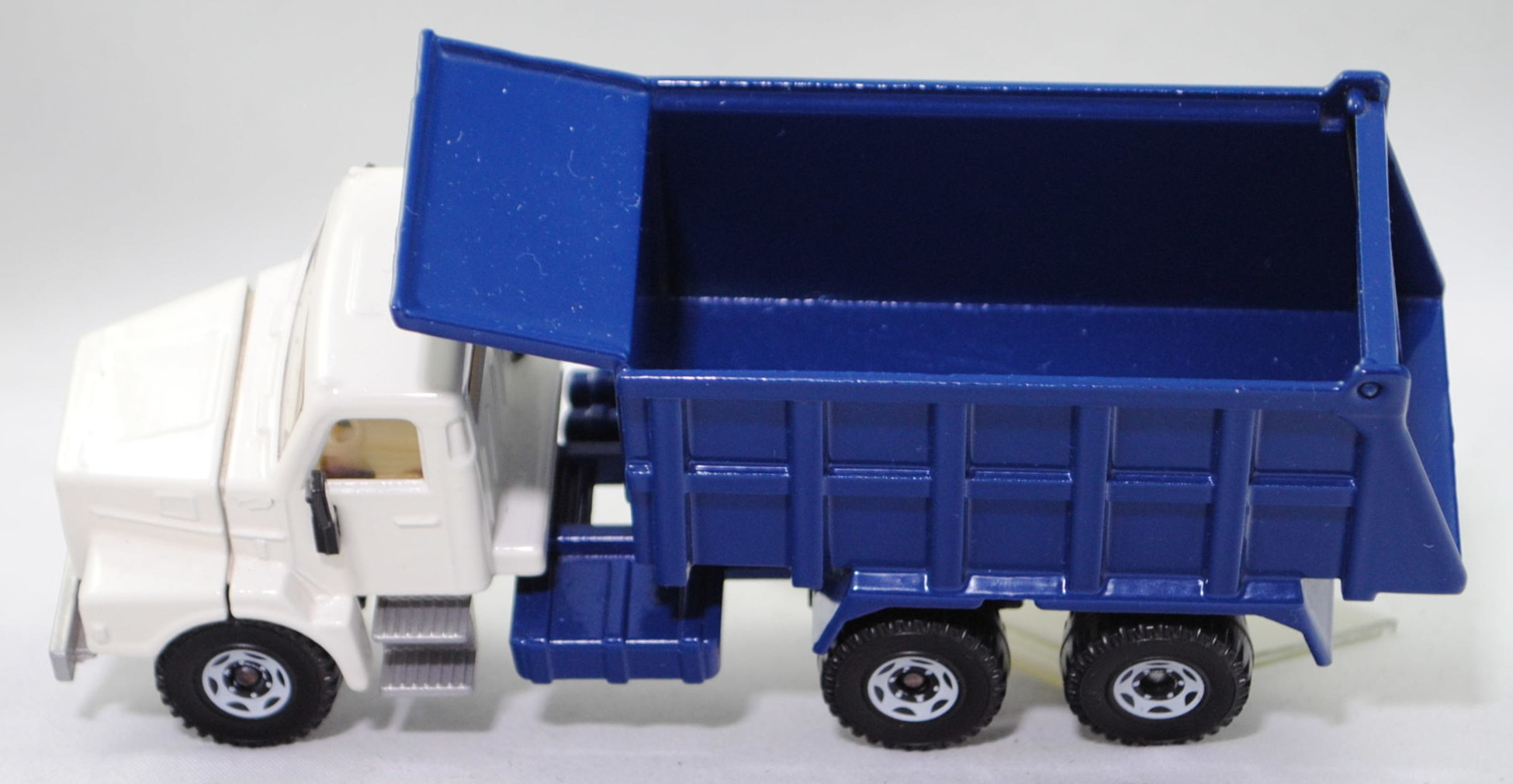 Volvo N12-38 INTERCOOLER 6x4 (2. Generation, Fahrerhaus: short day cab, Radstand 3800 mm + 1370 mm, Modell 1985-1989) Muldenkipper mit Fahrerhausschutzschild (Aufbau Typ: Hinterkipper als Sandkipper mit Leitblech und Heckklappe, Hersteller: Franz Xaver MEILLER Fahrzeug- und Maschinenfabrik GmbH & Co. KG, Landshuter Allee 20 8000 München 19), Fahrerhaus und Motorhaube cremeweiß, innen cremeweiß, Sitze cremeweiß, Lenkrad cremeweiß, Kühlergrill schwarz mit Druck VOLVO / N12 / INTERCOOLER und Rahmen in reinweiß, Frontscheinwerfer rechteckig, Mulde mit Heckklappe saphirblau, mit Loch in der Heckklappe, Stoßstange silbergraumetallic, Stoßstange von unten geschlossen, Stufen zum Fahrerhaus silbergraumetallic, Chassis mit Anhängerkupplung (AHK) saphirblau, Verglasung rauch, Volvo10, SIKU SUPER, ca. 1:55 (Fahrerhaus) / 1:58 (Aufbau), m (Limited Edition) (Vitrinenmodell) (EAN 4006874025145)