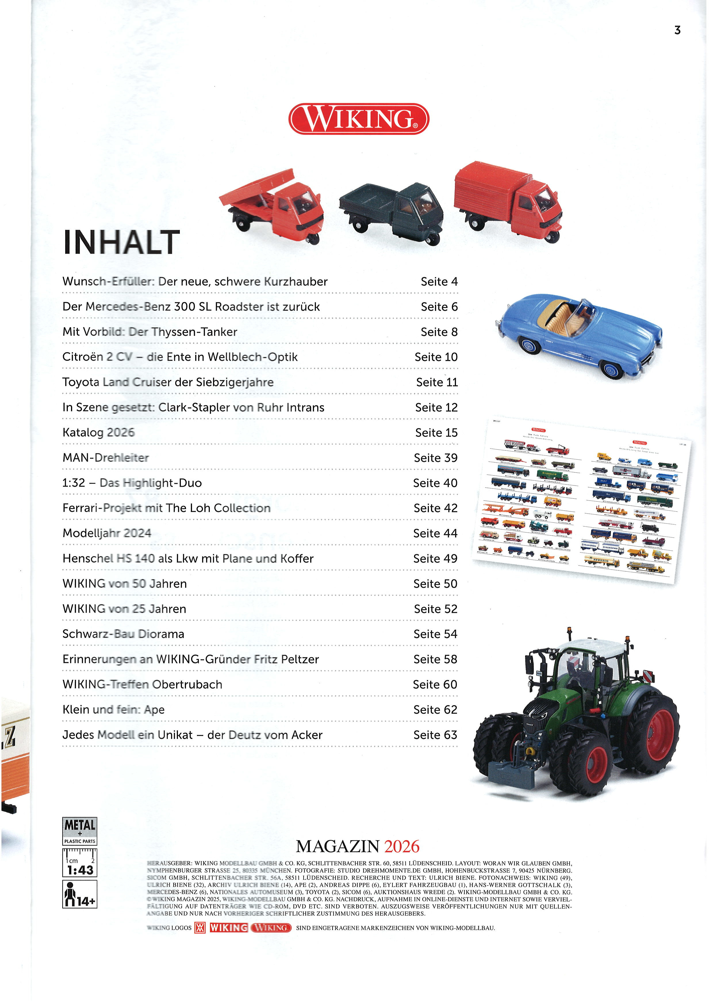 WIKING MAGAZIN 2026, Inhalt: Wunsch-Erfüller: Der neue, schwere Kurzhauber / Der Mercedes-Benz 300 SL Roadster ist zurück / Mit Vorbild: Der Thyssen-Tanker / Citroen 2 CV - die Ente in Wellblech-Optik / Toyota Land Cruiser der Siebzigerjahre / In Szene gesetzt: Clark-Stapler von Ruhr Intrans / Katalog 2026 / MAN-Drehleiter / 1:32 - Das Highlight-Duo / Ferrari-Projekt mit The Loh Collection / Modelljahr 2024 / Henschel HS 140 als LKW mit Plane und Koffer / WIKING vor 50 Jahren / WIKING von 25 Jahren / Schwarz-Bau Diorama / Erinnerungen an WIKING-Gründer Fritz Peltzer / WIKING-Treffen Obertrubach / Klein und fein: Ape / Jedes Modell ein Unikat - der Deutz vom Acker, DIN-A4, 64 Seiten, Wiking (EAN 4006190006323)