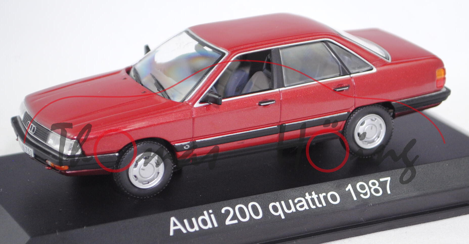 830075 Audi 200 quattro (Baureihe C3, Typ 44, Vorfacelift, hervorstehende Türgriffe, Armaturenbrett mit eckigem Instrumentenaufsatz, Heckklappe mit Schloss in der Rückleuchte und mittig angebrachten Audi-Ringen sowie Schriftzüge im neues Design (gab es nur 1987), Motor: Fünfzylinder-Reihen-Turbo-Viertakt-Otto mit 2144 cm³ und 182 PS oder 2226 cm³ und 165 PS mit Abgasreinigung, Radstand 2687 mm, Länge 4807 mm, Modell 1987-1987, Baujahr 1987), tizianrot metallic (Lacknummer LB3V, Verkaufskennzeichen W4), innen fehgrau/steingrau, Sitze fehgrau mit Sitzflächen in steingrau, Lenkrad fehgrau, Außenspiegel links locker, Leichtmetallräder Größe 6 J x 15 Lochkreis 5 yx 112 mit Reifen 205/60 VR 15, Norev, 1:43, PC-Box (Vitrinenmodell, Schachtel mit Lagerspuren) (EAN 3551098300758)
